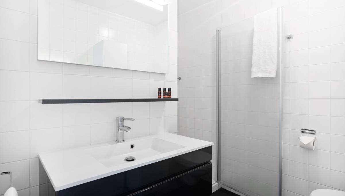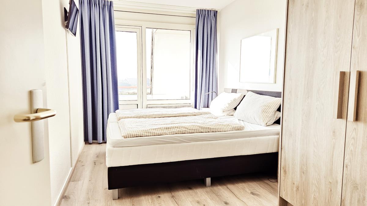 Die beiden Schlafzimmer sind über den Flur erreichbar und bieten pure Entspannung. Das erste verfügt über ein großzügiges Doppelbett, einen Fernseher und eine große Glastür zum Balkon, während das zweite Schlafzimmer ein Einzelbett und ein Etagenbett bietet. Das moderne Badezimmer ist mit einer Duschkabine und einem Waschbecken ausgestattet, während es auch ein separates WC gibt.
