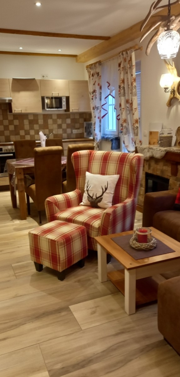 Wohn-Essbereich: Entspannen Sie im gemütlichen Ohrensessel oder auf dem komfortablen Ausziehsofa mit Ottomane vor dem 50-Zoll Smart-TV. Ein rustikaler Elektrokamin sorgt für die perfekte Hüttenstimmung an langen Abenden. Gourmet-Ecke: Die moderne, voll ausgestattete Küchenzeile fügt sich harmonisch in den Landhausstil ein und bietet am massiven Esstisch Platz für vier Personen.
