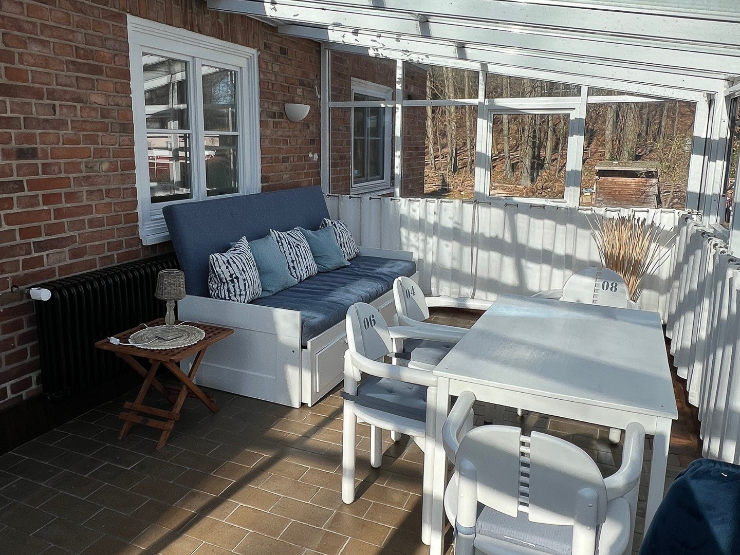 Die sehr helle Maisonette-Ferienwohnung, in einer weißen Villa direkt am Buchenberg gelegen, ist gemütlich und rustikal eingerichtet . Eine Wohnküche bietet alle modernen Küchengeräte, wie z. B. Geschirrspüler, Herd mit Backofen, Mikrowelle, Kühlschrank mit Gefrierteil, Kaffeemaschine, Toaster und Wasserkocher sowie einen gemütlichen Esstisch. Weiterhin sind ein Fernseher, Radio sowie CD- und DVD-Spieler und eine Schlafcouch vorhanden. Der Wohnbereich wird durch einen wunderschön geräumigen Wintergarten erweitert. Im ersten Schlafzimmer steht ein Doppelbett und im 2. befinden sich 3 Einzelbetten . Die Schlafräume sind über eine Treppe im Wohnzimmer zu erreichen. Das Bad hat eine Dusche und im Waschhaus steht eine Waschmaschine zur Verfügung. Für behagliche Wärme sorgt eine Zentralheizung. Die ganze Wohnung ist im maritimen Flair eingerichtet. Auf dem weitläufigen Grundstück befindet sich ein Grillplatz mit Gartenmöbeln. Das Auto steht direkt neben dem Haus auf dem Grundstück. Der Wohnungszugang erfolgt über eine gewendelte Aussentreppe.