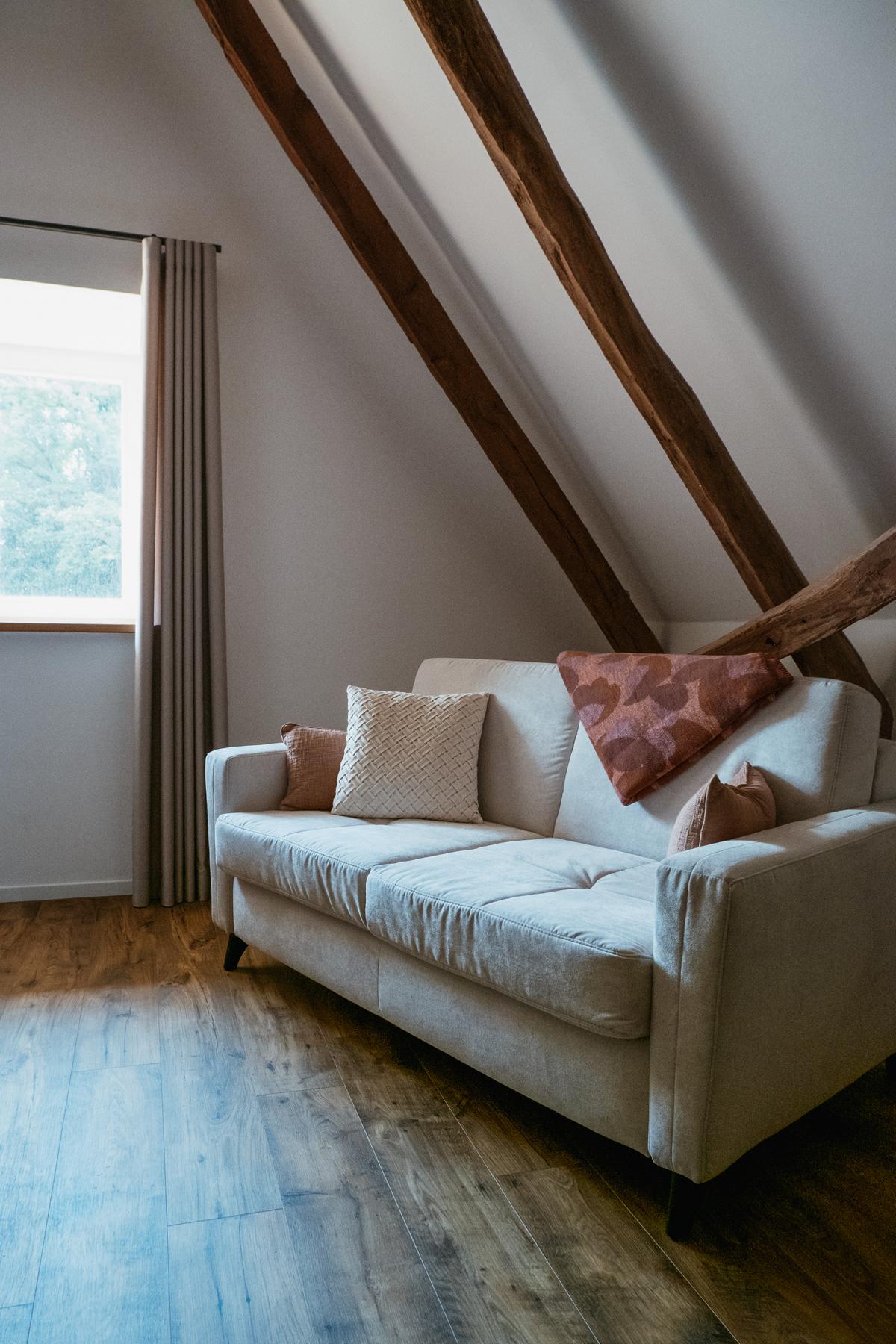 Im Erdgeschoss befinden sich das Wohnzimmer, die Küche, das Badezimmer sowie ein Schlafzimmer. Über eine Treppe gelangen Sie ins Obergeschoss mit einem weiteren Schlafzimmer. Eine großzügige Terrasse mit kleinem Gartenanteil lädt zum Entspannen im Freien ein.