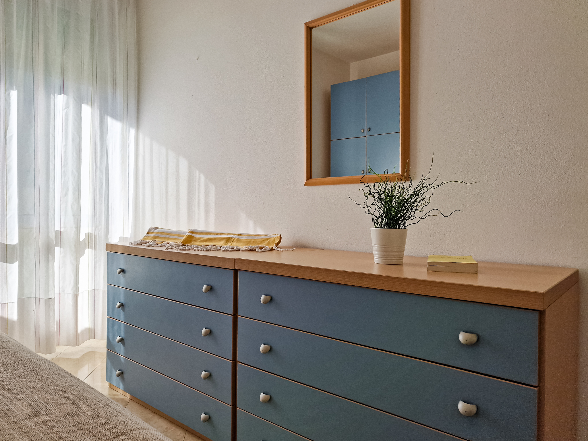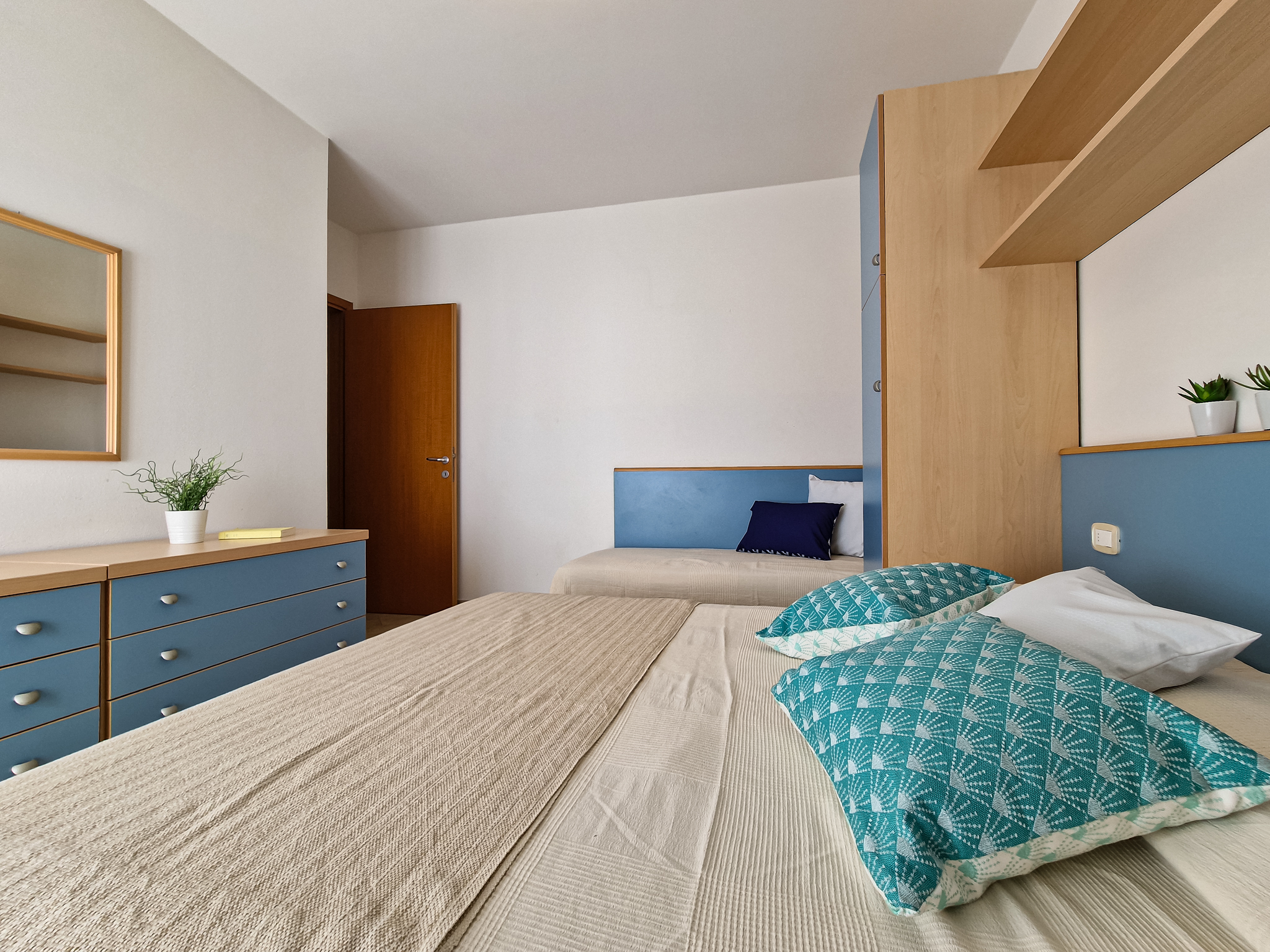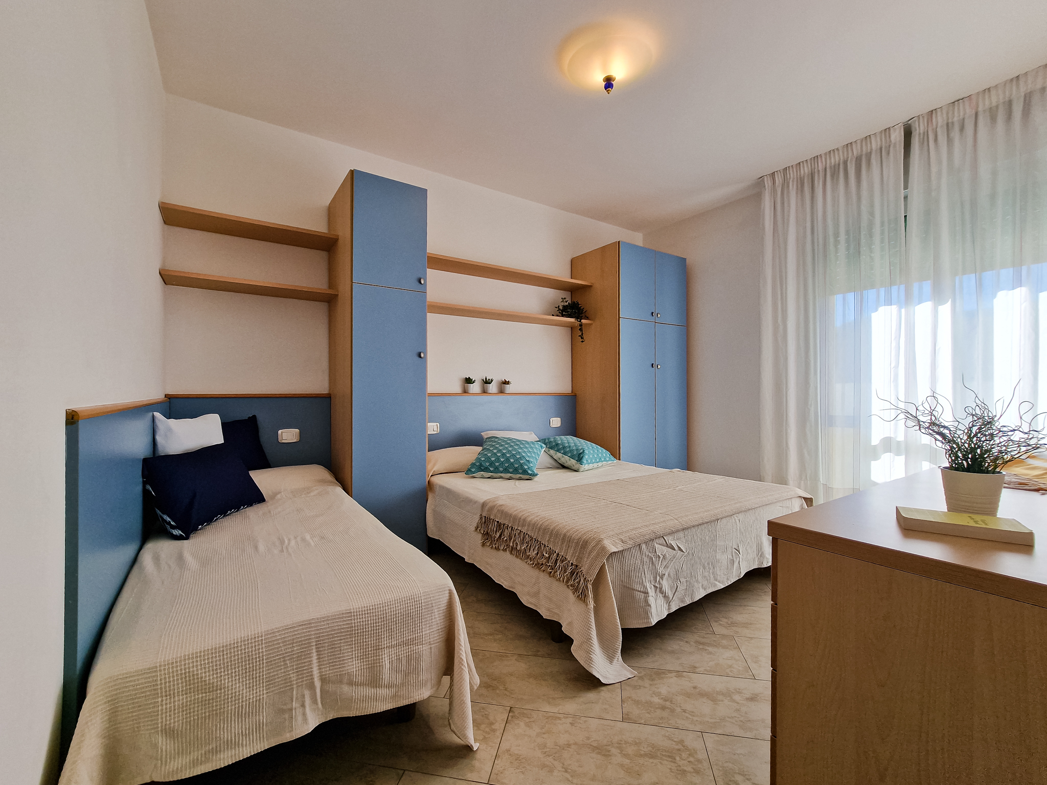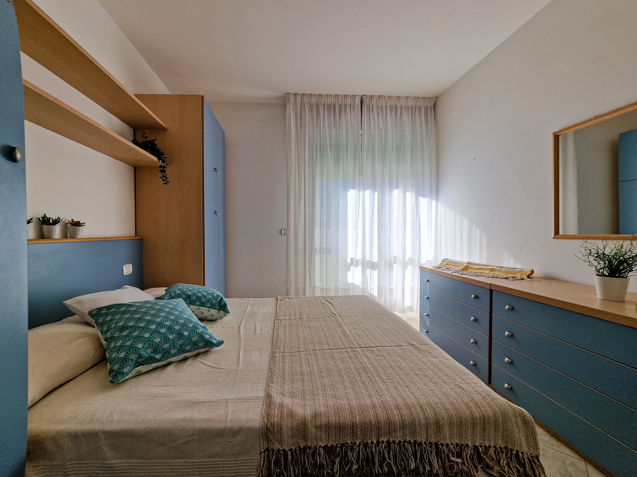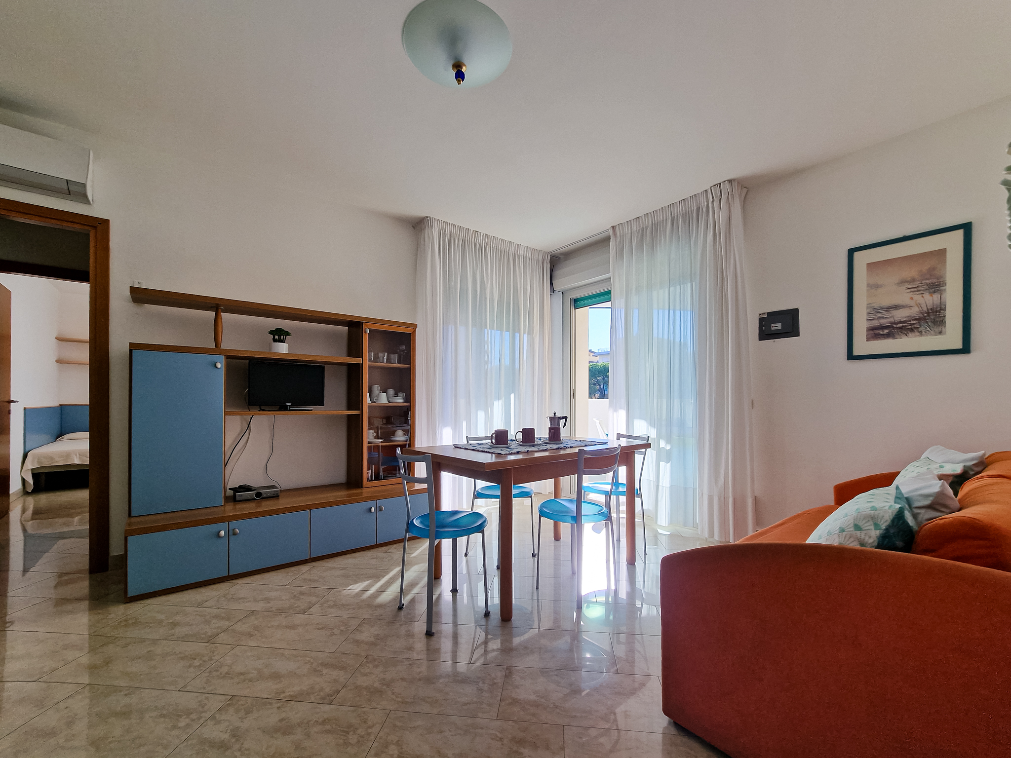 Die Zweizimmer-Wohnung Tipo B befindet sich im ersten oder zweiten Stockwerk und bietet Platz für max. 5 Personen (eine Überbelegung mit einem Baby im Reisebett ist auf Anfrage möglich). Die Unterkunft besteht aus einem Schlafzimmer mit einem Ehebett und einem Einzelbett. Zwei weitere Schlafplätze bietet das Schlafsofa im Wohnzimmer. Im Wohnzimmer befindet sich ausserdem die gut eingerichtete Küche mit Geschirr, Besteck, Töpfen, einer Mikrowelle, einem Kühlschrank mit Eisfach und einem Gasherd. Das Badezimmer verfügt über ein WC, eine Dusche und ein Waschbecken. Wenn die Kinder am Abend im Bett sind, lädt der halbüberdachte Balkon zum gemütlichen Entspannen mit einem Glas Wein ein. Die Wohnung verfügt ausserdem über eine eigene Waschmaschine. Die Fahrzeit ab italienischer Grenze beträgt ca. 4h. Hinweis: Wenn Sie mehr als eine Unterkunft benötigen, ist dies bei uns in der Regel möglich, da wir über mehrere Objekte des gleichen Haustyps verfügen.