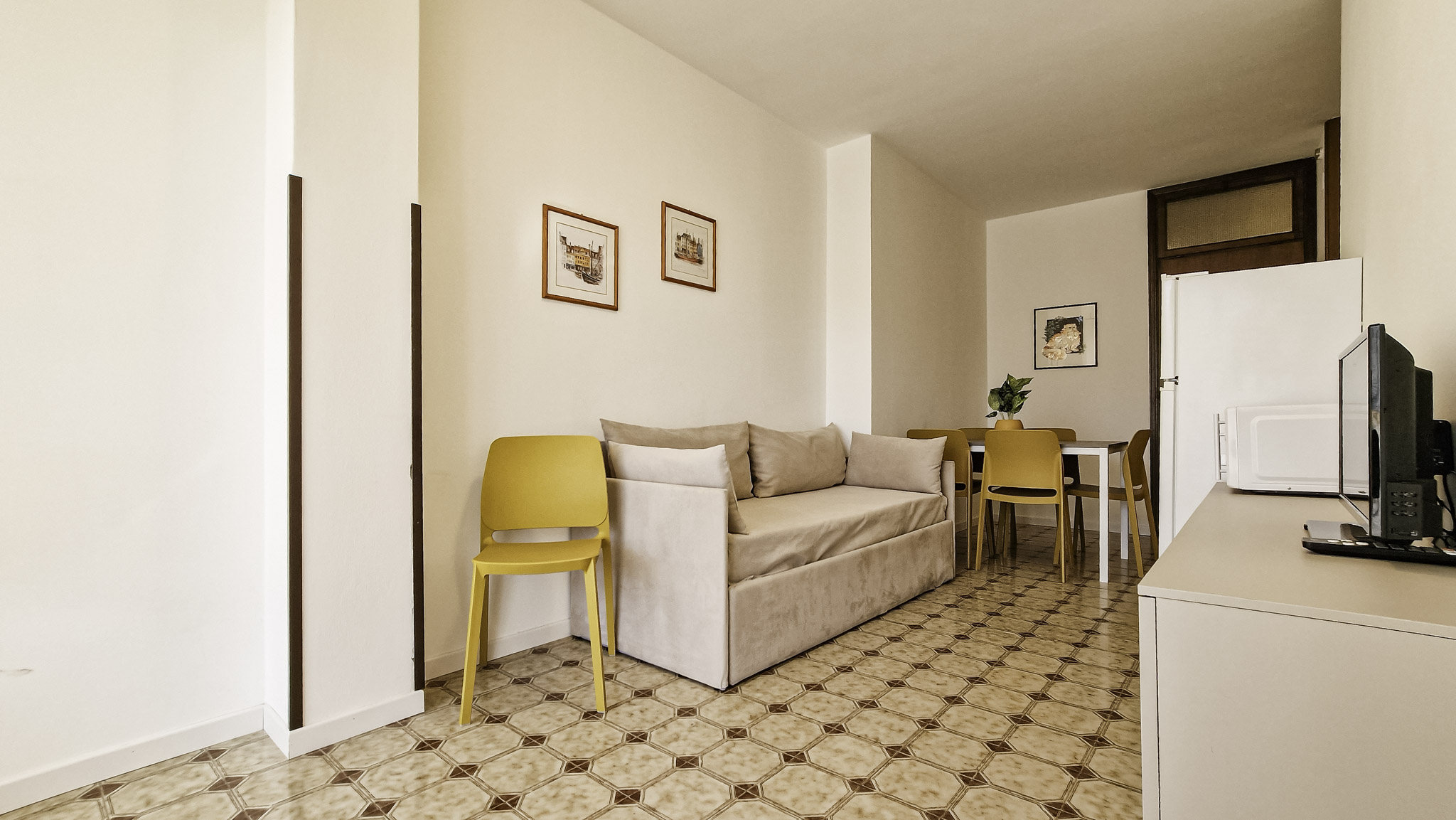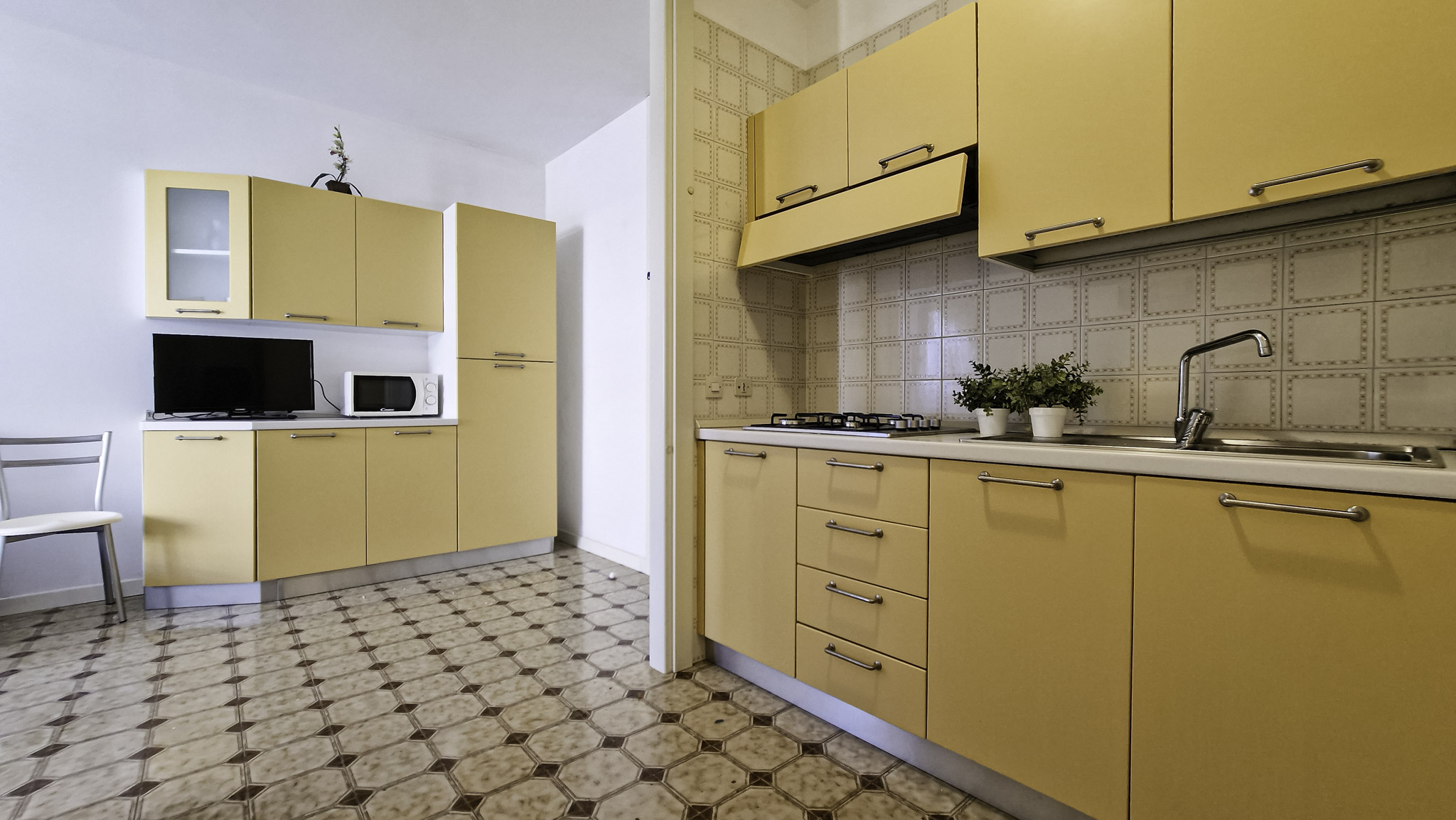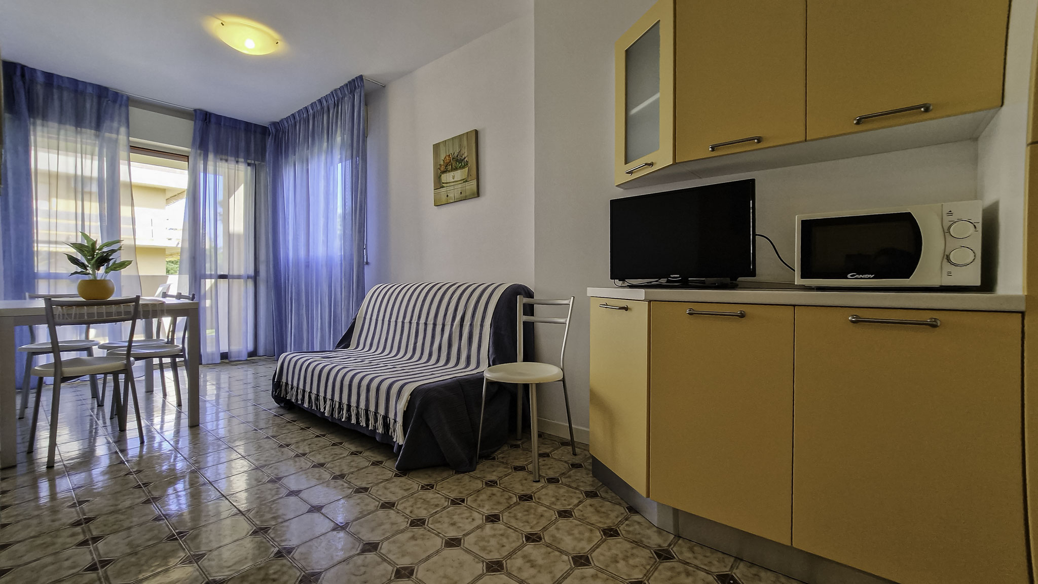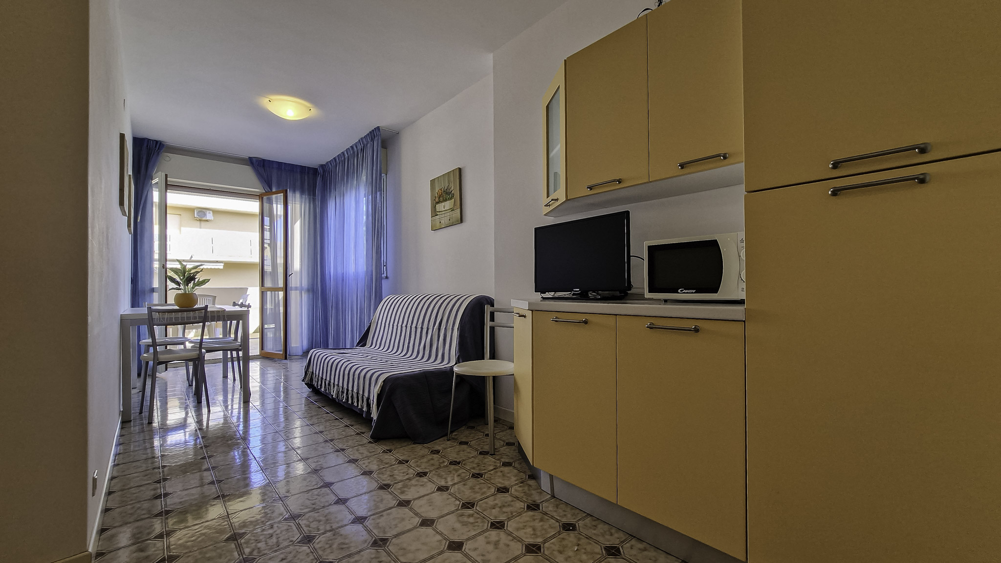 Die Dreizimmer-Wohnung C befindet sich entweder im 2. oder 3. Obergeschoss und bietet Platz für max. 6 Personen. Die Unterkunft besteht aus einem Schlafzimmer mit Doppelbett und einem weiteren Schlafzimmer mit einem Etagenbett für 2 Personen. Zwei weitere Schlafplätze bietet bei Bedarf das Schlafsofa im Wohnzimmer. Im Wohnzimmer befindet sich ausserdem die gut eingerichtete Küche mit Geschirr, Besteck, Töpfen, einer Mikrowelle, einem Kühlschrank und einem Gasherd. Tisch, Stühle und ein SAT-TV sind vorhanden. Das Badezimmer verfügt über ein WC, eine Dusche und ein Waschbecken. Die Terrasse lädt zum Entspannen ein. Ein überdachter Parkplatz und eine Klimaanlage sind ebenfalls vorhanden. Die Fahrzeit ab italienischer Grenze beträgt ca. 4h.