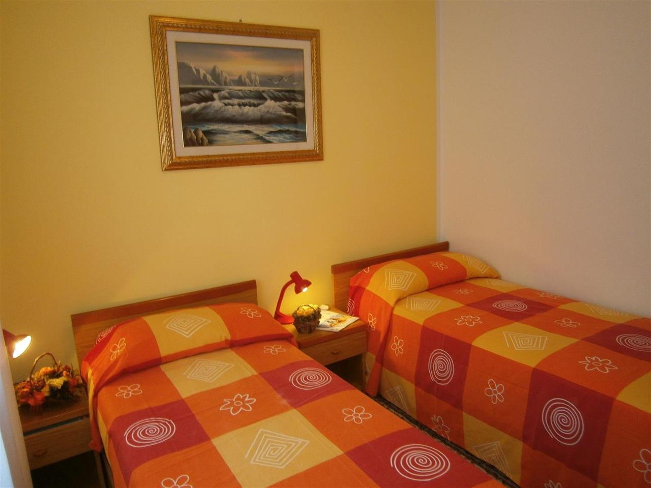 Die Dreizimmer-Wohnung Trilo A2 mit seitlichem Meerblick befindet sich im ersten oder zweiten Stockwerk und bietet Platz für max. 6 Personen (eine Überbelegung mit einem Baby im Reisebett ist auf Anfrage möglich). Die Unterkunft besteht aus einem Schlafzimmer mit einem Doppelbett sowie einem Schlafzimmer mit zwei Einzelbetten. Das Doppelschlafsofa im Wohnzimmer bietet einen weiteren Schlafplatz für zwei Personen. Im Wohnbereich befindet sich ausserdem die gut eingerichtete Küche mit einem Herd, Geschirr, Besteck, Töpfen, Mikrowelle, Espressokanne und Kühlschrank mit Eisfach. Das Badezimmer ist mit einer Dusche, einem Waschbecken, einem Bidet sowie einem WC ausgestattet. Bettwäsche und Handtücher können auf Wunsch vor Ort gemietet werden (bitte beim Buchen reservieren). Die Wohnung verfügt zudem über einen überdachten Balkon, welcher mit Tisch und Stühlen zum Verweilen einlädt. Bei Bedarf kann ein Reisebett oder ein Hochstuhl dazu gemietet werden (bei Buchung bitte reservieren). Die Fahrzeit ab italienischer Grenze beträgt ca. 4h. Hinweis: Wenn Sie mehr als eine Unterkunft benötigen, ist dies bei uns in der Regel möglich, da wir über mehrere Objekte des gleichen Haustyps verfügen.