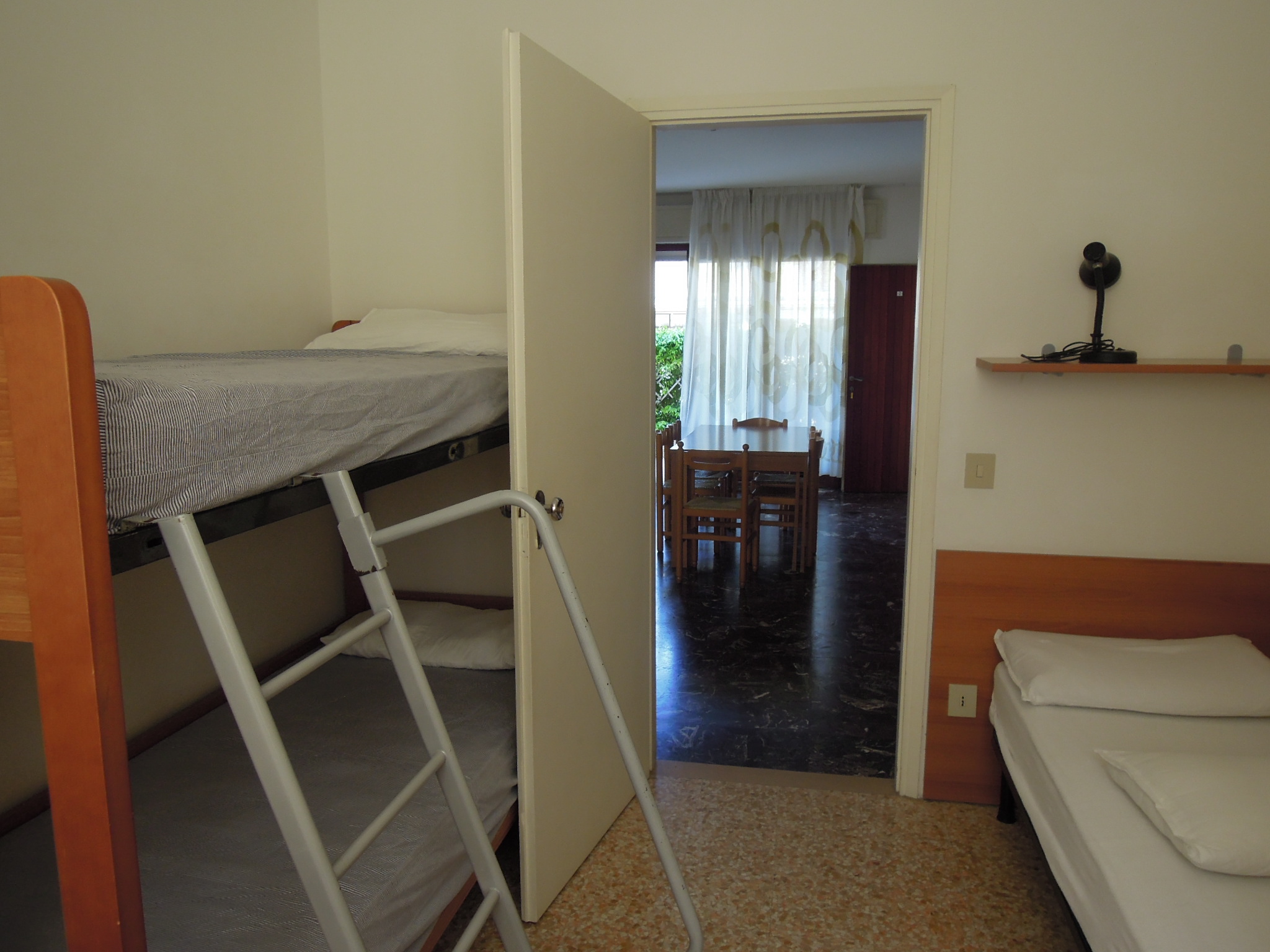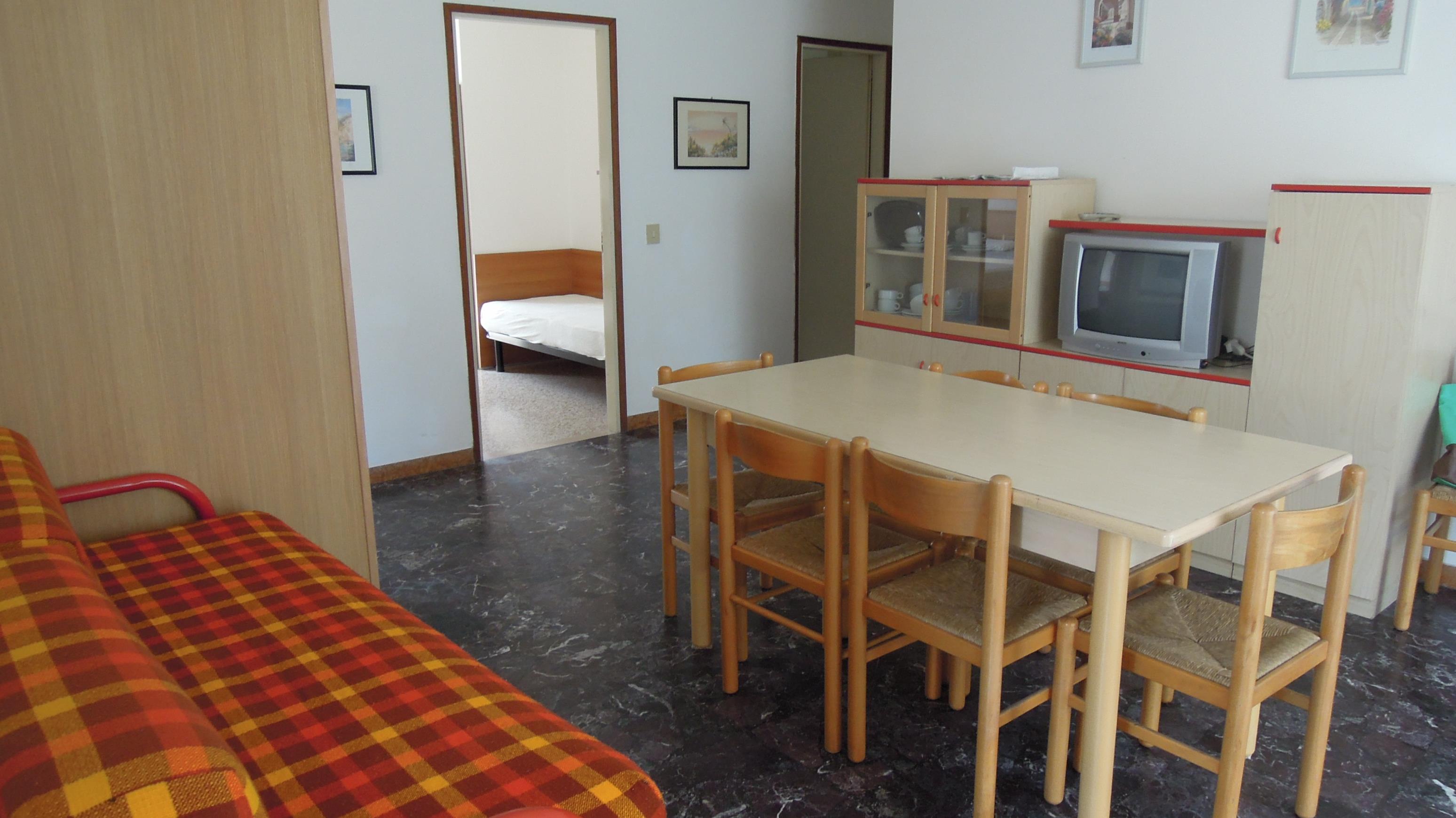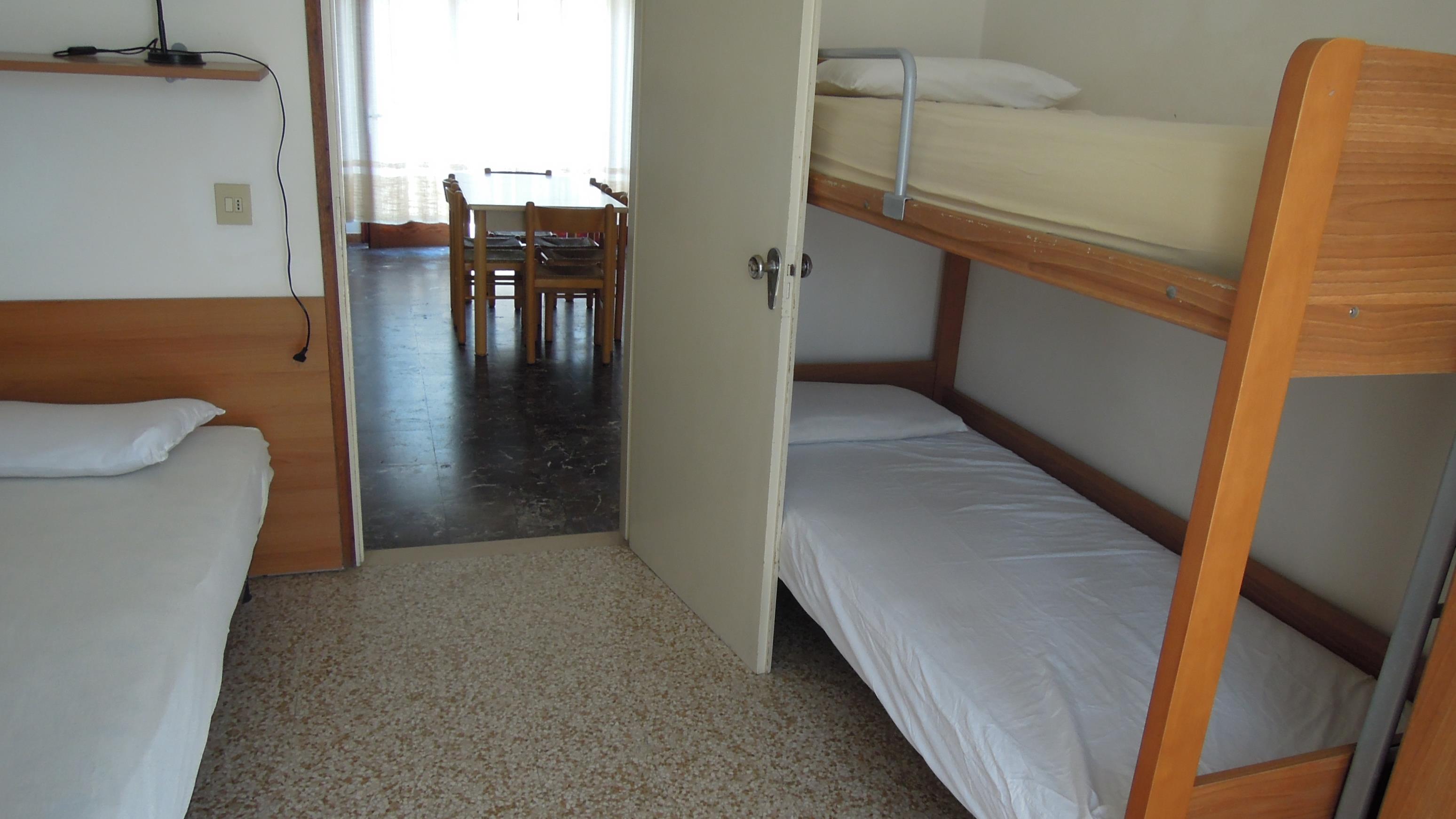 Die einfache aber zweckmässig eingerichtete Vierzimmer-Wohnung Tipo D bietet Platz für max. 7 Personen und befindet sich entweder im Erdgeschoss, oder im 2. Stock der Residenz. Die Unterkunft ist in zwei verschiedenen Aufteilungen verfügbar. In der ersten Variante erwartet Sie ein Schlafzimmer mit Doppelbett sowie zwei weitere Schlafzimmer mit jeweils zwei Einzelbetten; zusätzlich bietet ein Bettsofa im Wohnbereich einen weiteren Schlafplatz. Die zweite Variante verfügt ebenfalls über ein Schlafzimmer mit Doppelbett und ein Zimmer mit zwei Einzelbetten, bietet jedoch in einem dritten Schlafzimmer eine Kombination aus einem Stockbett und einem Einzelbett. Die Wohnung verfügt über eine gut eingerichtete Küche, die mit Geschirr, Besteck, Töpfen, einem Gasherd (mit 4 Flammen), einer Espressokanne, einem Wasserkocher sowie einem grossen Kühlschrank mit Eisfach ausgestattet ist. Das Badezimmer ist mit einer Dusche, einem Waschbecken, einem Bidet sowie einem WC ausgestattet. Bei der Wohnung im Erdgeschoss lädt der halbüberdachte Terrasse mit Tisch und Stühlen zum gemütlichen Entspannen bei einem Glas italienischen Wein ein. Die Wohnung im 2. Stock verfügt über 2 halbüberdachte Balkone (unmöbiliert). Fahrzeit ab italienischer Grenze ca. 4h. Hinweis: Wenn Sie mehr als eine Unterkunft benötigen, ist dies bei uns in der Regel möglich, da wir über mehrere Objekte des gleichen Haustyps verfügen. ANREISETAG + AUFENTHALTSDAUERDie An- und Abreisetage sowie die Mindestaufenthaltsdauer in der von Ihnen gewünschten Saisonzeit entnehmen Sie bitte dem Kalender. Hinweis: Sollten Sie aus irgendeinem Grund nicht am vorgesehenen Anreisetag anreisen können, ist selbstverständlich auch ein Check-in am Folgetag möglich (bitte vor der Anreise melden). Gleiches gilt auch falls Sie früher abreisen möchten. Auch hier ist die Abreise am Vortag möglich. Der zum Buchen vorgegebene Mietzeitraum/Mietpreis bleibt jedoch unverändert.