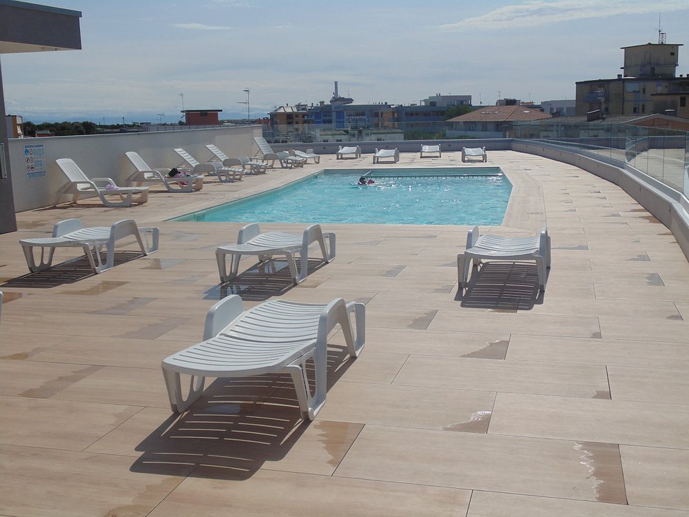 POOLDas Highlight der Residenz erwartet Sie ganz oben: Ein grosszügiger Panorama-Pool mit weitem Blick über die Dächer von Bibione. Die weitläufige, moderne Dachterrasse ist rundherum mit bequemen Sonnenliegen ausgestattet, die zum Relaxen und Sonnenbaden einladen.