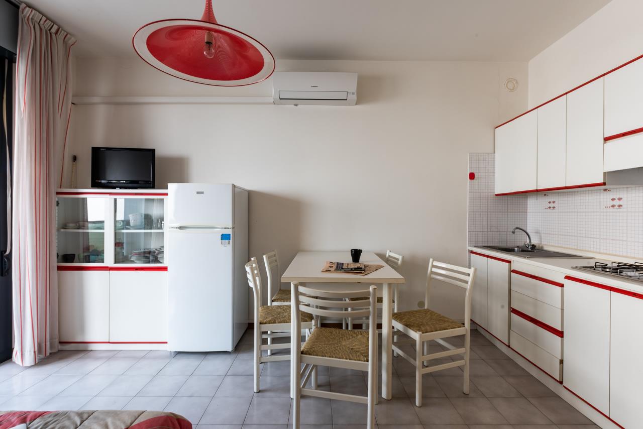 Die Dreizimmerwohnung mit seitlichem Meerblick bietet Platz für maximal 6 Personen. Sie besteht aus einem Schlafzimmer mit einem Doppelbett sowie einem Schlafzimmer mit zwei Einzelbetten. Im Wohnbereich bietet ein Bettsofa zwei weitere Schlafplätze. Ein SAT-TV und Klimaanlage sind ebenfalls vorhanden. Die vollausgestattete Küche verfügt über einen Gasherd, Geschirr, Besteck, Kochtöpfe, Mikrowelle und einen Kühlschrank mit Eisfach. Das Badezimmer verfügt über eine Dusche, ein WC, ein Bidet und ein Waschbecken. Die Wohnung verfügt über einen Balkon mit seitlichem Meerblick und lädt mit Tisch und Stühlen zum Entspannen ein. Fahrzeit ab italienischer Grenze ca. 4h.