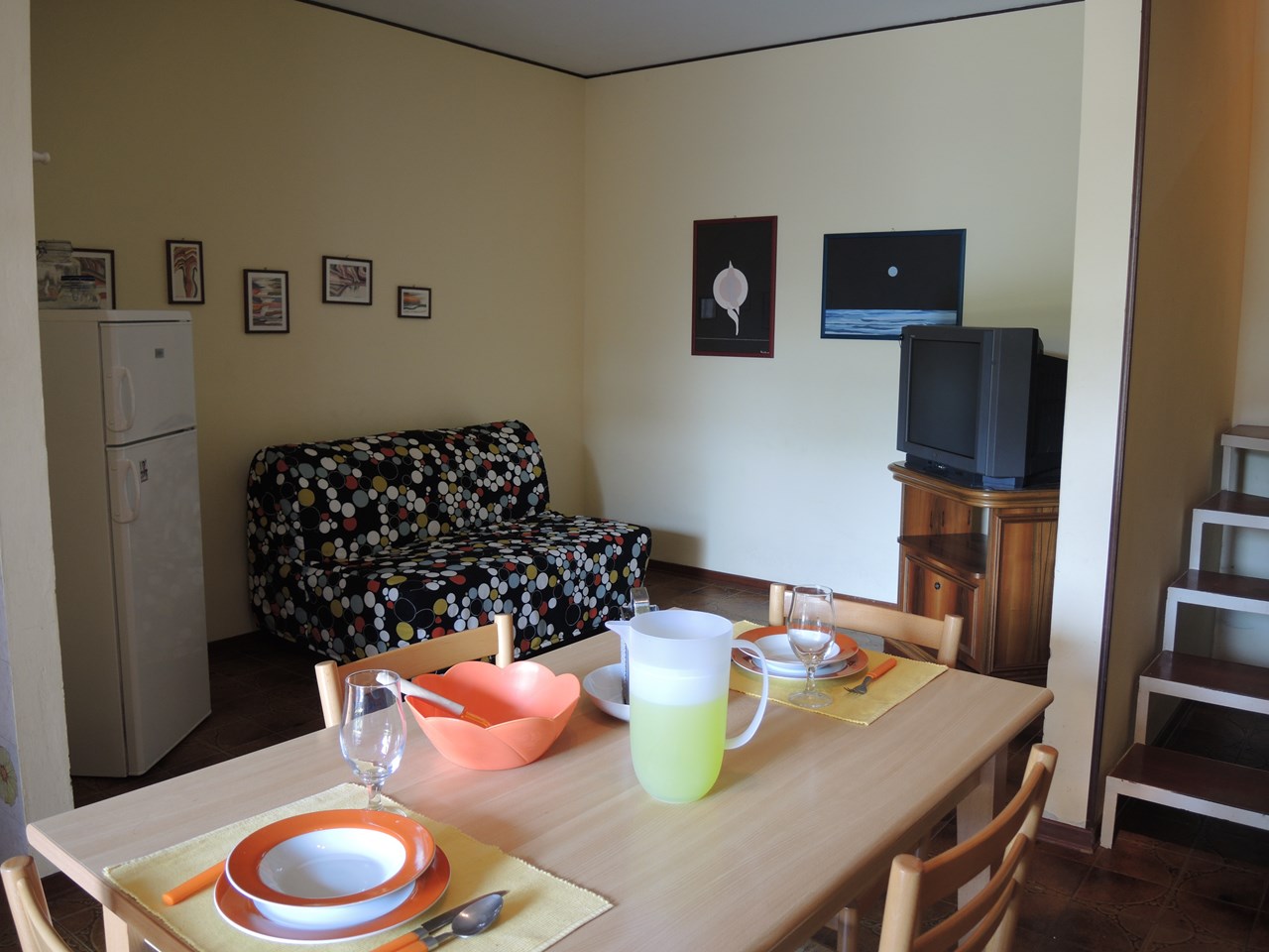 Die Unterkunft bietet Platz für maximal 5 Personen und steht in zwei verschiedenen Ausführungen zur Verfügung: Entweder als gemütliches Reihenferienhaus über zwei Etagen oder als ebenerdige Wohnung im Erdgeschoss. Die Unterkunft besteht aus einem Schlafzimmer mit Doppelbett, sowie einem Schlafzimmer mit zwei Einzelbetten. Einen weiteren Schlafplatz bietet das Schlafsofa im Wohnzimmer. Im Wohnbereich befindet sich auch die gut eingerichtet Küche, mit Geschirr, Besteck, Töpfen, einem Kühlschrank mit Gefierfach und einem Gasherd. Die Unterkunft verfügt über ein Badezimmer mit Dusche, WC, Waschbecken und Bidet. Der Sitzplatz mit Tisch, Stühlen und einem eigenen kleinen Garten lädt zum gemütlichen Entspannen ein, während sich die Kinder am Pool oder auf dem Spielplatz austoben können. Grillen ist erlaubt, im Garten steht ein Kamin zur Verfügung. Die Fahrzeit ab italienischer Grenze beträgt ca. 4h. Bitte nehmen Sie daher zur Kenntnis, dass die Inneneinrichtung daher leicht variieren kann.