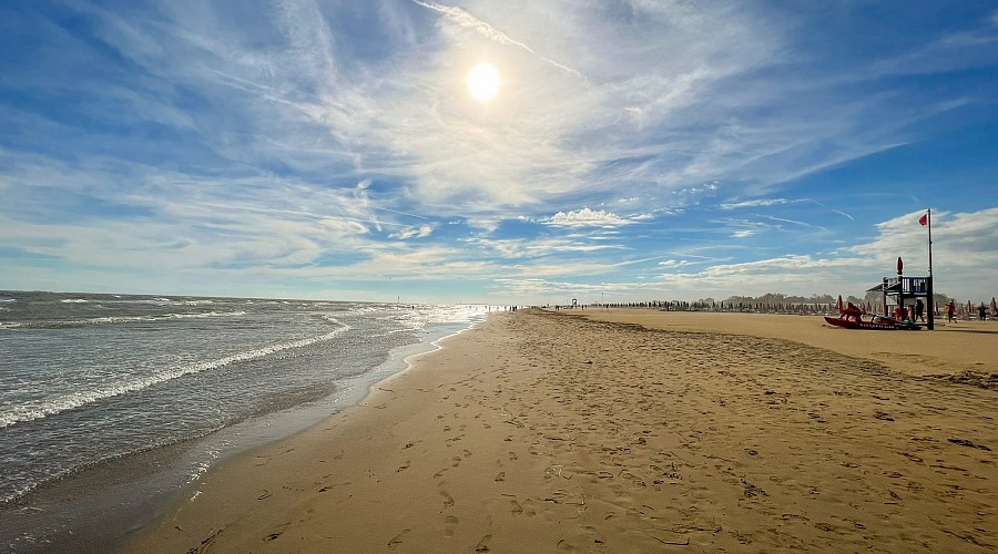 Der schöne und flachabfallende Sandstrand von Bibione Pineda ist nur wenige Fussminuten von der Residenz entfernt. Geniessen Sie mit Ihrer Familie vergnügliche Stunden am Strand! Während die Erwachsenen die Sonne geniessen oder sich bei einer der Wassersportmöglichkeiten aktiv betätigen, können die Kinder neue Freundschaften schliessen und sich im Sand vergnügen. Gepflasterte Zugangswege bis zum Küstenstreifen und zu den Sonnenschirmen garantieren am Strand den Zugang mit Kinderwagen und für Behinderte.