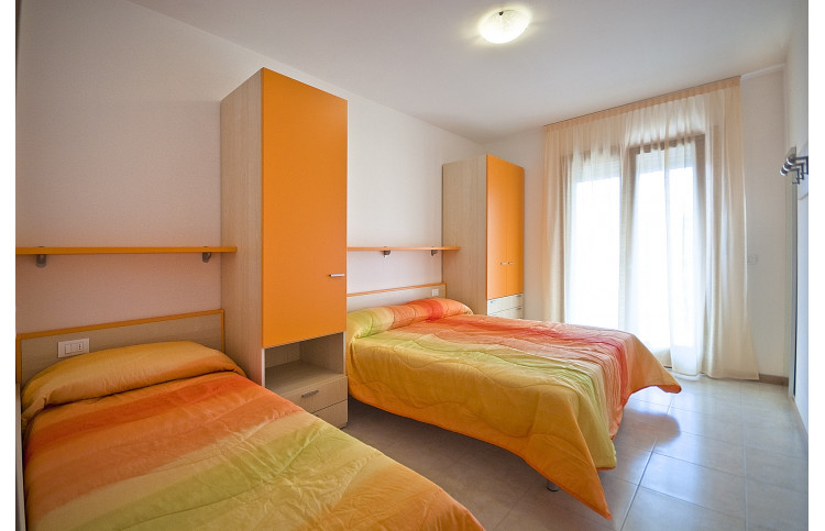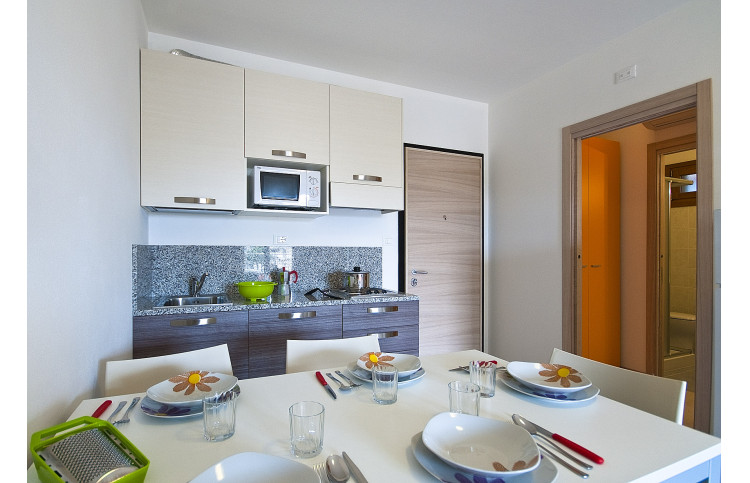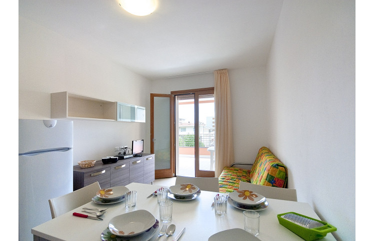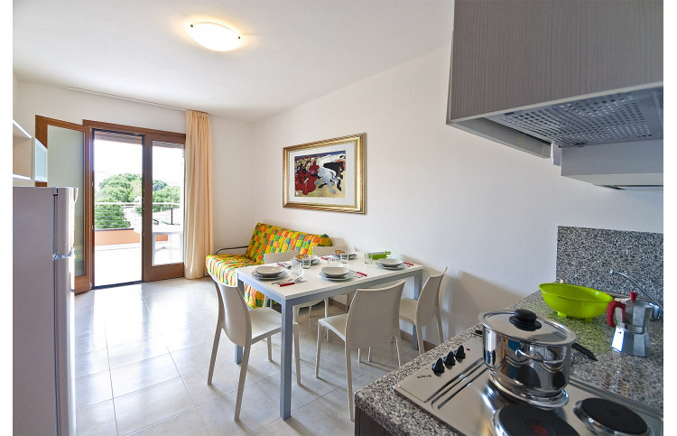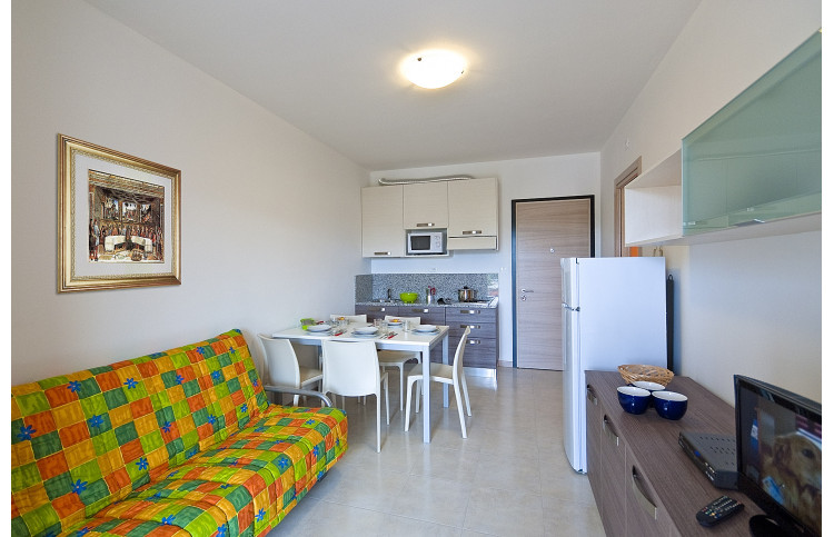 Die moderne Zweizimmer-Wohnung bietet Platz für max. 5 Personen und befindet sich im ersten Stockwerk. Die Unterkunft verfügt über ein Schlafzimmer, welches mit einem Doppelbett und einem Einzelbett ausgestattet ist. Bei Bedarf bietet die Doppelbettcouch im kombinierten Wohn- und Essbereich zwei weitere Schlafplätze. Eine gut eingerichtete Kochnische mit Herd, Geschirr, Besteck, Töpfen, Mikrowelle, italienische Espressokanne, Geschirrspüler und Kühlschrank mit Eisfach befindet sich ebenfalls im Wohnbereich. Das Badezimmer ist mit einer Waschmaschine, einer Dusche, einem Waschbecken, einem Bidet und einem WC ausgestattet. Ein SAT-TV und Klimaanlage sind vorhanden. Der überdachte Balkon ist mit Tisch und Stühlen ausgestattet und lädt zum Entspannen und Verweilen ein. Der Parkplatz ist überdacht. Die Fahrzeit ab italienischer Grenze beträgt ca. 4h. Hinweis: Wenn Sie mehr als eine Unterkunft benötigen, ist dies bei uns in der Regel möglich, da wir über mehrere Objekte des gleichen Haustyps verfügen.