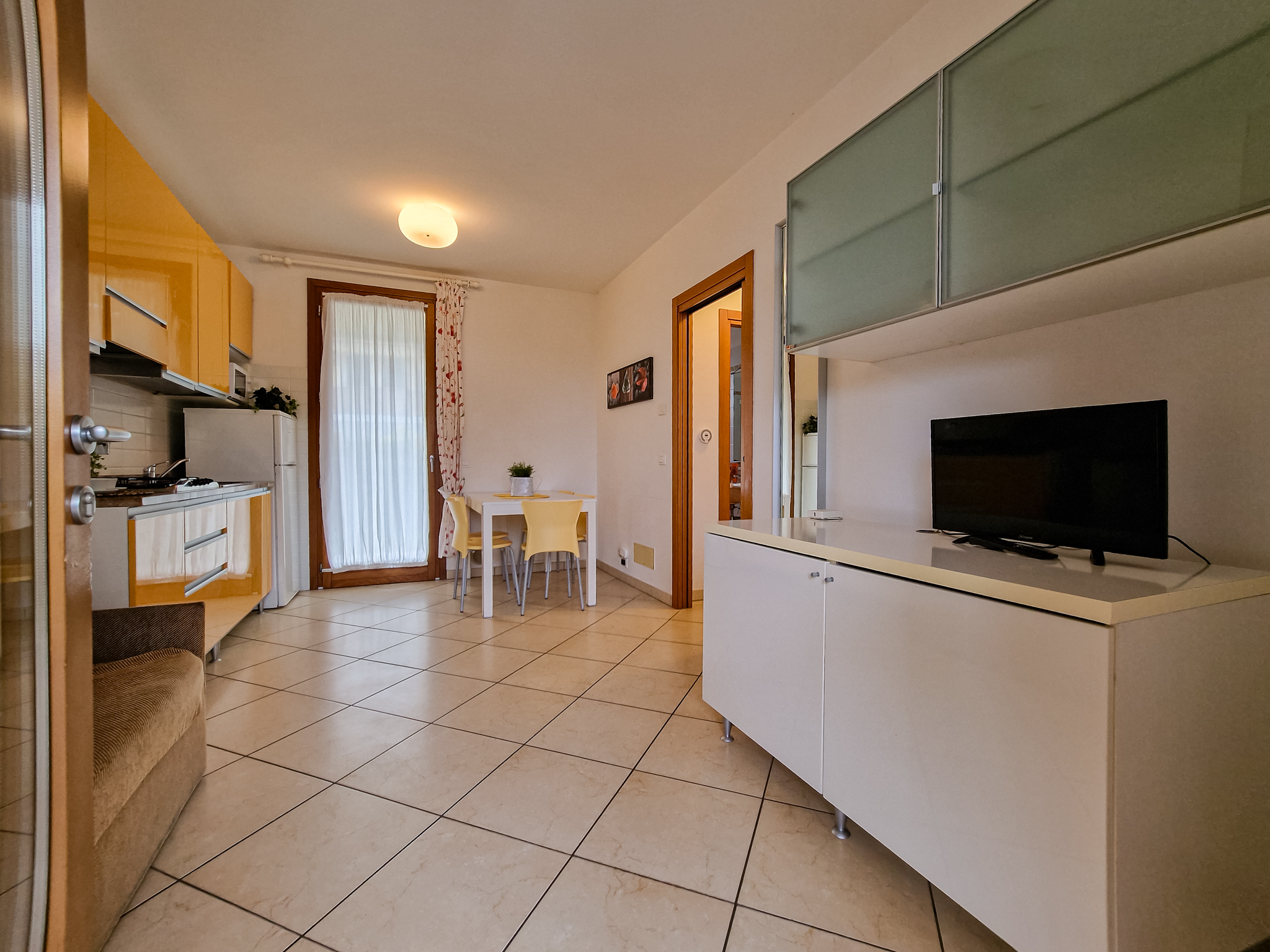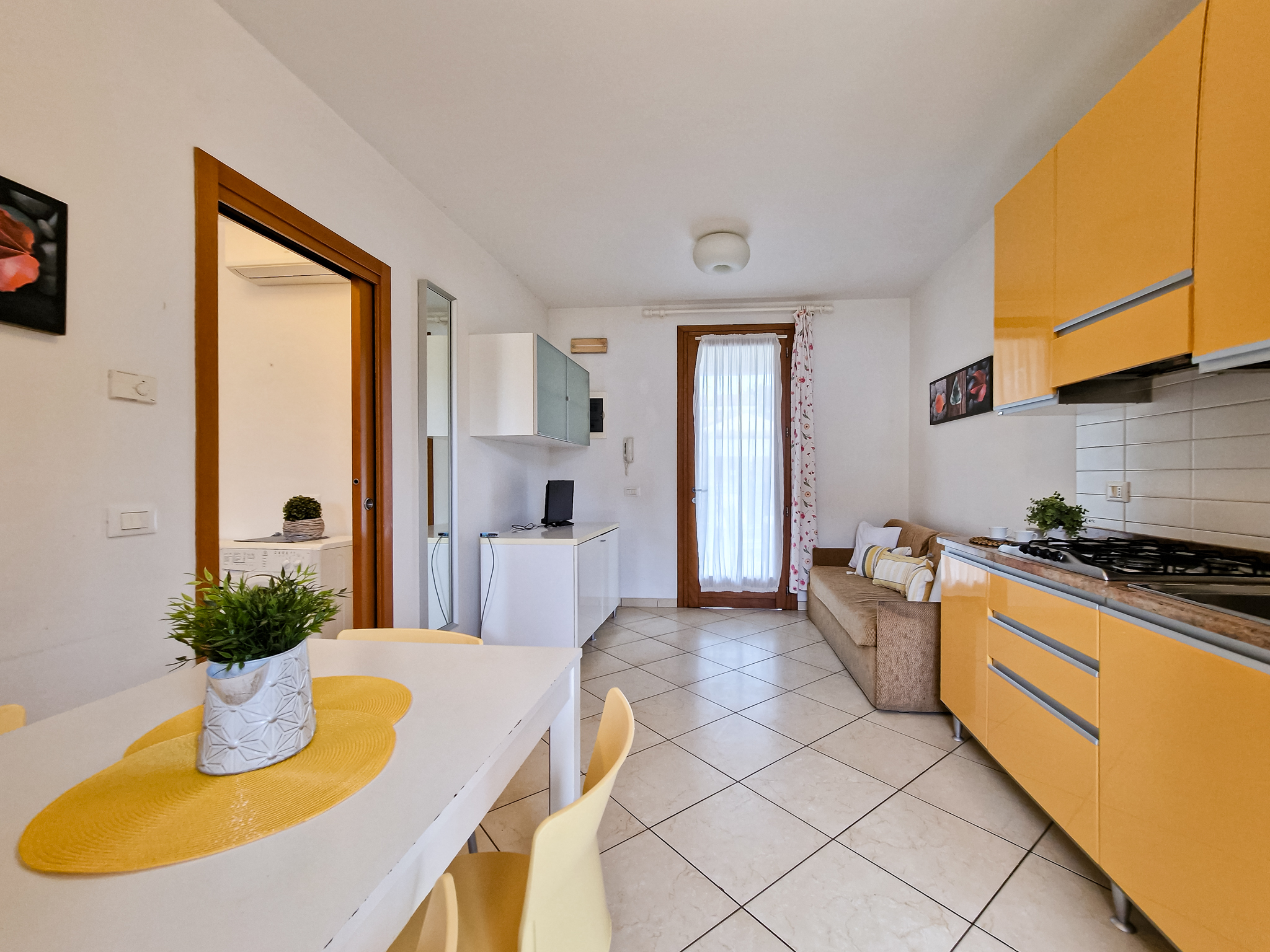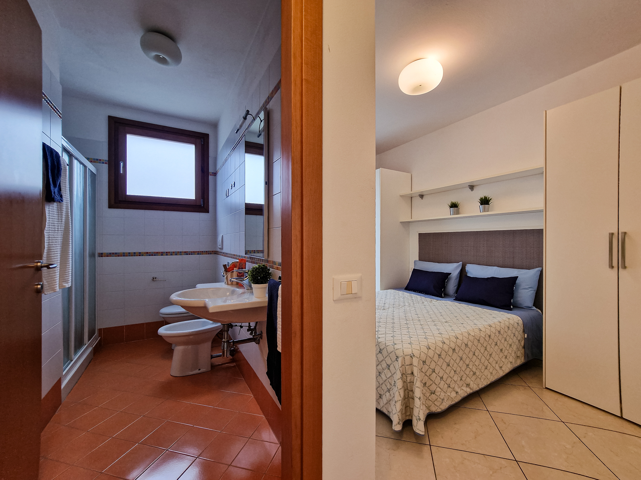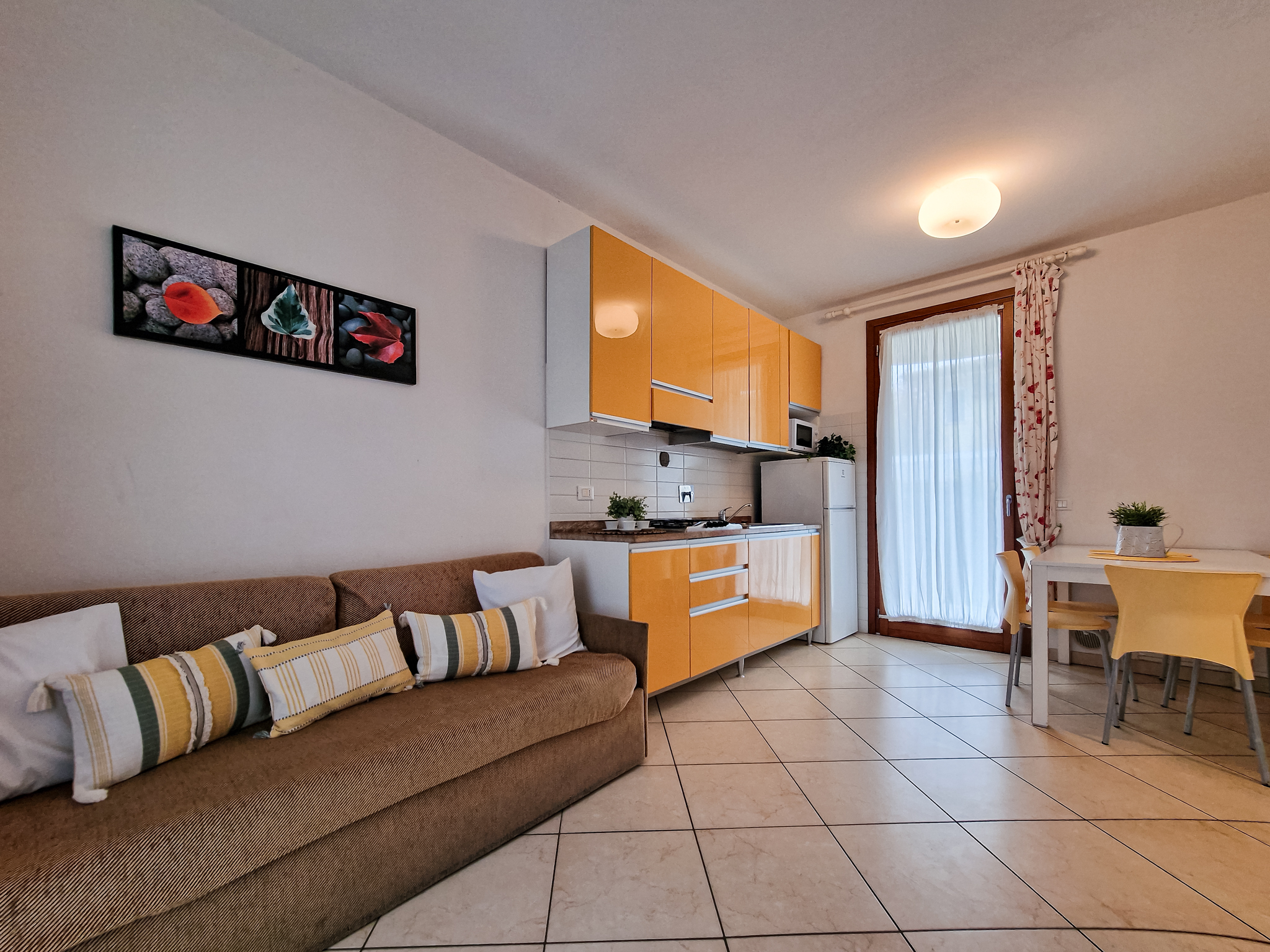 Die Zweizimmer-Wohnung Tipo B ist für bis zu 4 Personen geeignet und befindet sich im Erdgeschoss der Residenz. Die Unterkunft verfügt über ein Schlafzimmer, das mit einem Doppelbett sowie einem Einzelbett ausgestattet ist, während im kombinierten Wohn- und Essbereich ein Einzelbettsofa bei Bedarf einen weiteren Schlafplatz bietet. Die gut eingerichtete Küche befindet sich im Wohnbereich und ist mit einem Gasherd, Geschirr, Besteck, Töpfen, einer Mikrowelle, einer Kaffeemaschine und einem grossen Kühlschrank mit Eisfach ausgestattet. Die Wohnung verfügt über ein Badezimmer mit Dusche, WC und Waschbecken. Die Wohnung verfügt gleich über eine überdachten Sitzplatz mit Tisch, Stühlen ausgestattet. Die Klimaanlage und ein SAT-TV sind vorhanden. Eine eigene Waschmaschine steht Ihnen in der Wohnung zur Verfügung. Ein überdachter Parkplatz ist vorhanden. Die Fahrzeit ab der ital. Grenze beträgt ca. 4h. Hinweis: Wenn Sie mehr als eine Unterkunft benötigen, ist dies bei uns in der Regel möglich, da wir über mehrere Objekte des gleichen Haustyps verfügen.