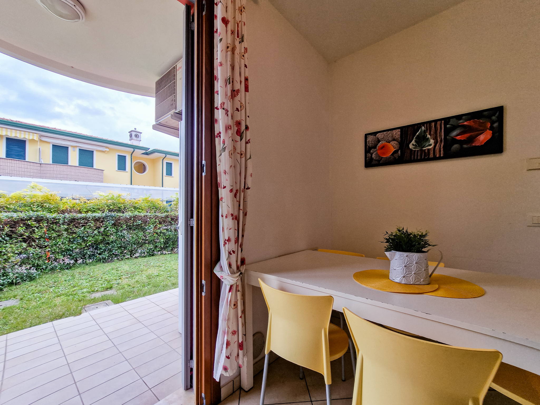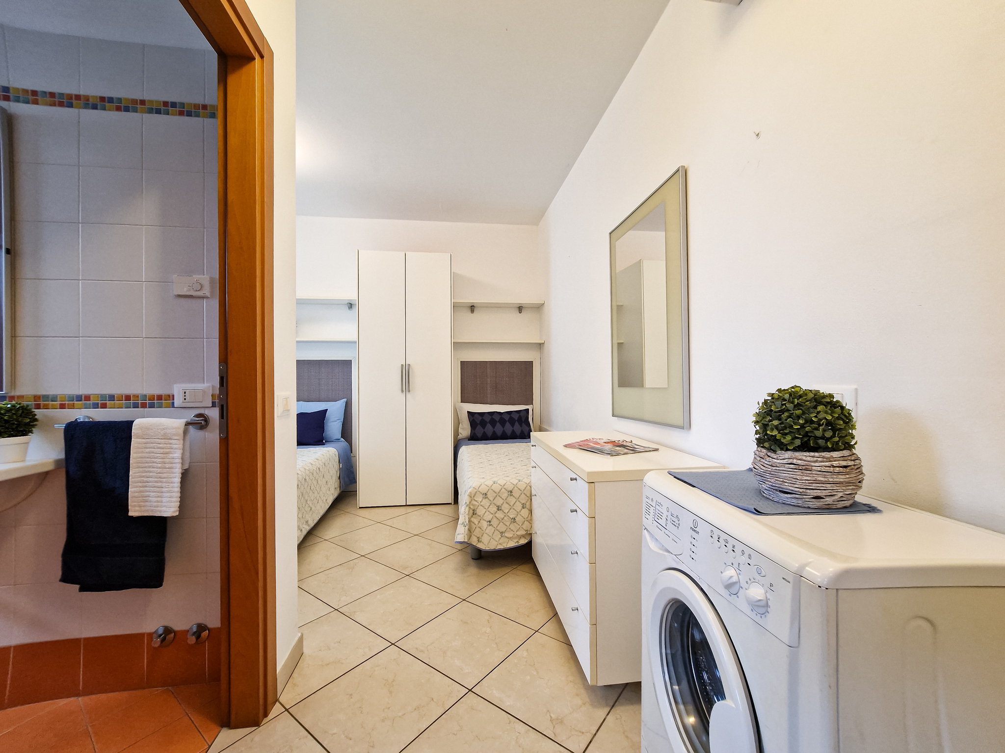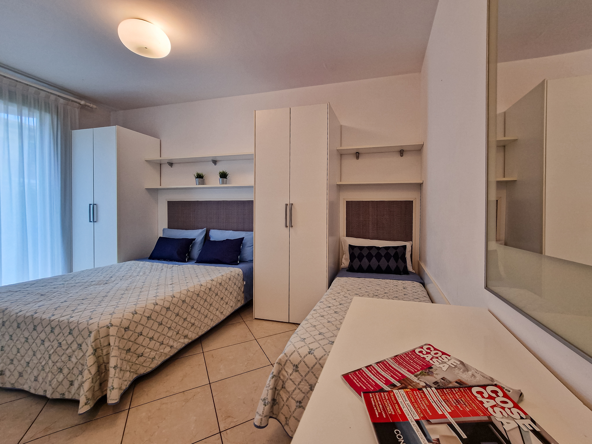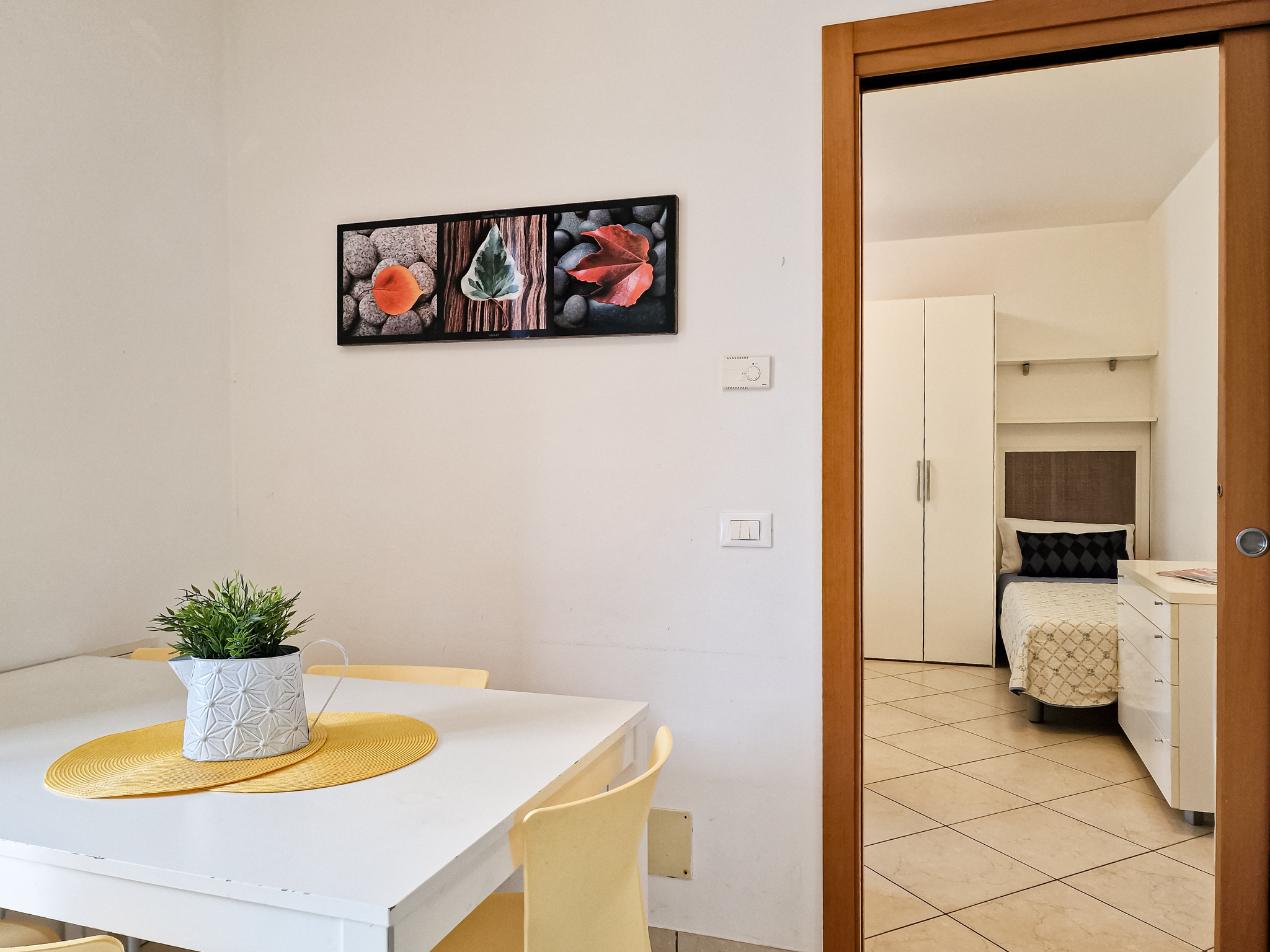 Die Zweizimmer-Wohnung Tipo B ist für bis zu 4 Personen geeignet und befindet sich im Erdgeschoss der Residenz. Die Unterkunft verfügt über ein Schlafzimmer, das mit einem Doppelbett sowie einem Einzelbett ausgestattet ist, während im kombinierten Wohn- und Essbereich ein Einzelbettsofa bei Bedarf einen weiteren Schlafplatz bietet. Die gut eingerichtete Küche befindet sich im Wohnbereich und ist mit einem Gasherd, Geschirr, Besteck, Töpfen, einer Mikrowelle, einer Kaffeemaschine und einem grossen Kühlschrank mit Eisfach ausgestattet. Die Wohnung verfügt über ein Badezimmer mit Dusche, WC und Waschbecken. Die Wohnung verfügt gleich über eine überdachten Sitzplatz mit Tisch, Stühlen ausgestattet. Die Klimaanlage und ein SAT-TV sind vorhanden. Eine eigene Waschmaschine steht Ihnen in der Wohnung zur Verfügung. Ein überdachter Parkplatz ist vorhanden. Die Fahrzeit ab der ital. Grenze beträgt ca. 4h. Hinweis: Wenn Sie mehr als eine Unterkunft benötigen, ist dies bei uns in der Regel möglich, da wir über mehrere Objekte des gleichen Haustyps verfügen.