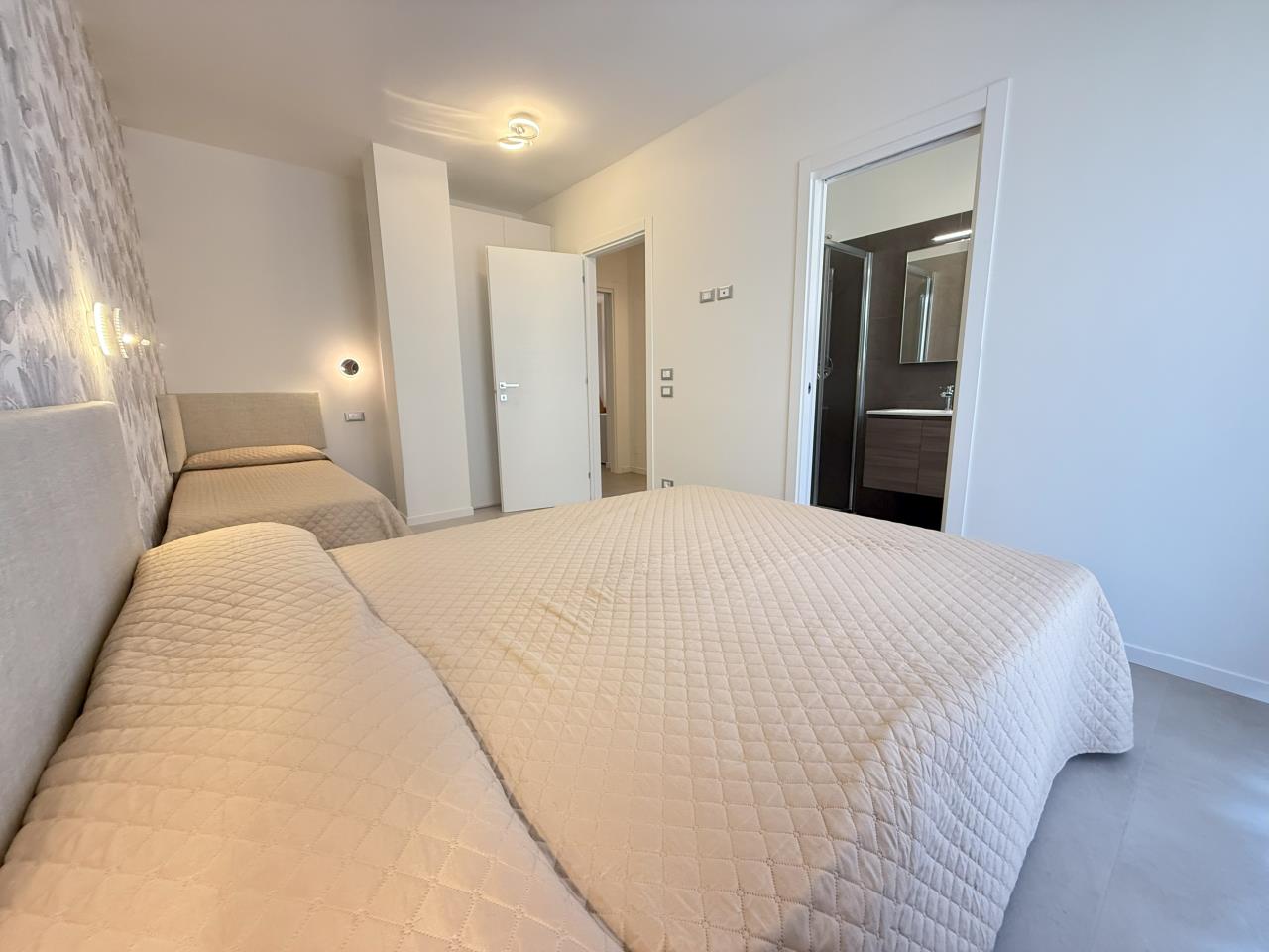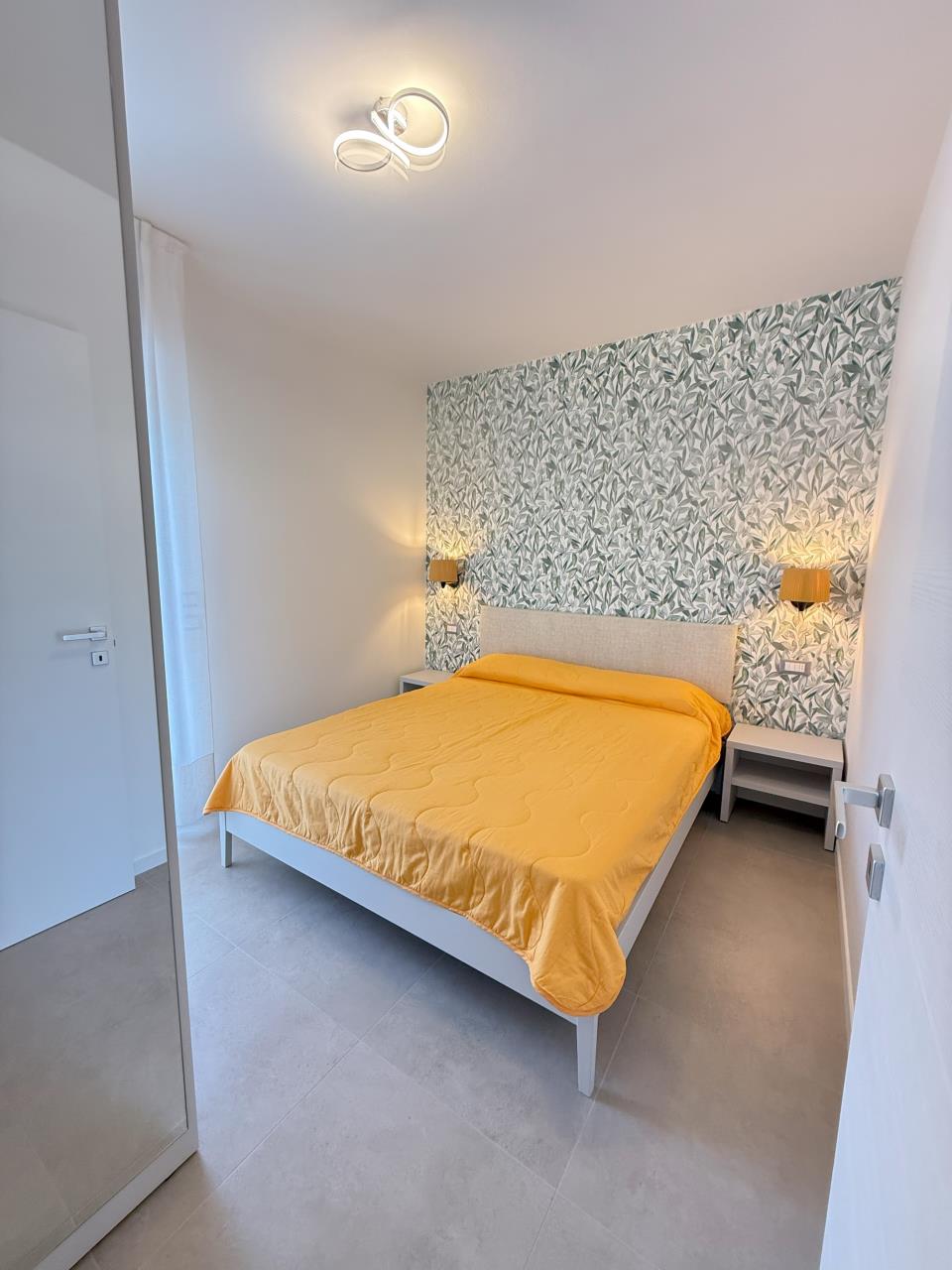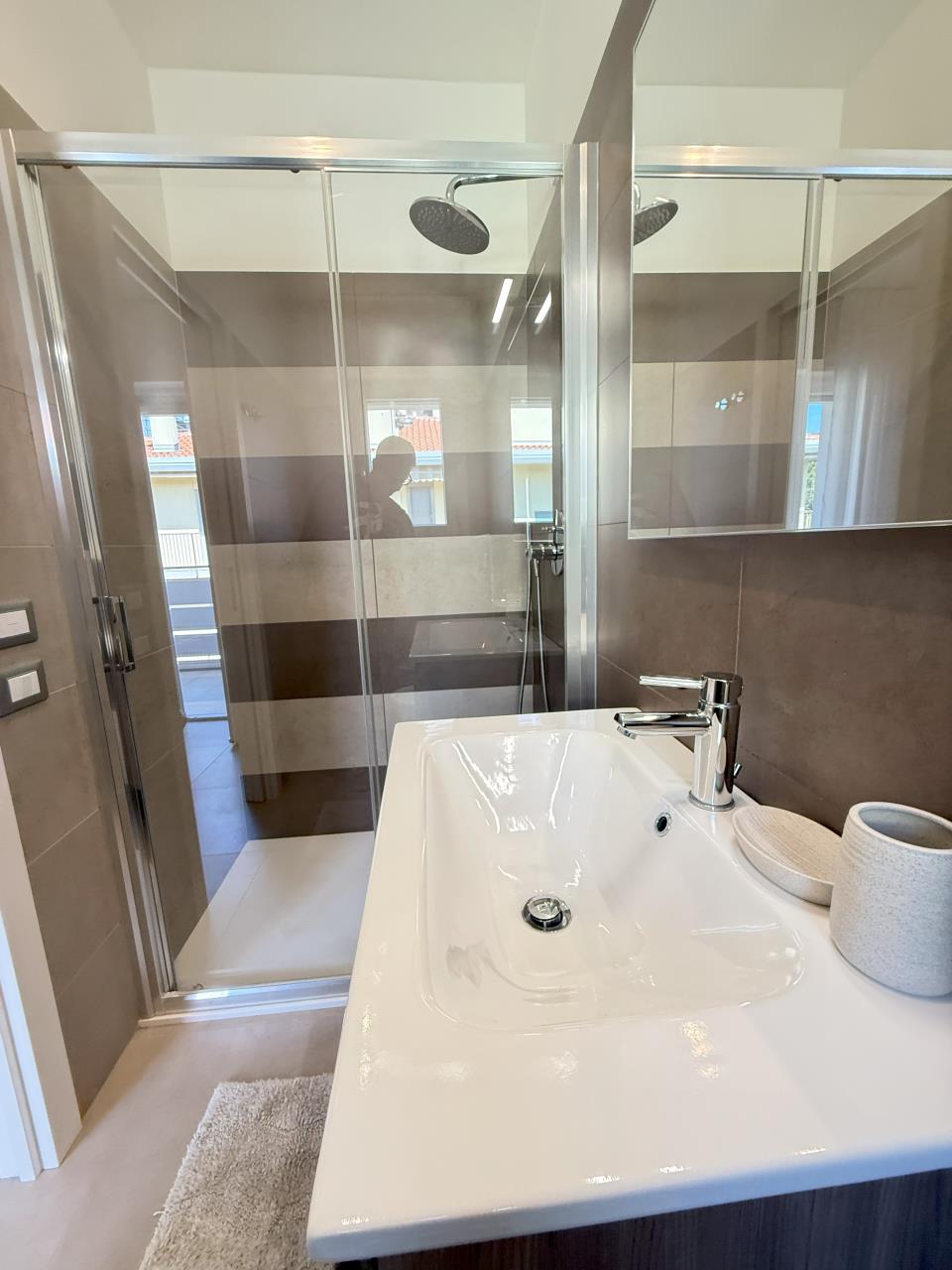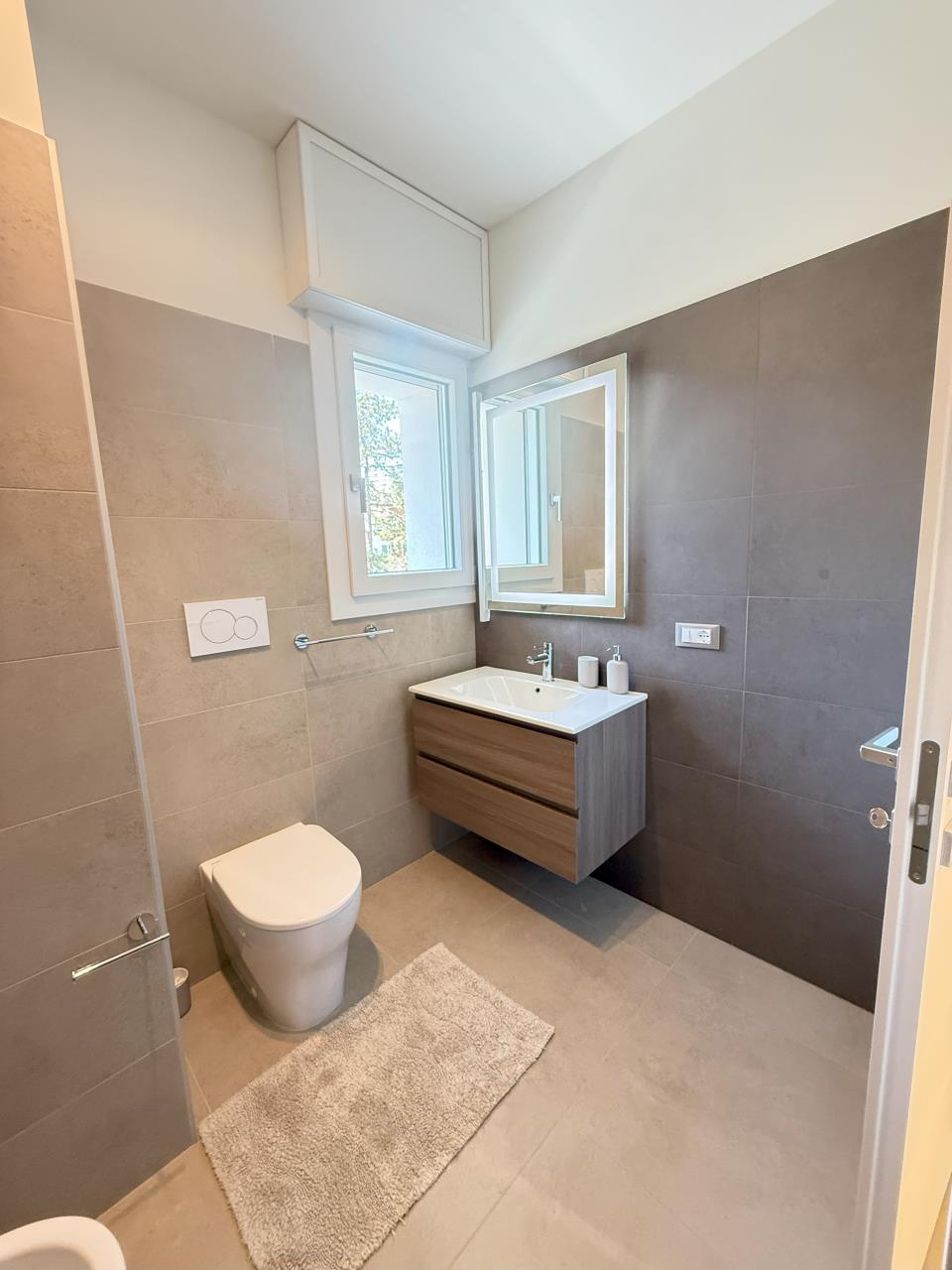 Die moderne, neu renovierte Dreizimmerwohnung befindet sich im 2. Stock des Ferienhauses, das keinen Aufzug besitzt, und bietet Platz für maximal 7 Personen. Sie verfügt über ein Schlafzimmer mit einem Doppelbett sowie ein weiteres Schlafzimmer mit einem Doppelbett und einem Einzelbett. Im Wohnbereich bietet ein Bettsofa zwei weitere Schlafplätze. Ein SAT-TV, eine Waschmaschine und eine Klimaanlage sind ebenfalls vorhanden. Die vollausgestattete Küche verfügt über einen Induktionsherd, Geschirr, Besteck, Kochtöpfe, eine Mikrowelle, einen Geschirrspüler und einen Kühlschrank mit Eisfach. Die Wohnung bietet zwei Badezimmer, die jeweils mit einem Waschbecken, einem WC, einer Dusche und einem Bidet ausgestattet sind. Der Balkon lädt mit Tisch und Stühlen zum Verweilen und Entspannen ein. Fahrzeit ab italienischer Grenze ca. 4h.