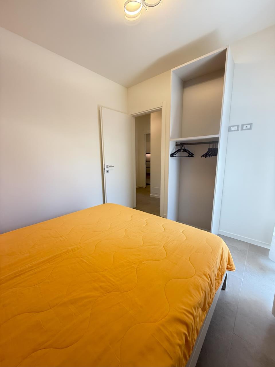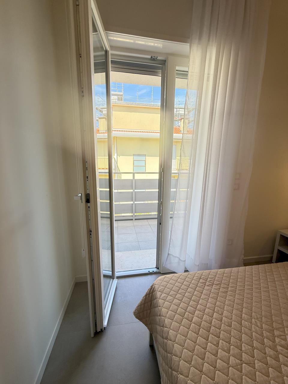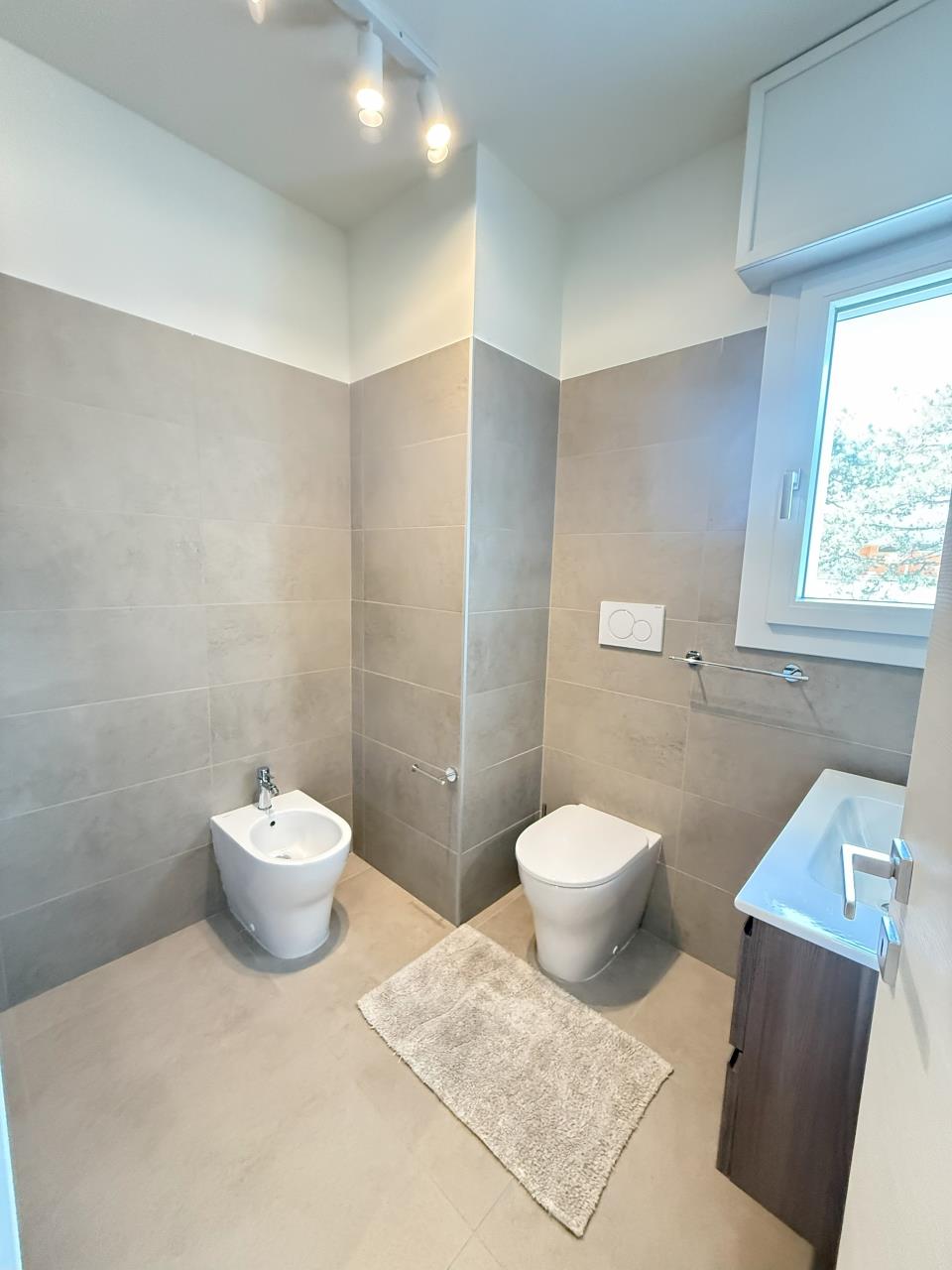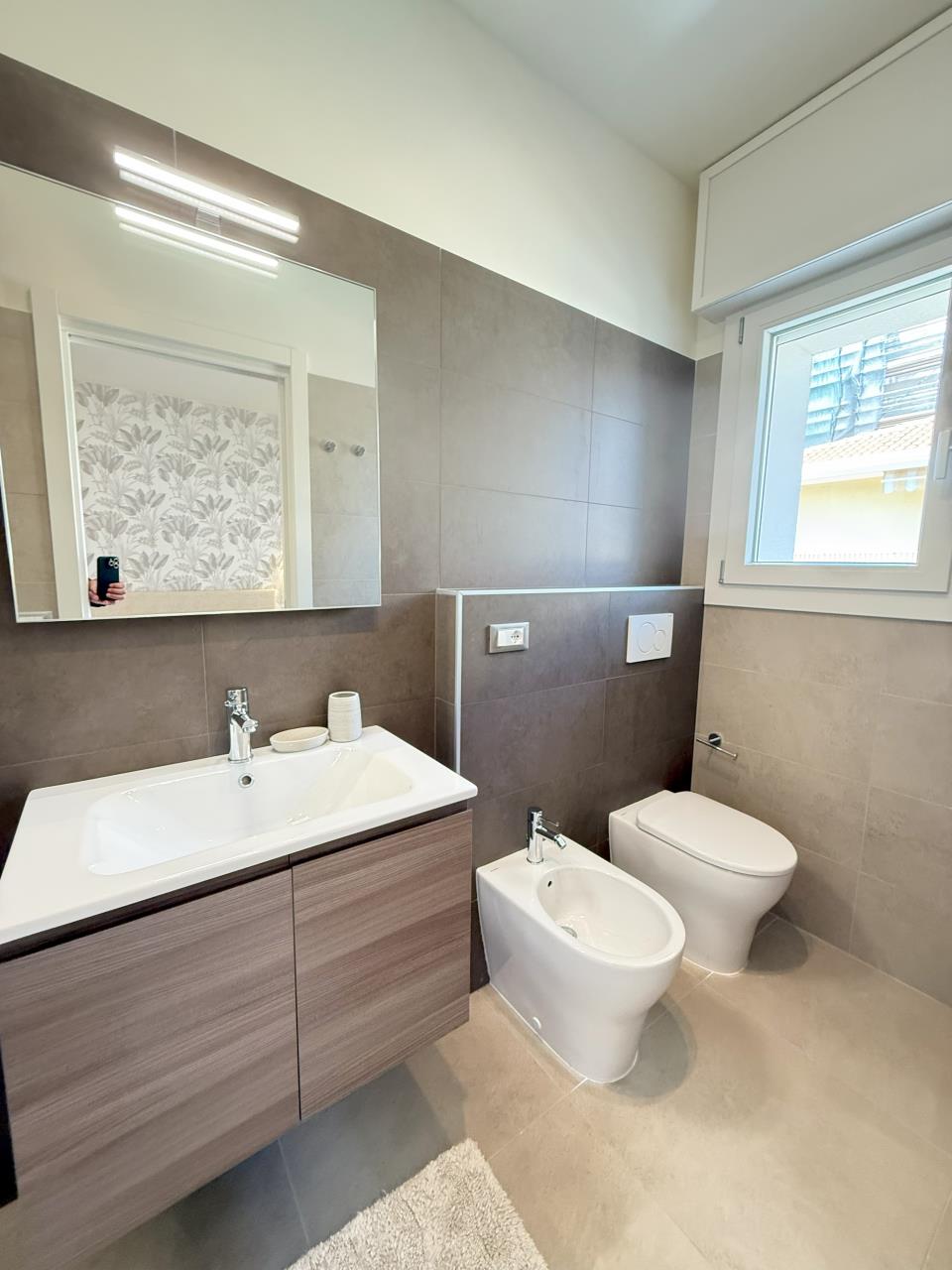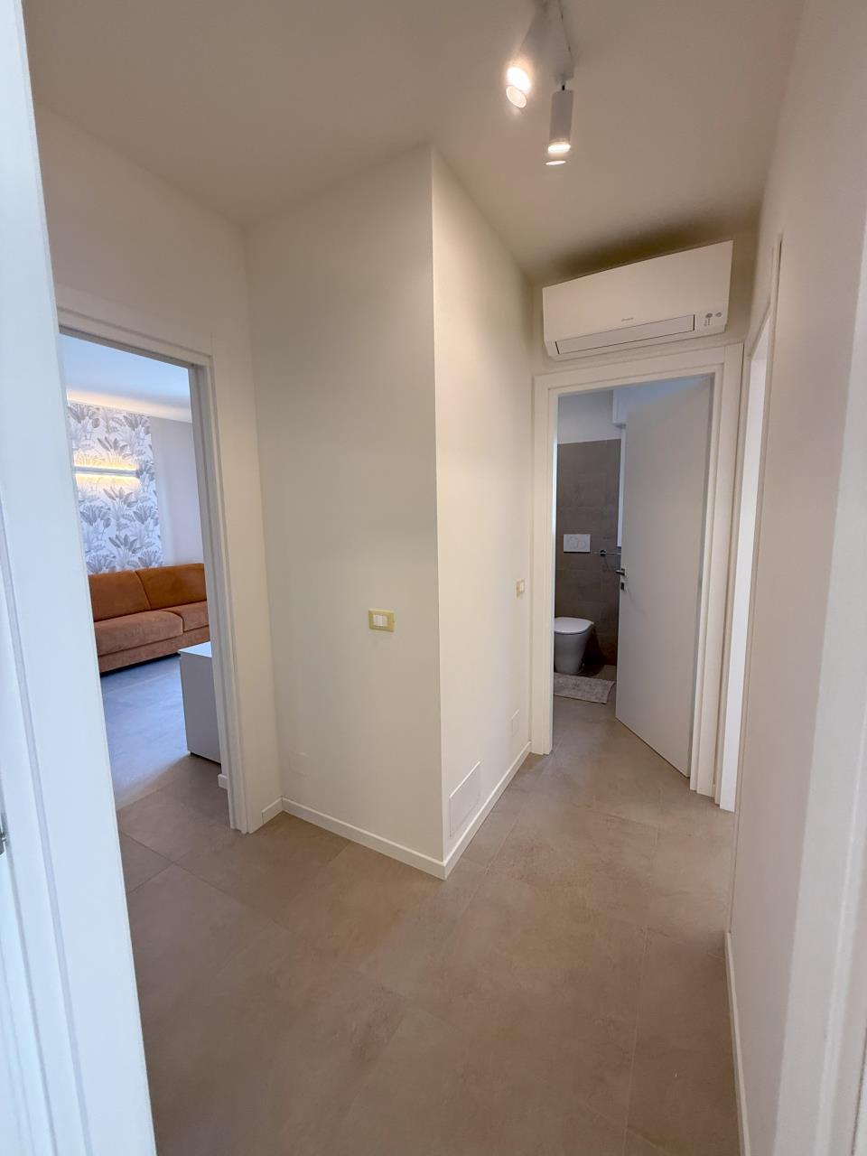 Die moderne, neu renovierte Dreizimmerwohnung befindet sich im 2. Stock des Ferienhauses, das keinen Aufzug besitzt, und bietet Platz für maximal 7 Personen. Sie verfügt über ein Schlafzimmer mit einem Doppelbett sowie ein weiteres Schlafzimmer mit einem Doppelbett und einem Einzelbett. Im Wohnbereich bietet ein Bettsofa zwei weitere Schlafplätze. Ein SAT-TV, eine Waschmaschine und eine Klimaanlage sind ebenfalls vorhanden. Die vollausgestattete Küche verfügt über einen Induktionsherd, Geschirr, Besteck, Kochtöpfe, eine Mikrowelle, einen Geschirrspüler und einen Kühlschrank mit Eisfach. Die Wohnung bietet zwei Badezimmer, die jeweils mit einem Waschbecken, einem WC, einer Dusche und einem Bidet ausgestattet sind. Der Balkon lädt mit Tisch und Stühlen zum Verweilen und Entspannen ein. Fahrzeit ab italienischer Grenze ca. 4h.