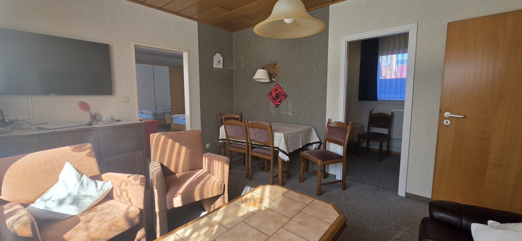 Das helle Wohnzimmer lädt mit TV-Anschluss und Radio zum Verweilen ein. Die separate Küche ist funktional eingerichtet und verfügt über ein Ceranfeld, eine Mikrowelle, einen Kühlschrank sowie eine Kaffeemaschine – perfekt für die Selbstversorgung während Ihres Aufenthalts.