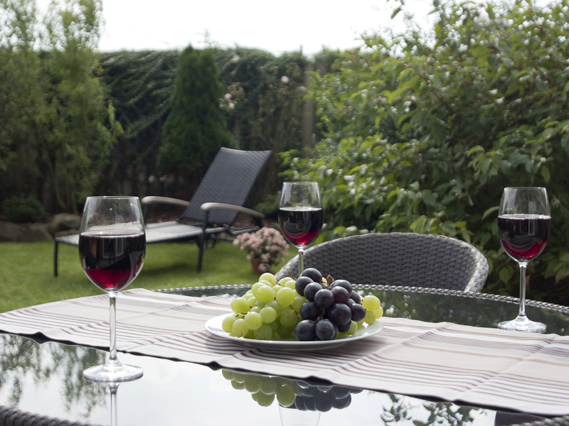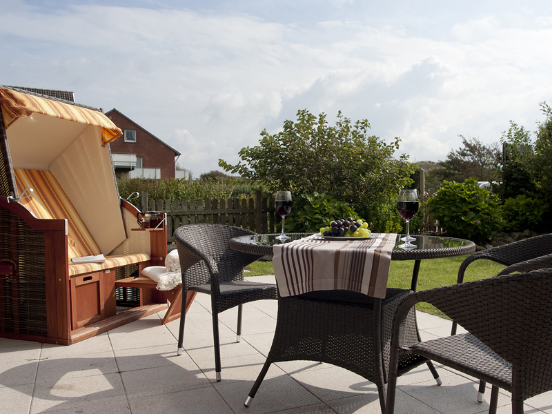 Die Terrasse ist mit Strandkorb und Gartenmöbeln ausgestattet.