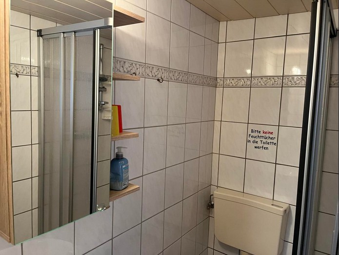 Das Badezimmer verfügt über eine Dusche und ein WC. Zusätzlich steht den Gästen eine eigene Terrasse zur Verfügung.