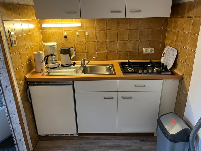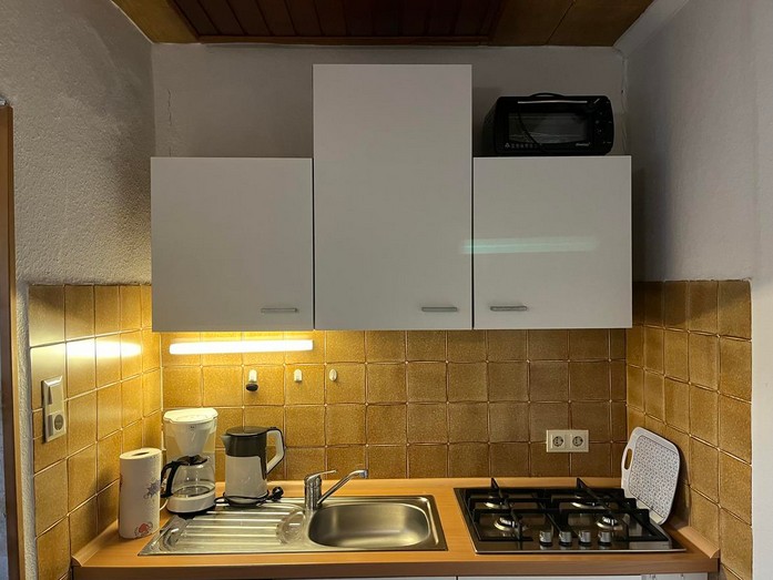 Die Küchenzeile ist ausgestattet mit einem vierflammigen Gasherd, kleinen Backofengrill, Kühlschrank mit Gefrierfach und einer Kaffeemaschine.