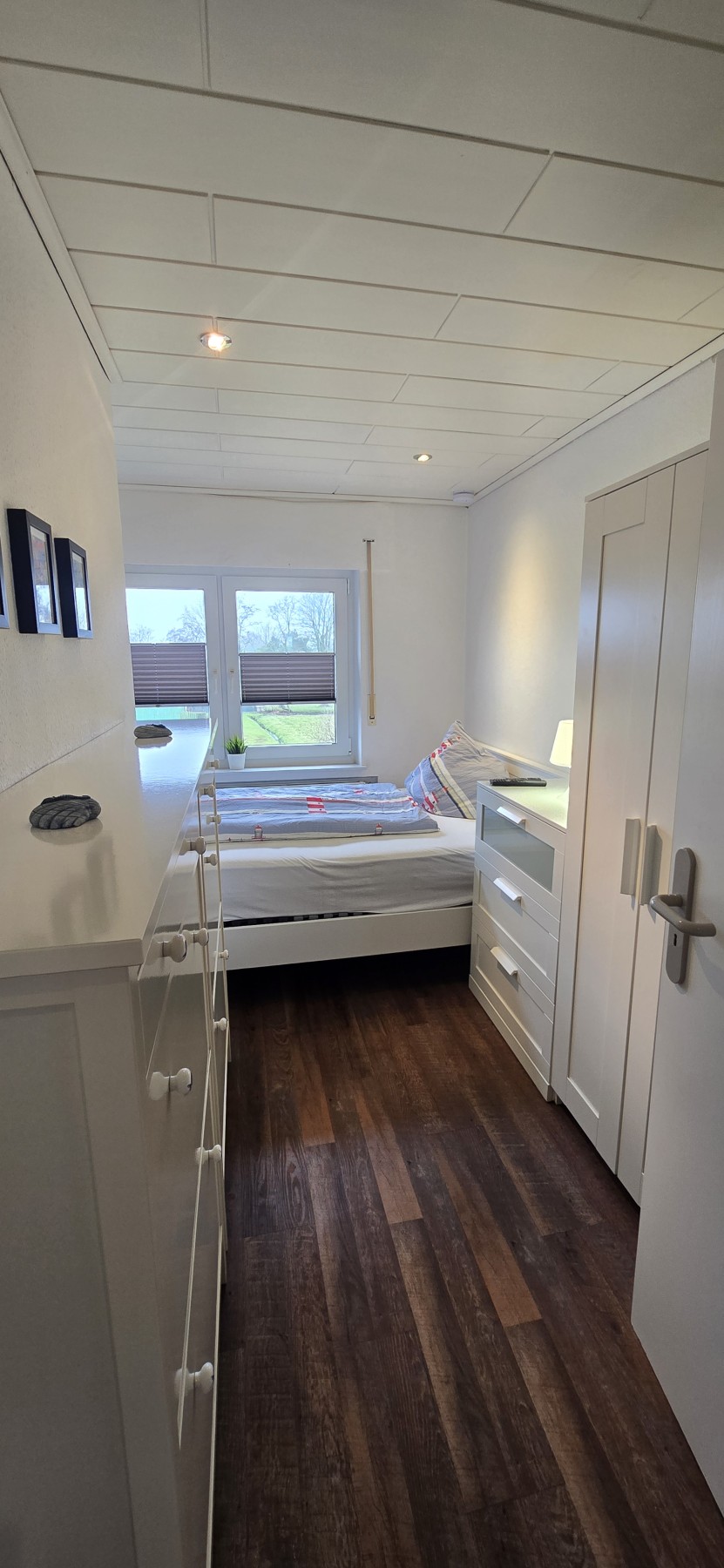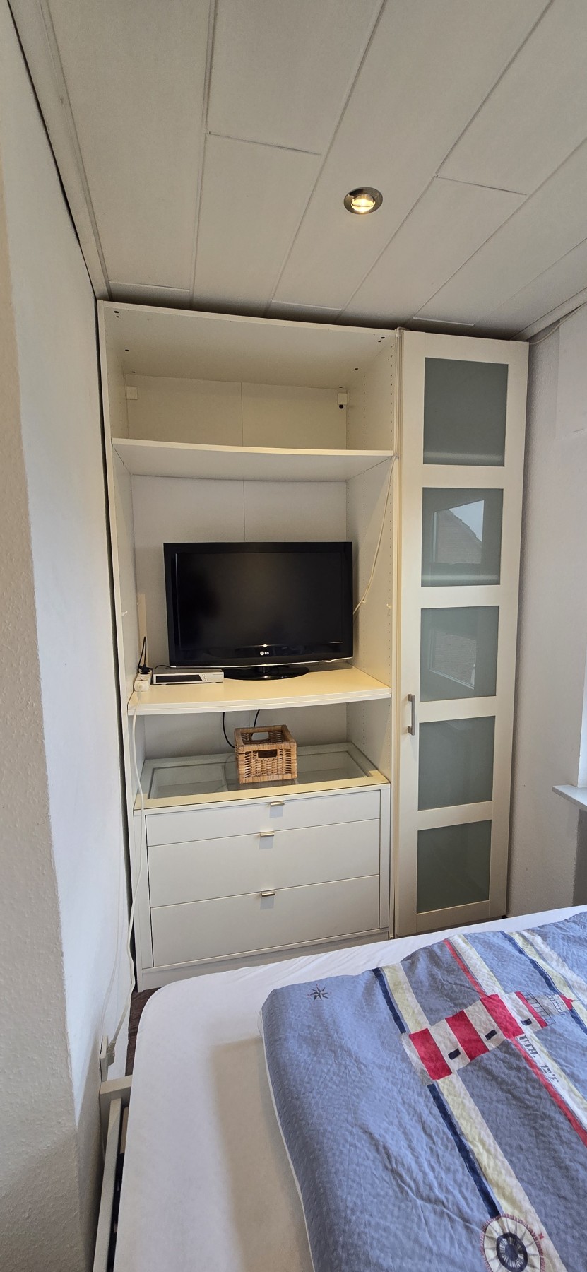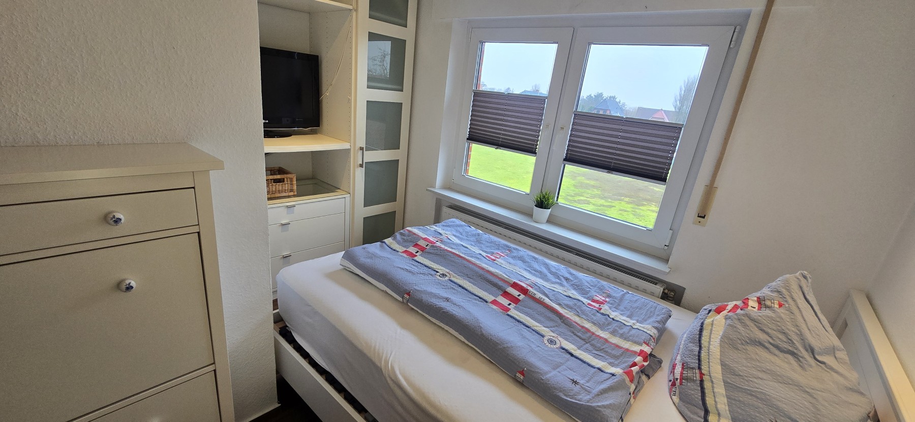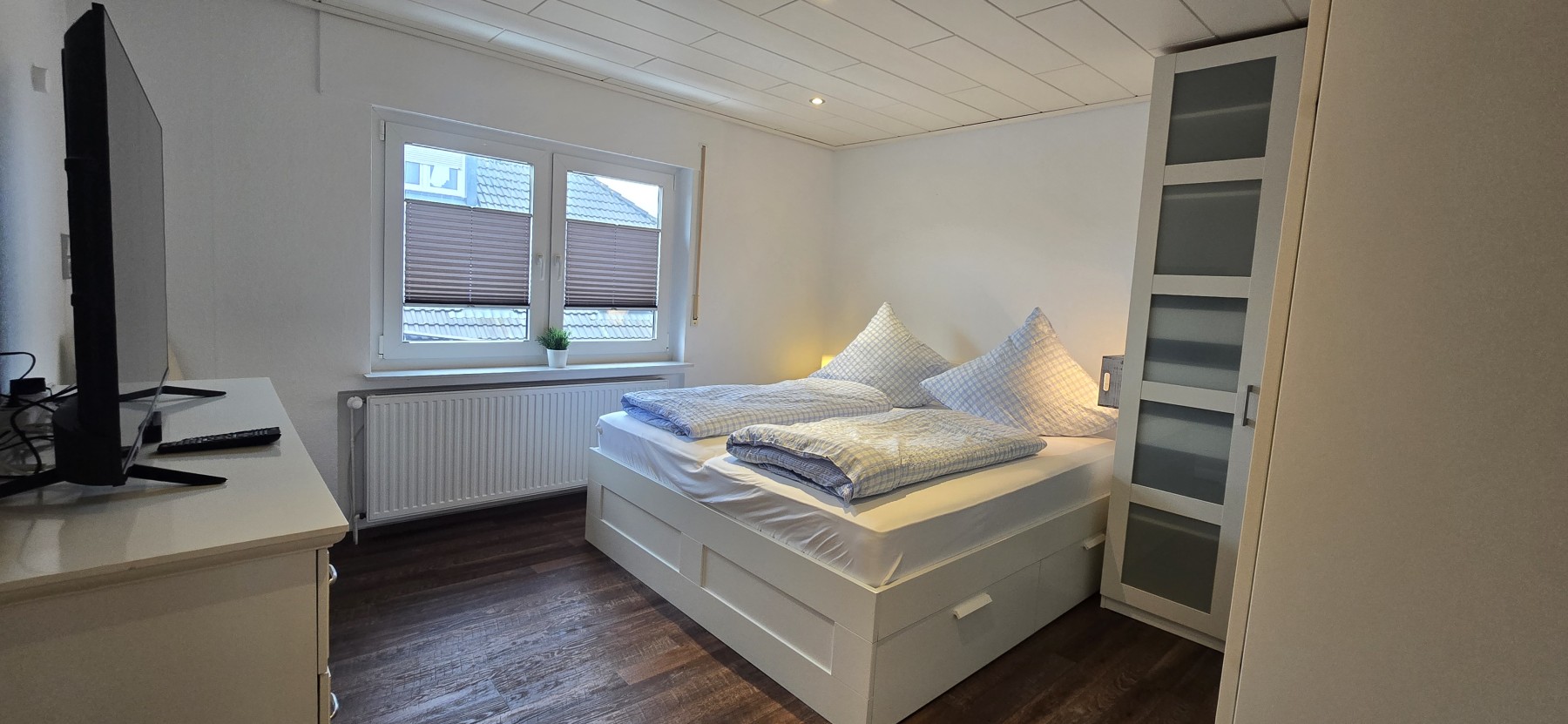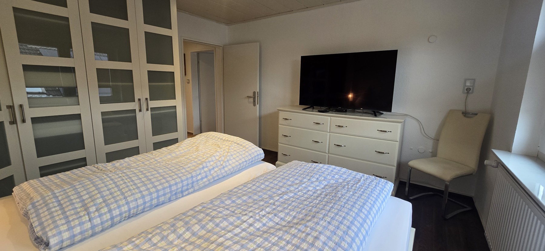 ein Schlafzimmer mit Doppelbett ein weiteres Schlafzimmer mit einem 1,40 m breiten BettDas große Wohnzimmer lädt mit einem gemütlichen Sofa, einem Kamin sowie einem großen Fernseher zum Entspannen ein.