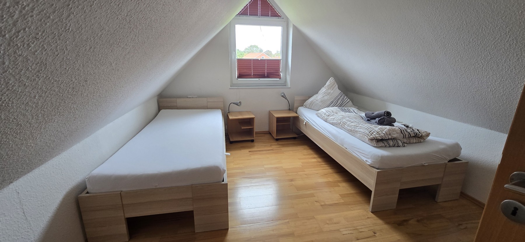 4 Personen finden ausreichend Platz aufzwei Etagen in dieser Ferienwohnung. Die Wohnung befindet sich in derersten Etage und verfügt übereinen großzügigen Balkon. In der unteren Etage befindet sich dasgeräumige Wohnzimmer mit Küchenzeile und Essecke, ein Schlafzimmer, undBadezimmer. In der oberen Etage unter dem Dach befindet sich einweiteres Schlafzimmer und ein WC. Backofen, Mikrowelle, Kabel-TV,DVD-Player, Stereo-Anlage, TV im Dachgeschoss und Waschmaschine gehörenzur Ausstattung.