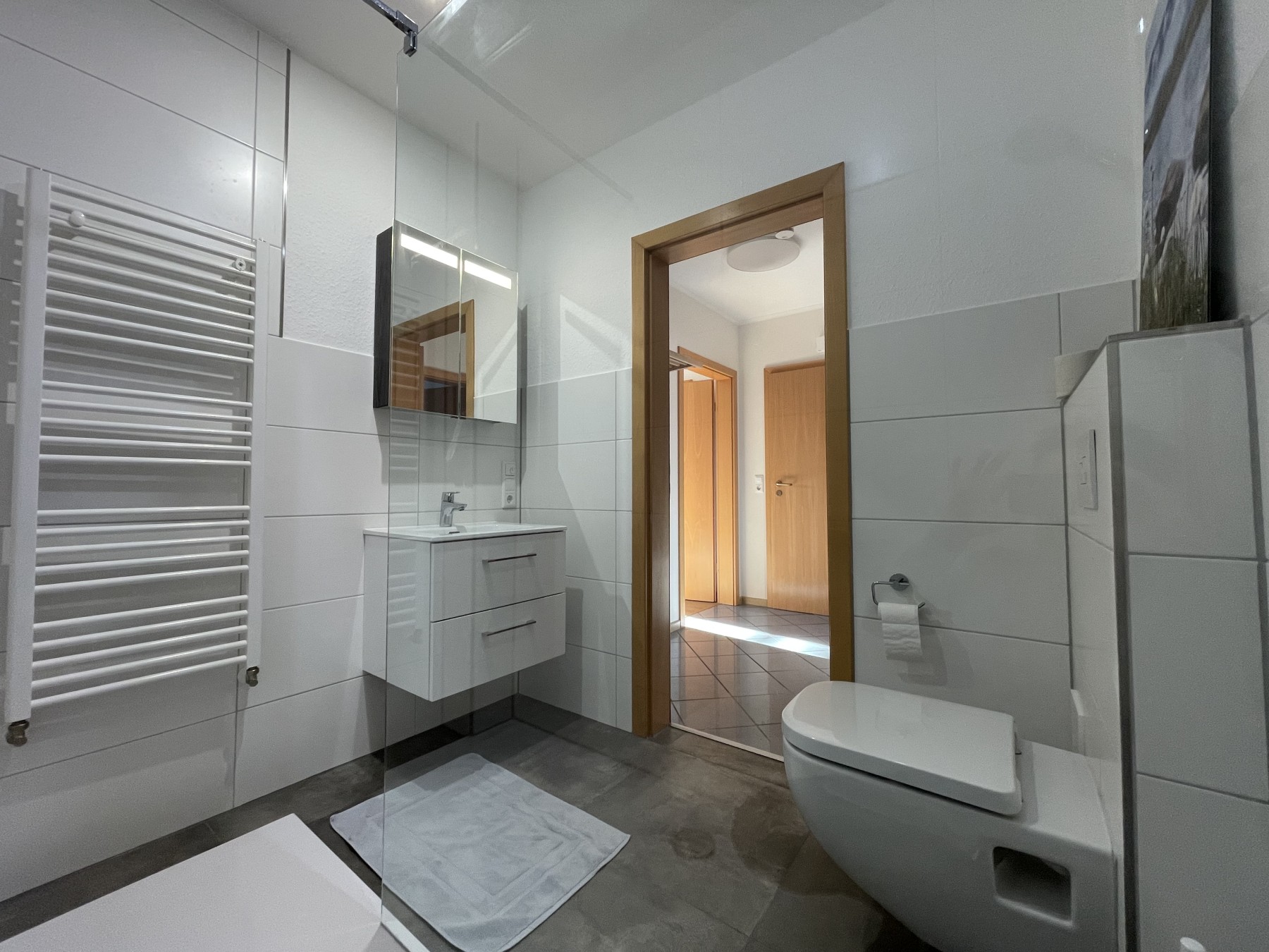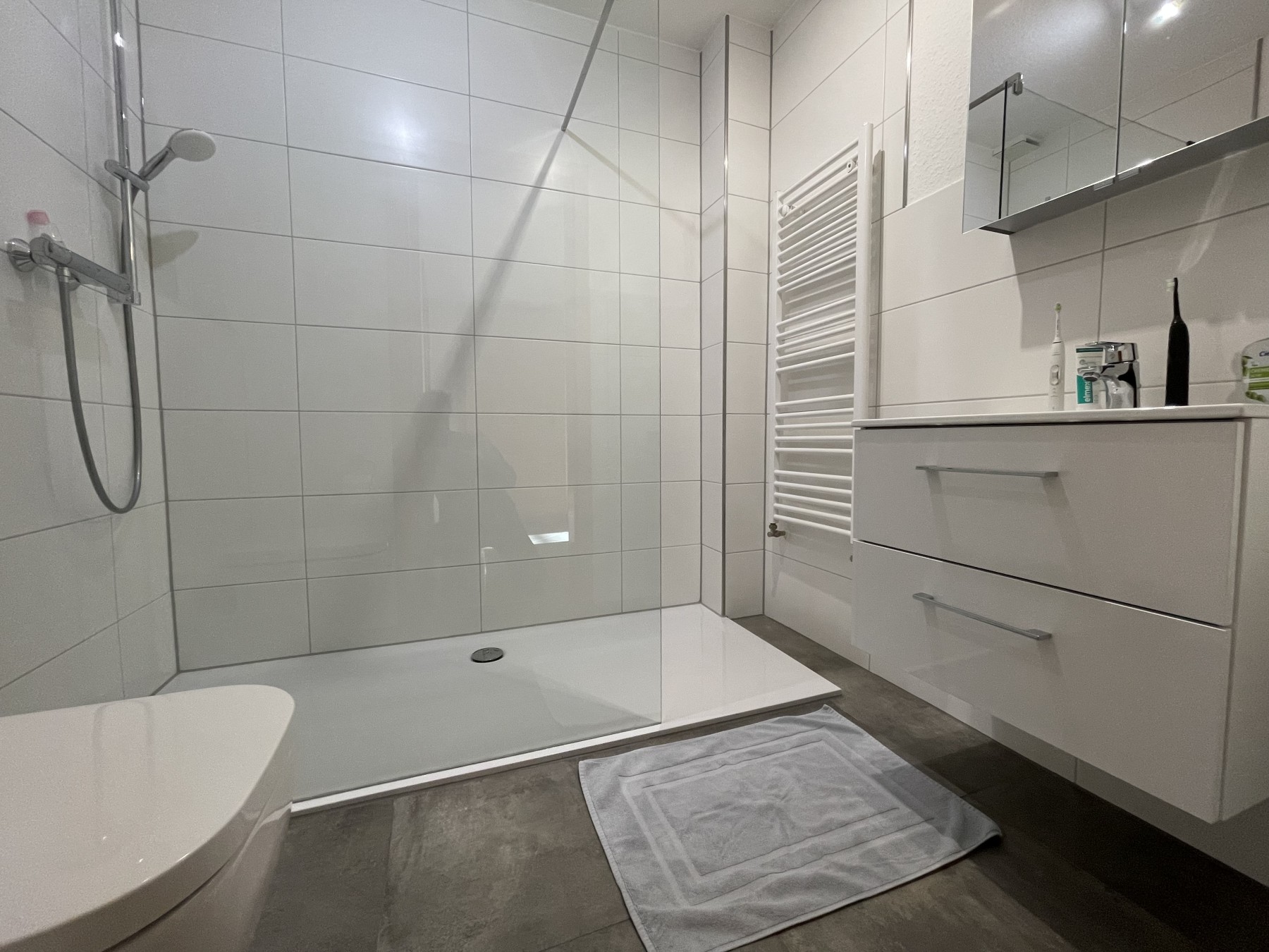 Bad mit Dusche, WC, Waschbecken und Einbauschrank