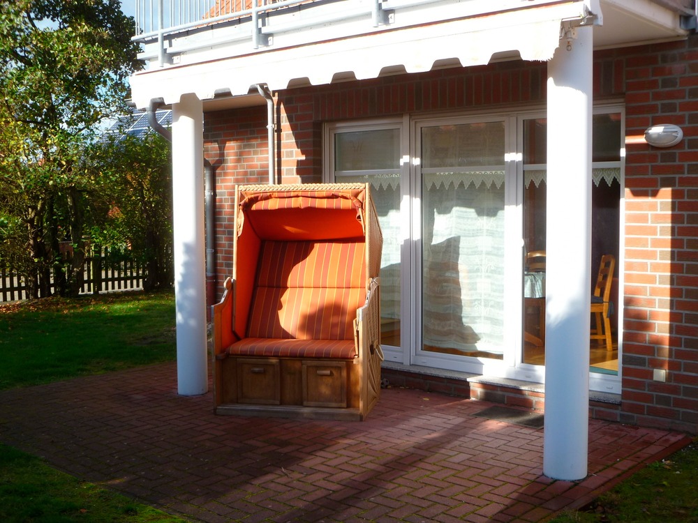 Terasse mit Strandkorb und Gartenmöbeln ; Liegewiese vorhanden