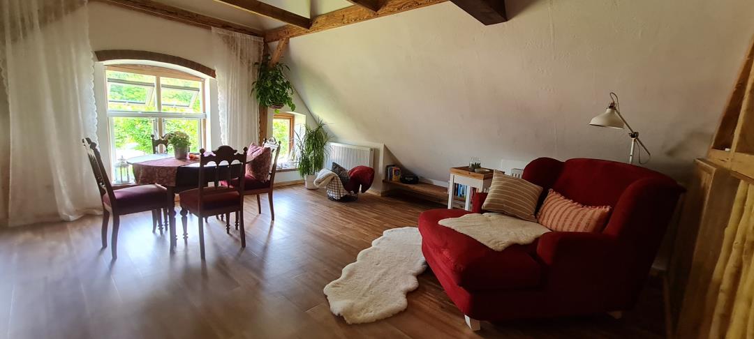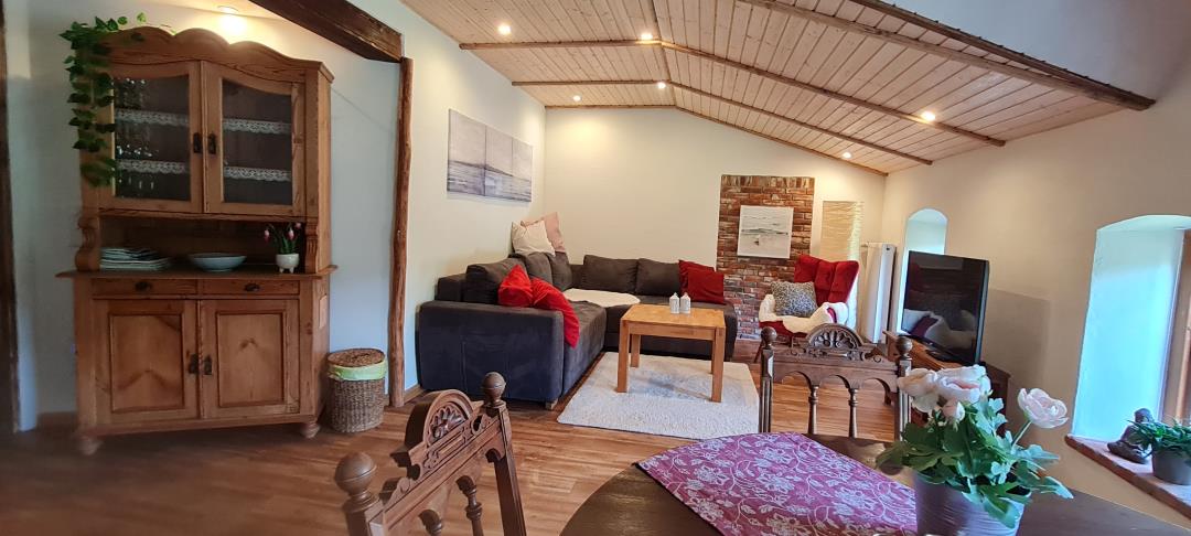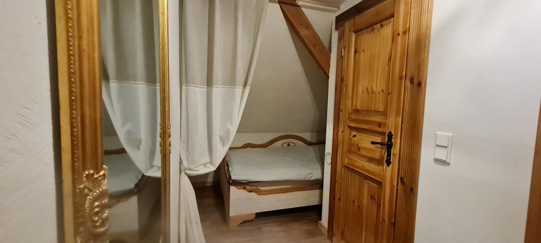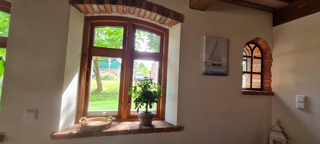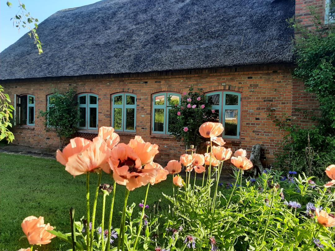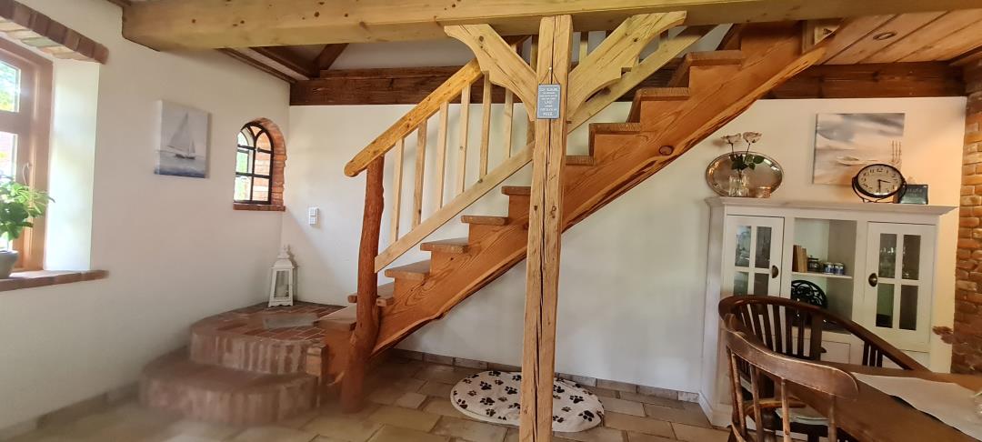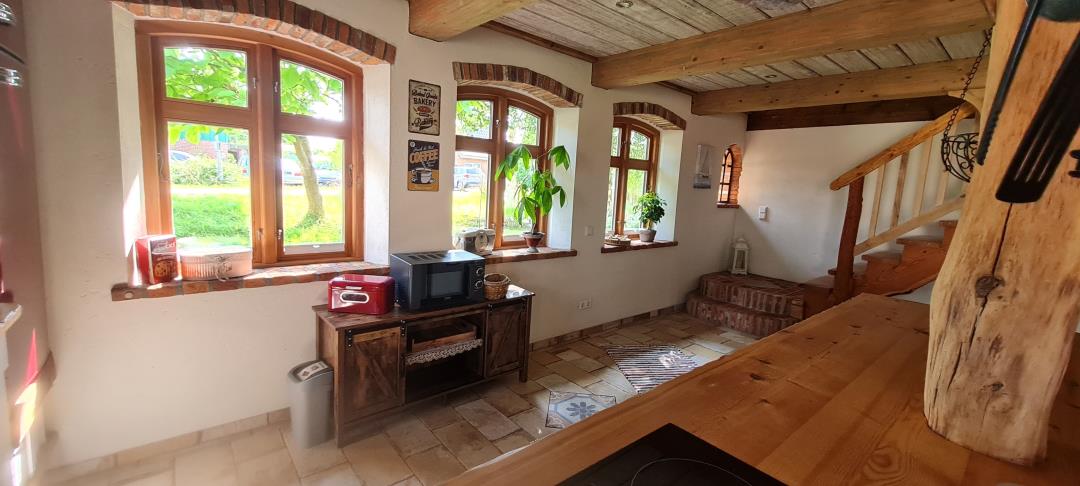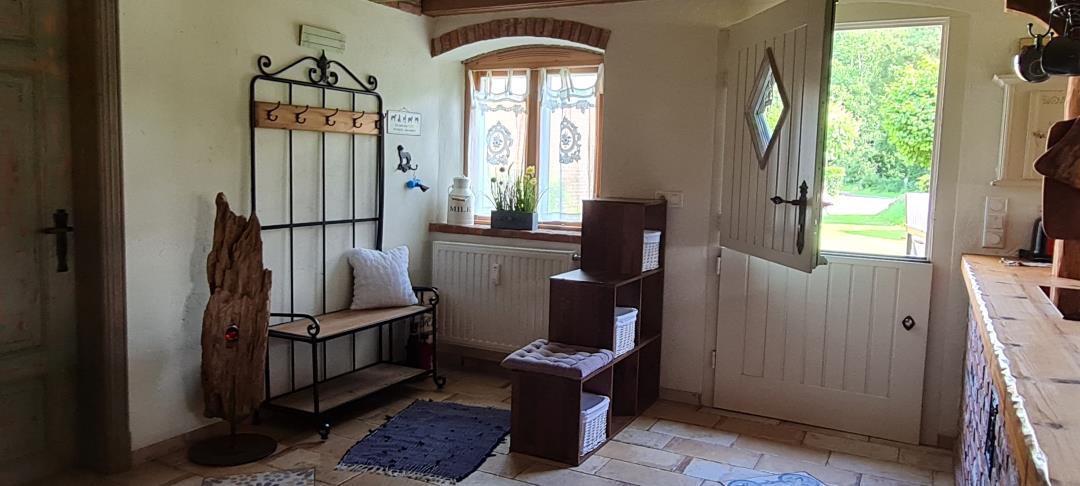 Auf unserem schönen reetgedeckten Hof haben wir für Sie eine sehr gemütliche und individuelle Ferienwohnung neu erbaut, die ab sofort bezugsfertig ist. Die etwa 90m² große Wohnung verfügt über 2 Etagen. Sie ist für 2 bis 5 Personen geeignet. Unten finden sie eine große Wohnküche, ein Badezimmer mit Dusche, die Garderobe und einen Abstellraum vor. In der oberen Etage befindet sich ein großzügiger Wohnraum. Hier steht ihnen ein Ecksofa mit Schlaffunktion zur Verfügung. Ein separates Schlafzimmer mit Doppelbett sowie eine weitere Schlafmöglichkeit (Einzelbett) und ein WC mit Waschbecken. Außerdem halten wir einen eigenen Gartenbereich und einen PKW-Stellplatz auf dem Grundstück für sie bereit. Hunde sind bei uns herzlich willkommen, nach Absprache kann auch ein Pferd mitgebracht werden. Der Hof befindet sich in Ortsrandlage, sodass sie hier direkt ab Haustür ausgedehnte Spaziergänge, Fahrradtouren oder auch Ausritte in der ruhigen und ländlichen Umgebung genießen können. Zur Wohnungsausstattung: eigener Hauseingang eigener Gartenteil, Fußbodenheizung, zweites TV-Gerät im Schlafzimmer (SMART), Radio/CD-Player, Glasfaseranschluss, Gartenmöbel inkl. Auflagen, Kinderbett u. Hochstuhl, Mikrowelle, Kaffeemaschine, Wasserkocher, Toaster, Pürierstab, Mixer, Haartrockner, Bügeleisen/-brett, Wäscheständer und Reinigungsutensilien. Bettwäsche und Handtücher inkl. (Strandtücher bitte selbst mitbringen),