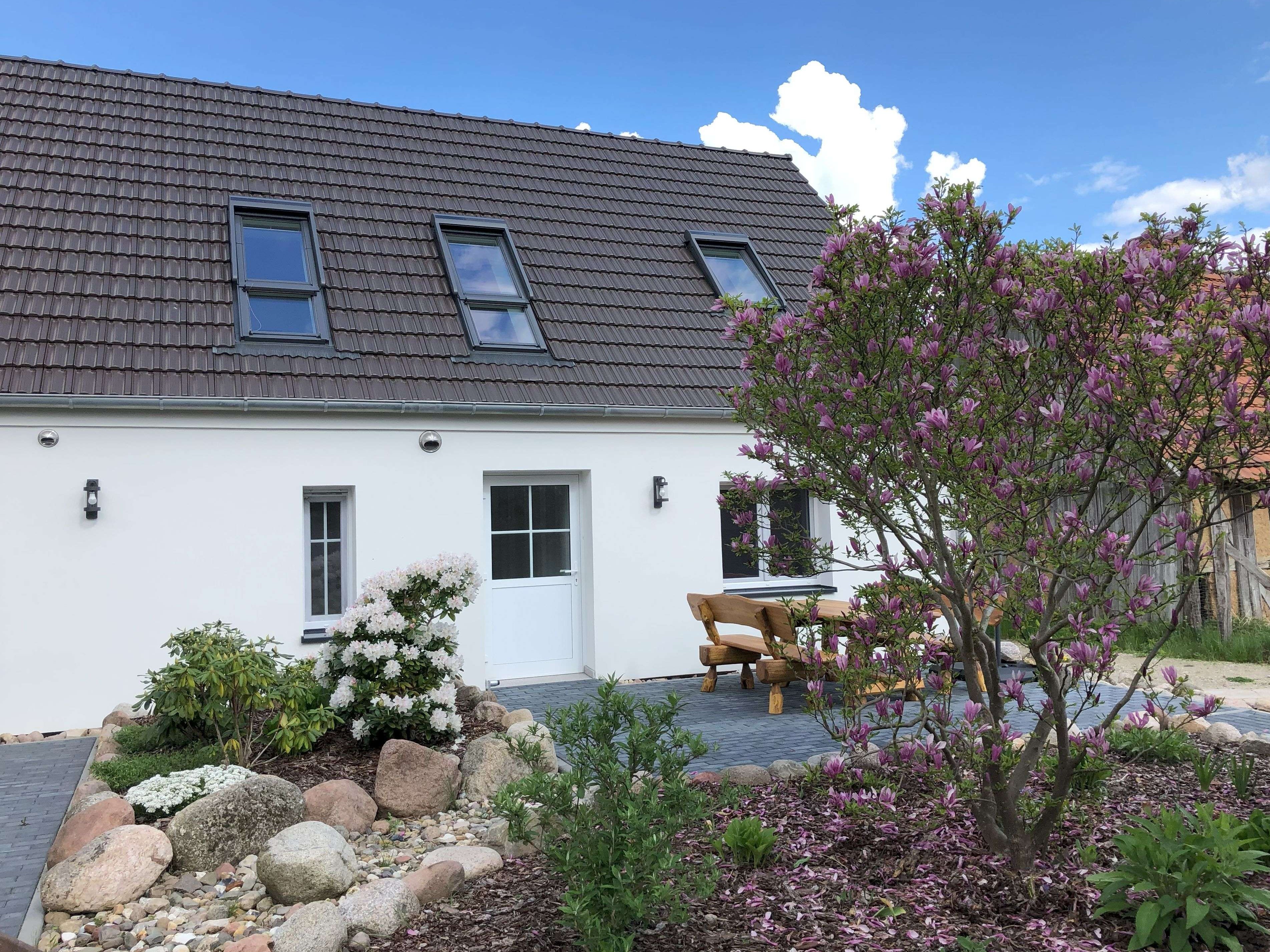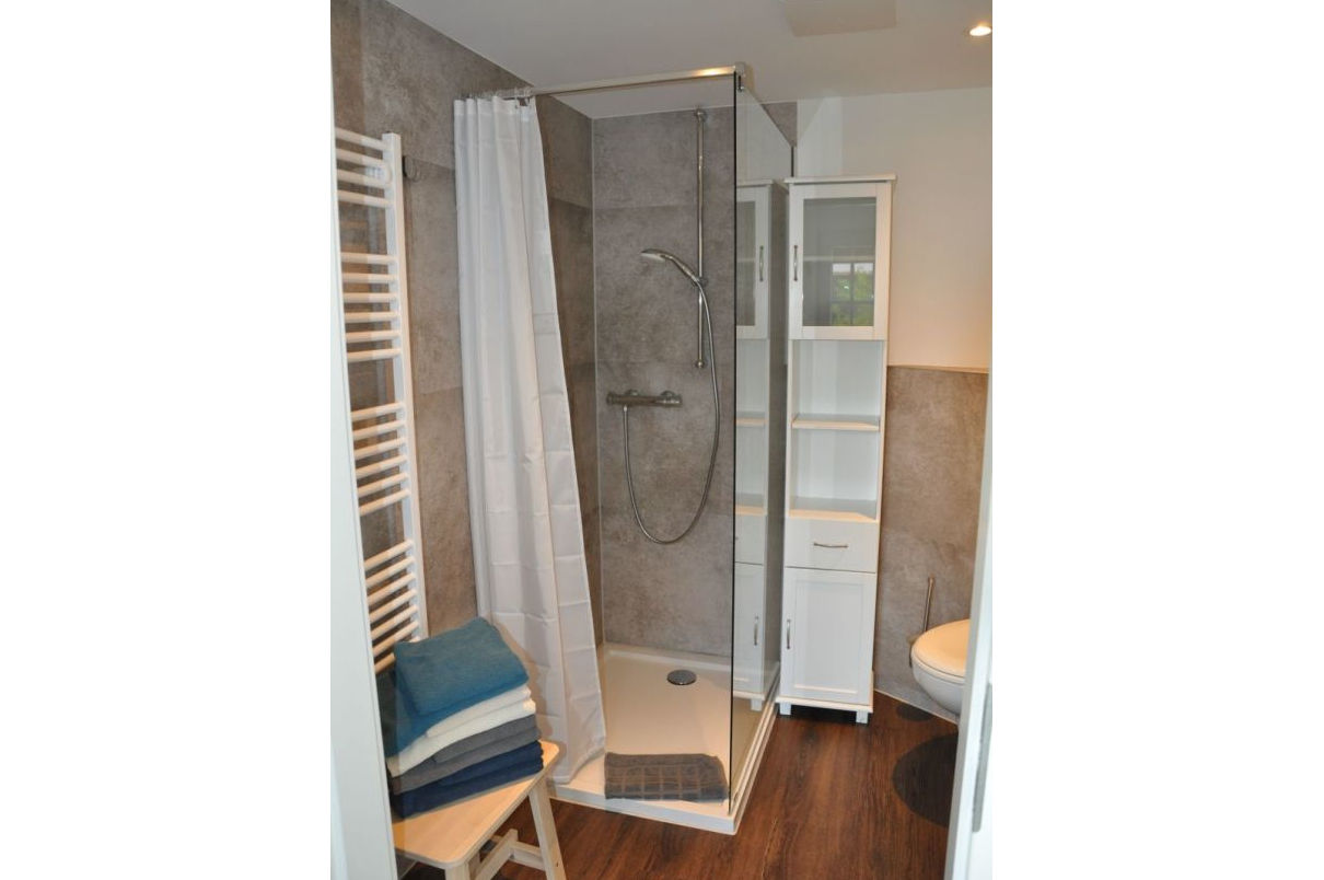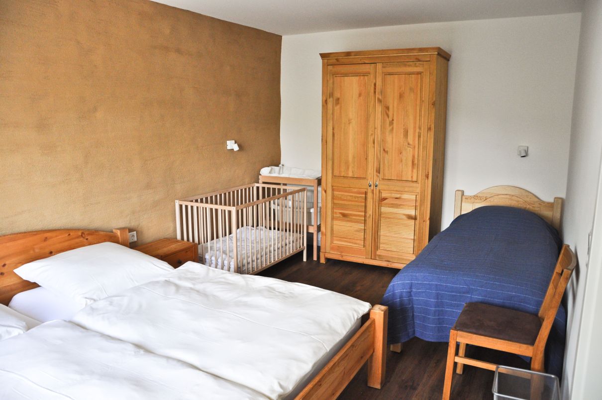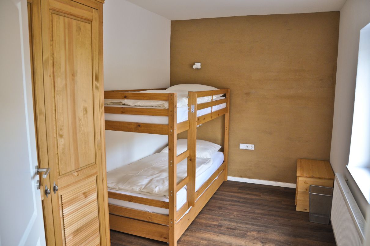 Auf einem benachbarten Grundstück haben wir in einem ehemaligen Bauernhaus ein Ferienhaus untergebracht. Dieses wurde 2020 komplett saniert und umgebaut. Es beherbergt zwei Ferienwohnungen für je 4-6 Personen. Die Wohnungen lassen sich über eine Tür im Treppenhaus koppeln, so dass größere Gruppen (8 – 14 Personen plus ein bis zwei Kleinkinder) das komplette Haus gemeinsam nutzen können.