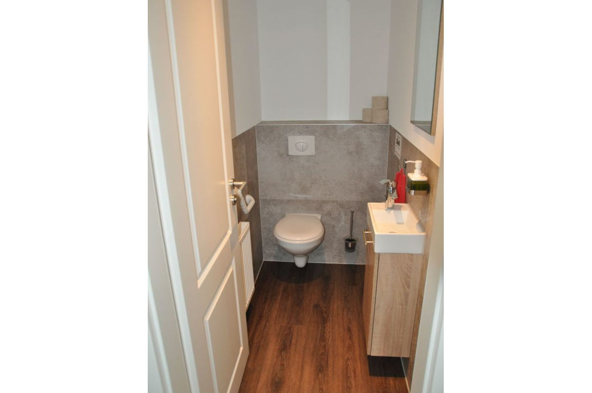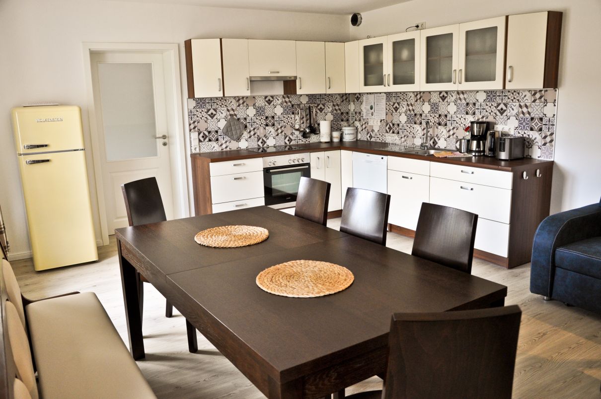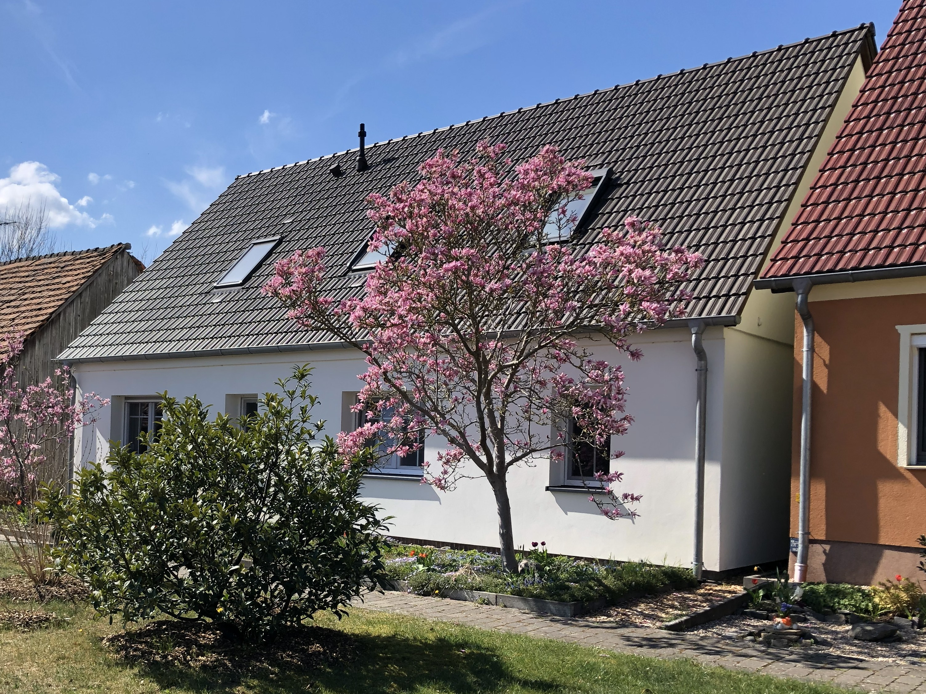 Auf einem benachbarten Grundstück haben wir in einem ehemaligen Bauernhaus ein Ferienhaus untergebracht. Dieses wurde 2020 komplett saniert und umgebaut. Es beherbergt zwei Ferienwohnungen für je 4-6 Personen. Die Wohnungen lassen sich über eine Tür im Treppenhaus koppeln, so dass größere Gruppen (8 – 14 Personen plus ein bis zwei Kleinkinder) das komplette Haus gemeinsam nutzen können.