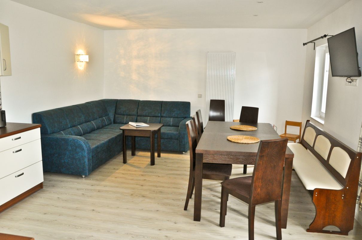Die Bauernstube (73 m²) befindet sich im Erdgeschoss des Hauses. Hier gibt es zwei Schlafzimmer mit je drei Schlafgelegenheiten. Ein Schlafzimmer hat ein Doppelbett, ein Einzelbett und ein Kleinkindbett sowie einen Kleiderschrank und einen Wickeltisch. Im zweiten Schlafzimmer stehen ein Doppelstockbett und bei Bedarf eine Liege sowie ein Kleiderschrank. Die große Wohnküche bietet mit einer vollausgestatteten Küche, einem Esstisch für bis zu 12 Personen, einer großen Couch, einer Spielecke und einem Fernseher Platz und Raum für gemeinsames Zusammensein. Reicht der Platz in den beiden Schlafzimmern nicht aus, kann das Sofa zum bequemen Doppelbett umfunktioniert werden. Außerdem hat die Wohnung ein Bad mit Dusche, Waschbecken, WC, Handtuchtrockner und Föhn sowie ein separates Gäste-WC.