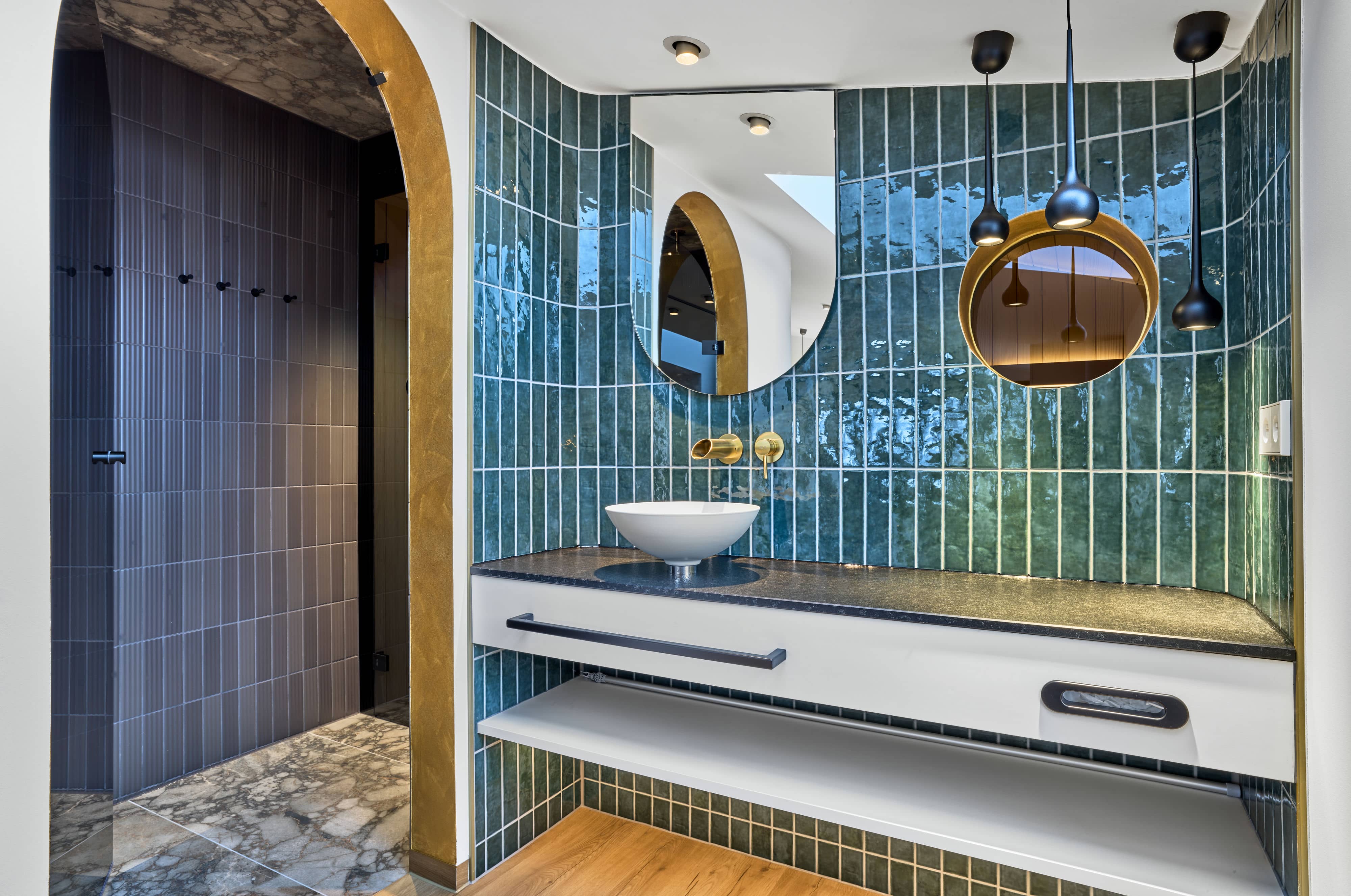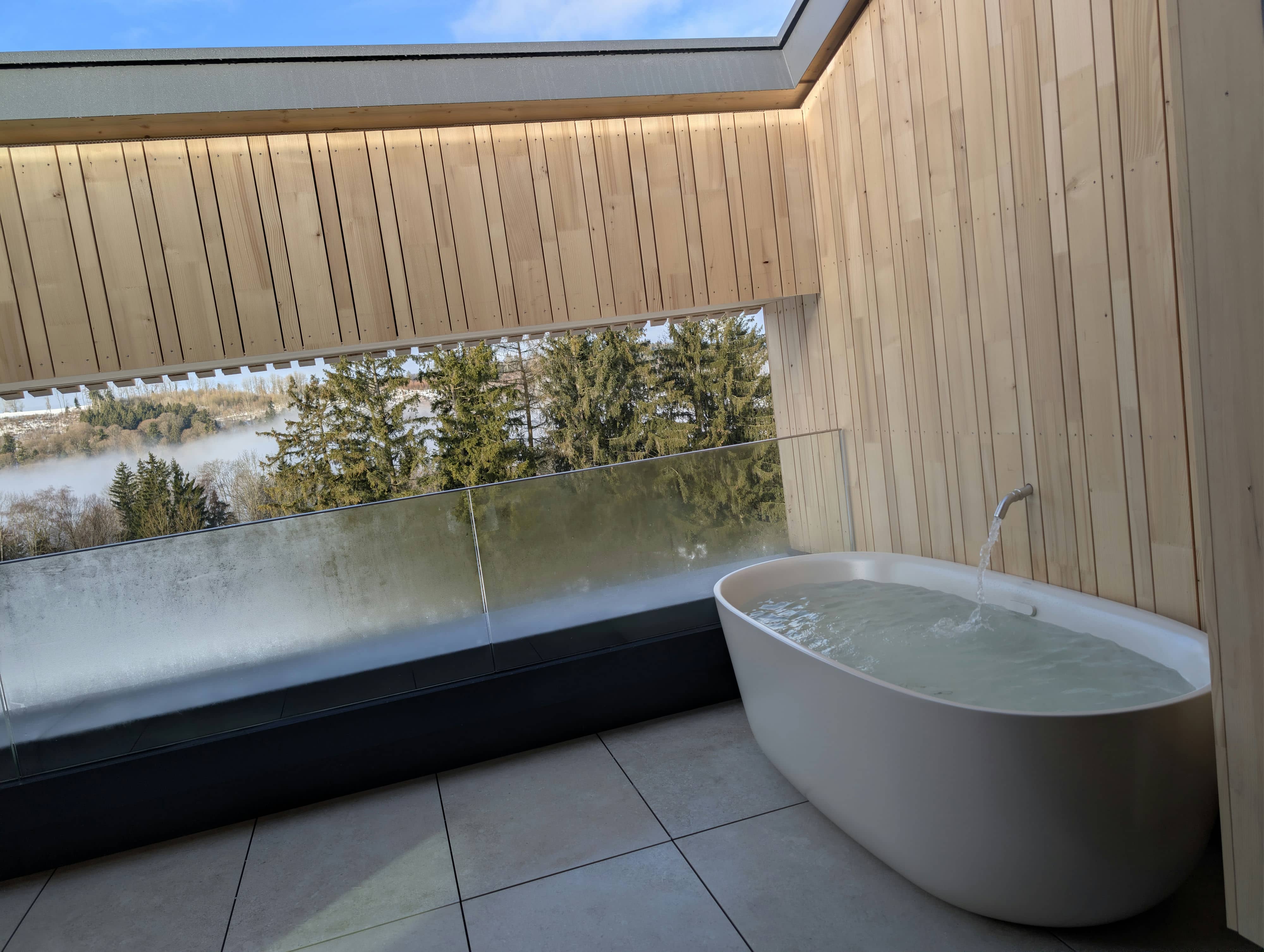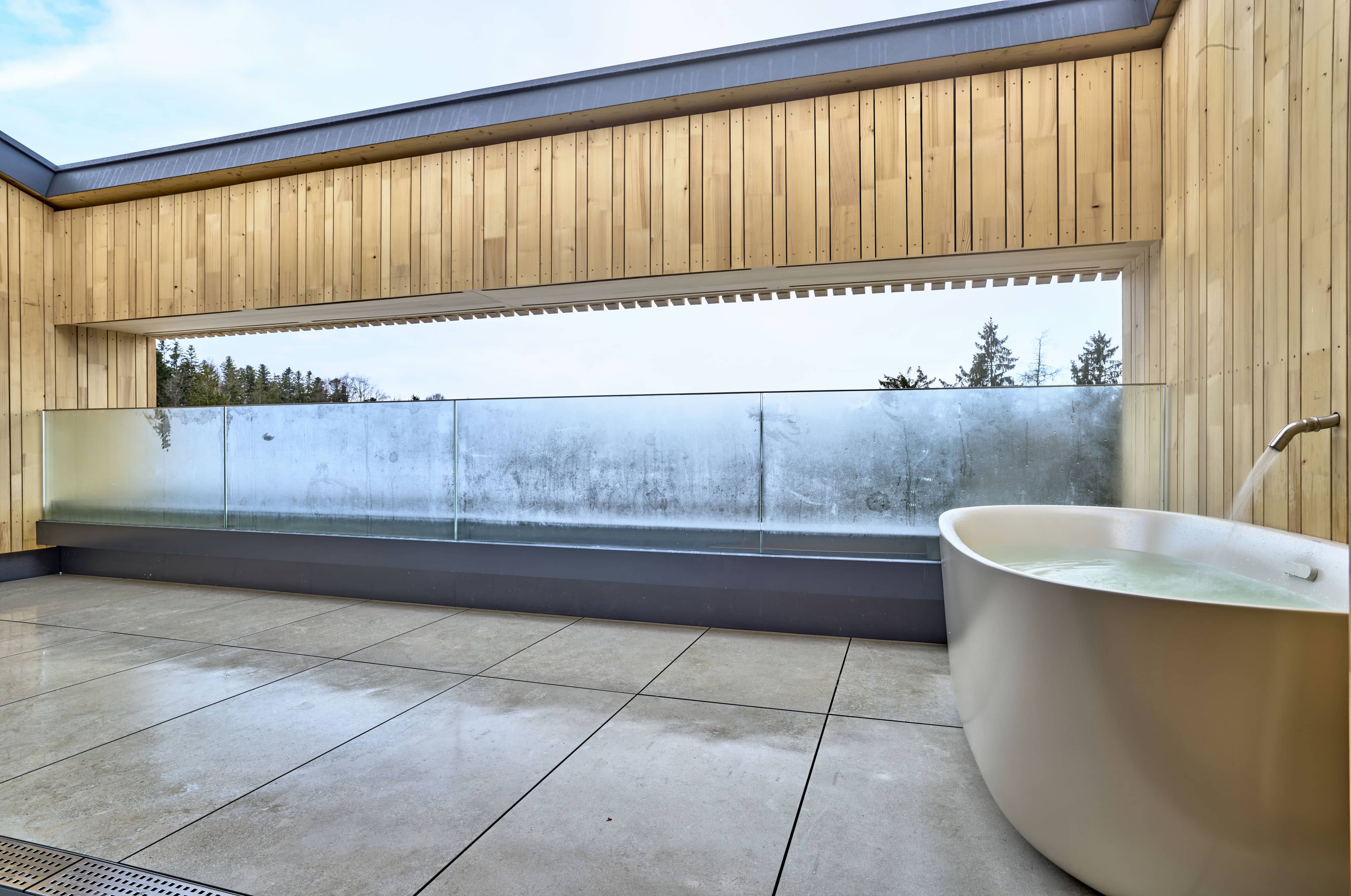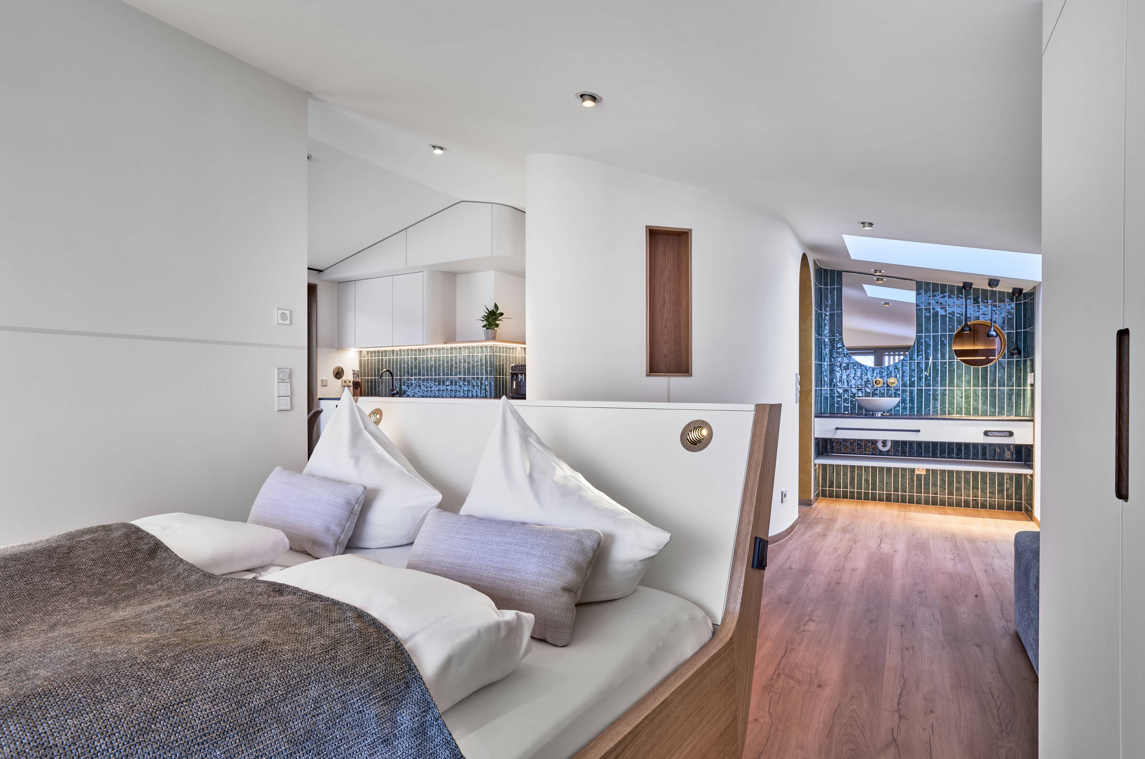 Das Apartment überzeugt durch harmonische Architektur, rund fließende Formen und eine große Panoramaterrasse mit freistehender Außenbadewanne.
