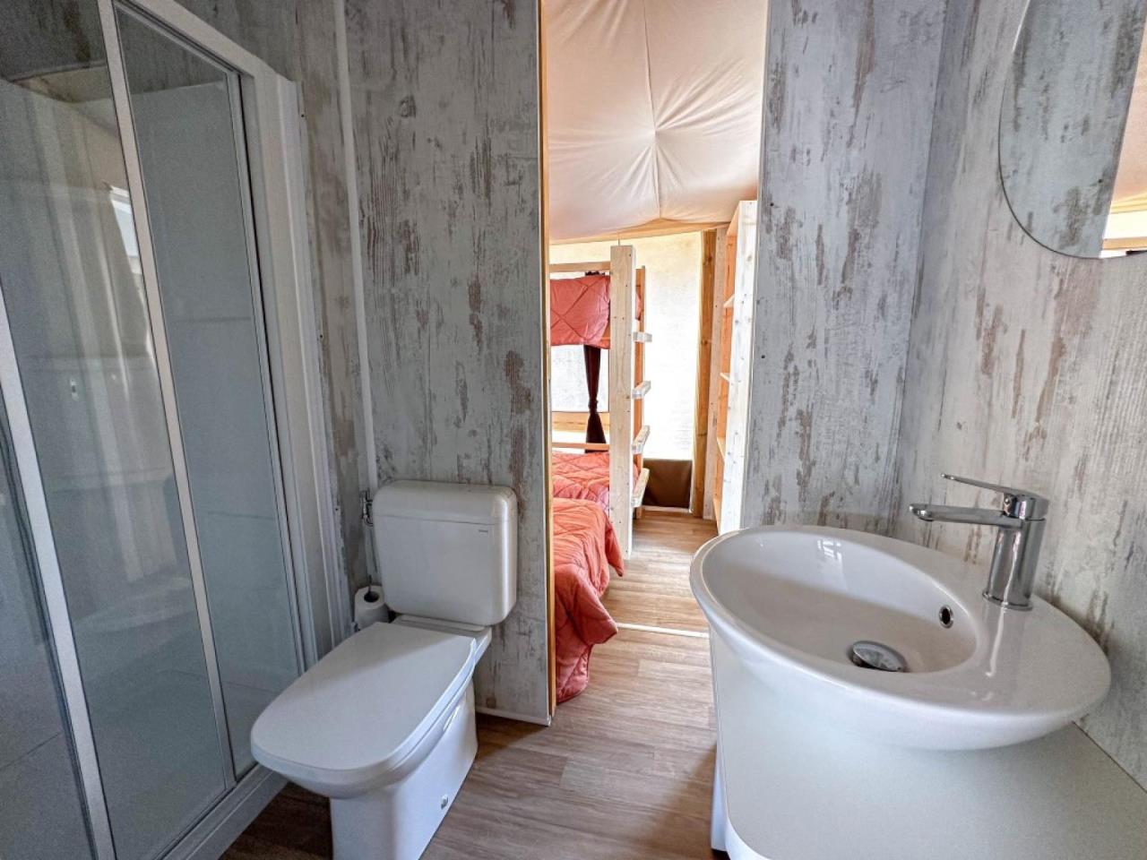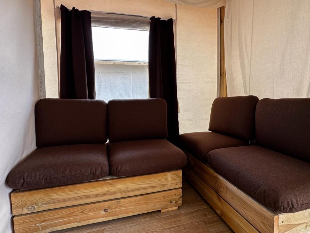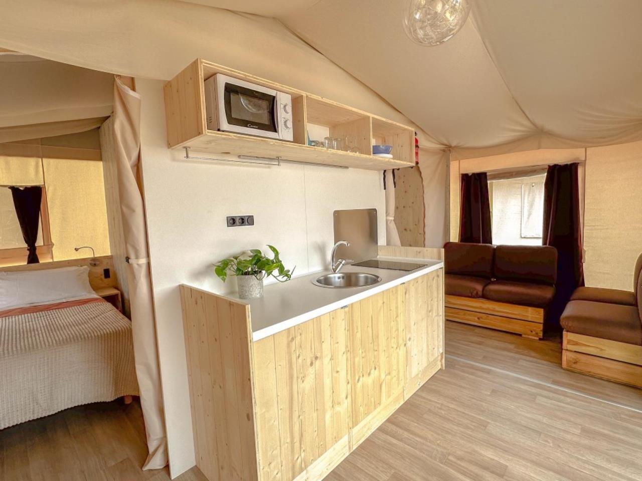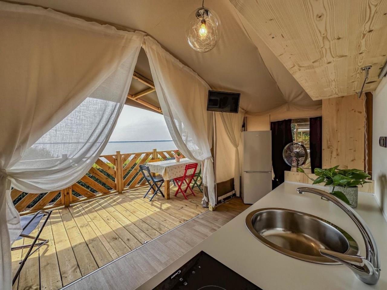 Das Wood Tent Glamping ist für alle Naturliebhaber geeignet, die das Zelten lieben, jedoch nicht auf einen gewissen Komfort verzichten möchten. Es bietet Platz für max. 5 Personen und besteht aus einem Schlafzimmer mit Doppelbett, sowie einem weiteren Schlafzimmer mit Etagenbett und Einzelbett. Der Wohnbereich verfügt über eine gut eingerichtete Küche mit Geschirr, Besteck, Pfannen, Mikrowelle und Kühlschrank. Ein Standventilator ist vorhanden. Das Badezimmer verfügt über ein Waschbecken, eine Dusche und ein WC. Die überdachte Aussenveranda mit Tisch, Stühlen und zwei Liegestühlen lädt zum gemütlichen Entspannen ein, während die Kinder sich auf dem Spielplatz austoben können. Fahrzeit ab ital. Grenze ca. 2h. Hinweis Wenn Sie mehr als eine Unterkunft benötigen, ist dies bei uns in der Regel möglich, da wir über mehrere Objekte des gleichen Haustyps verfügen.