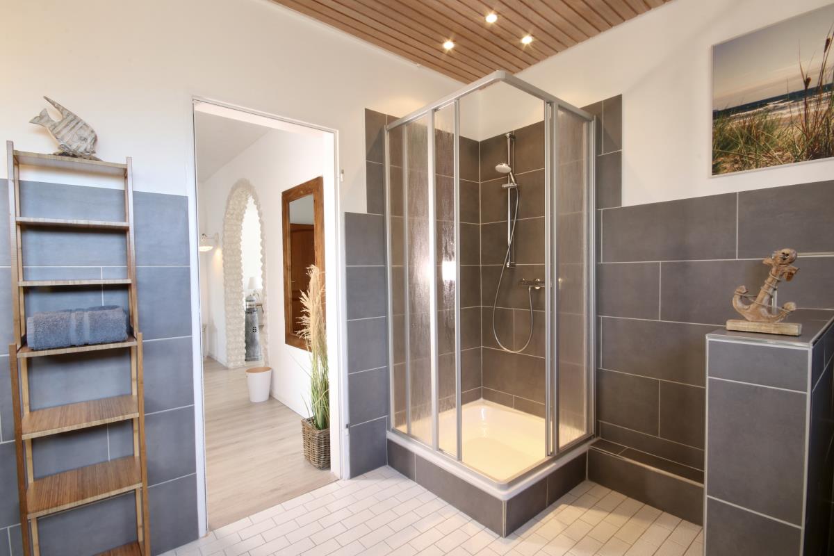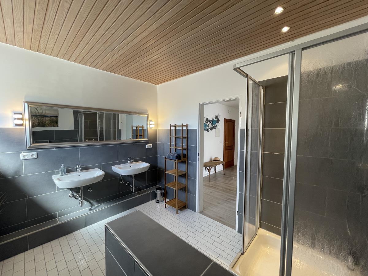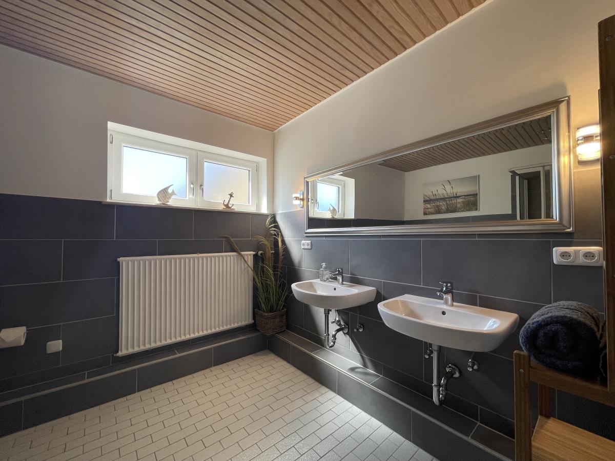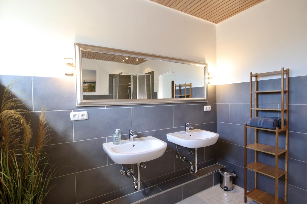 Das Bad ist gefühlt riesig. Es verfügt über zwei Waschtische, ein Außenfenster und einen Duschbereich. Das Schlafzimmer mit herrlich bequemen Bett (160x200) und shabby-schickem Kleiderschrank für die Urlaubsgarderobe hat ein gescheites Verdunkelungsrollo vor dem Fenster, so dass wir die ersten Sonnenstrahlen auch mal ein bisschen länger draussen lassen können, um uns einfach noch mal umzudrehen- wir sind doch im Urlaub! Vor dem Schlafzimmer befindet sich ein kleiner kuscheliger Rückzugsort, der sich genau für die Momente eignet, wenn das Wetter besonders friesisch und das Buch richtig spannend wird. Wenn man das Sofa ausklappt ist es aber ein supergemütliches Schlafzimmer. Mit wenigen Handgriffen gibt´s hier eine Liegefläche von 140x200cm.