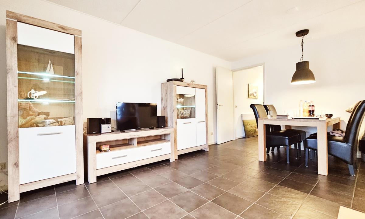 Der gemütliche Wohnraum mit integriertem Essbereich ist modern und geschmackvoll eingerichtet. Von hier aus gelangen Sie direkt auf die Terrasse und in den Garten, wo Sie die frische Inselluft und entspannte Stunden genießen können. Für Unterhaltung steht Ihnen ein Smart-TV zur Verfügung.