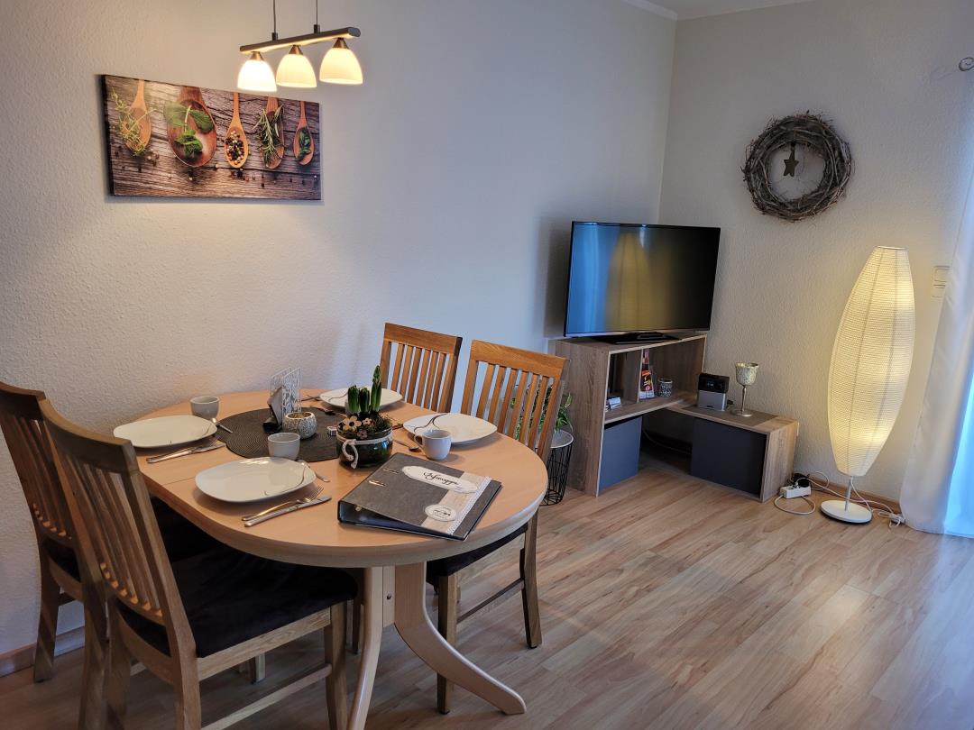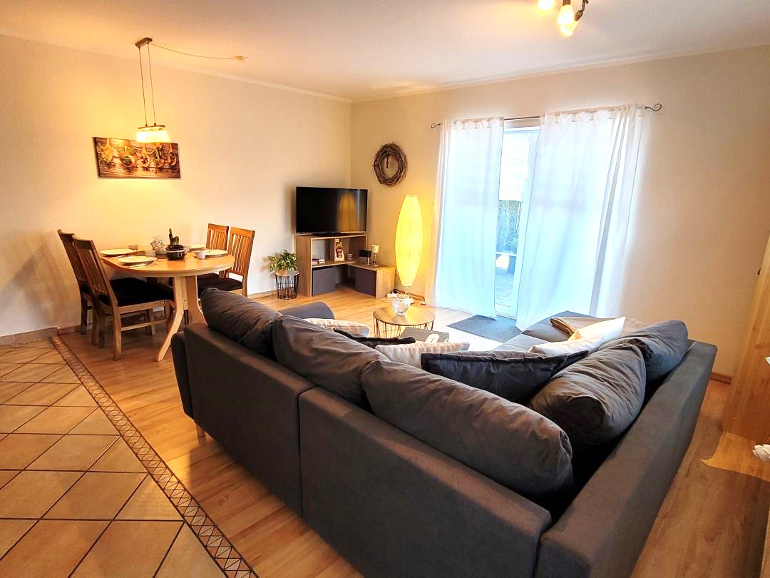 Der Wohn- und Essbereich bietet ein gemütliches Sofa, einen Smart-TV und einen Zugang zur Terrasse. Am Esstisch finden bis zu 4 Personen ausreichend Platz.