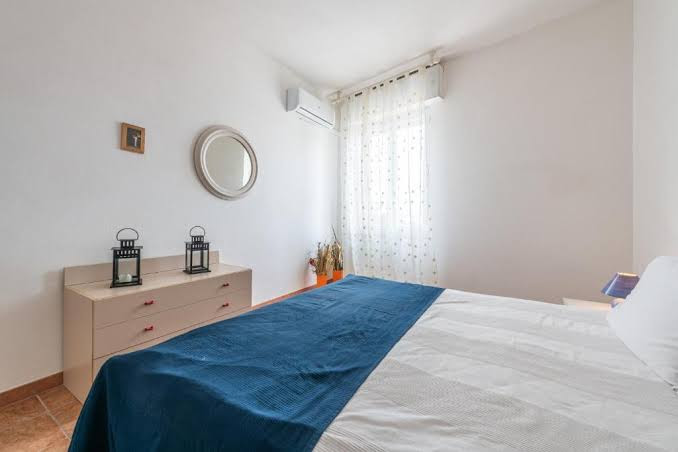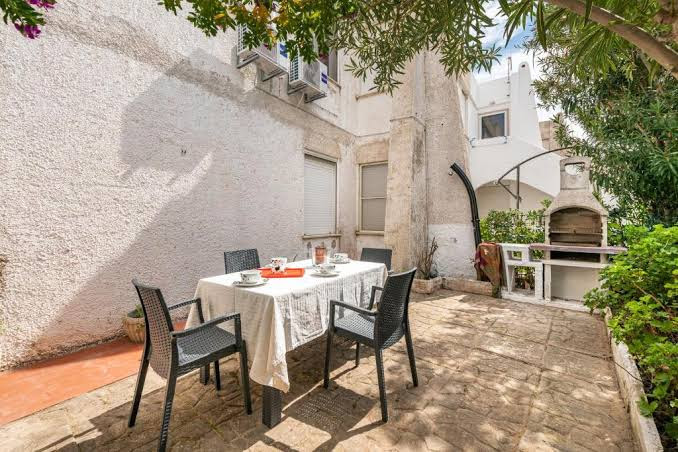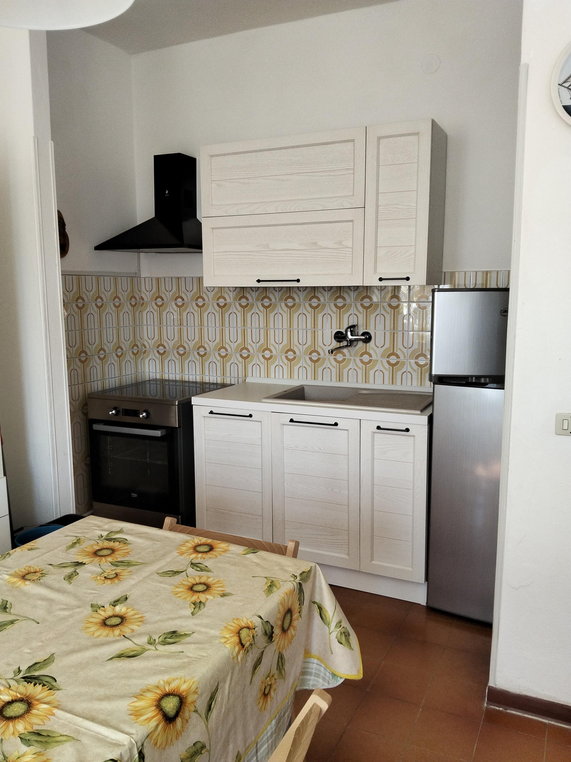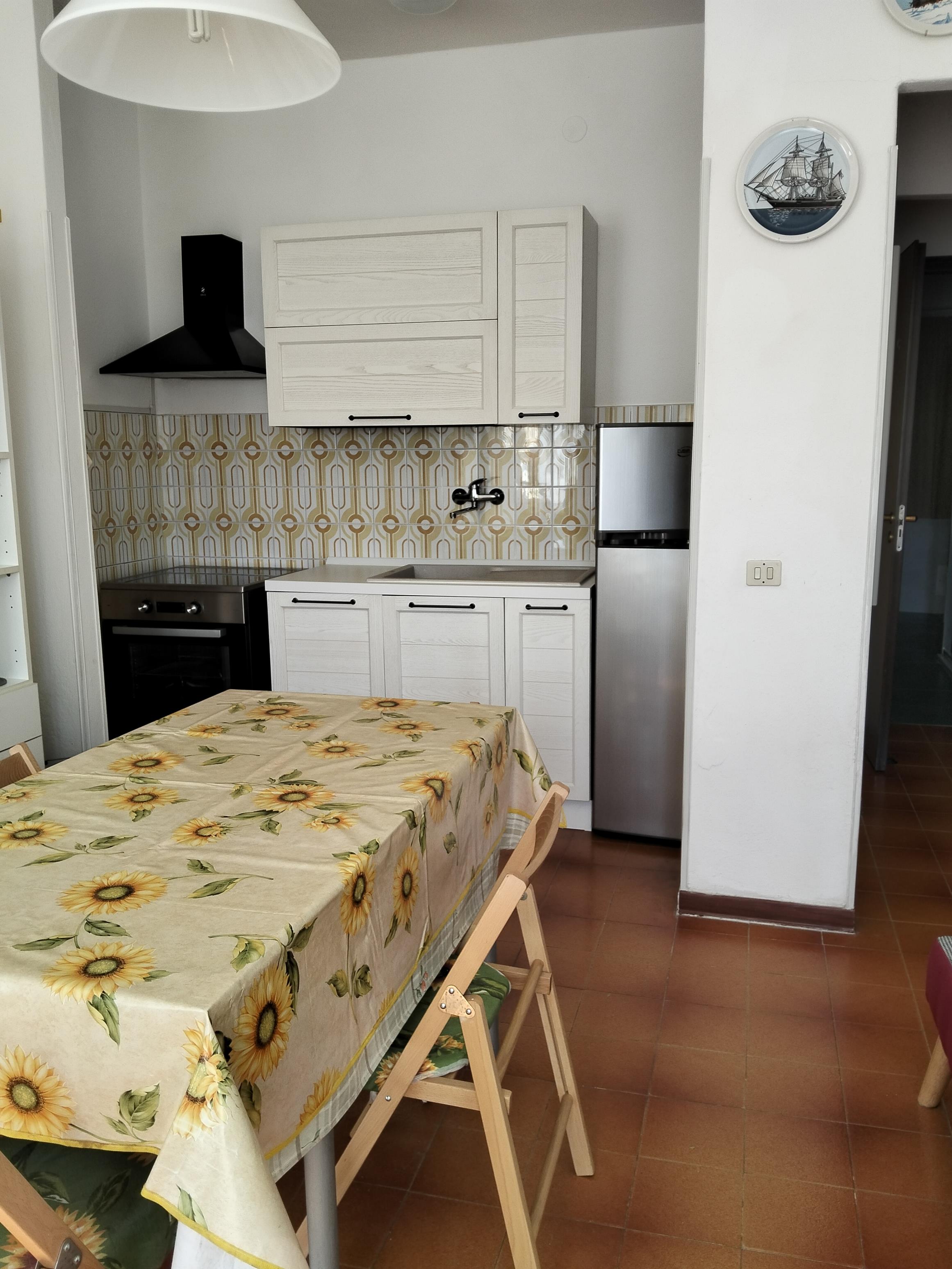 Il trilocale ristrutturato si trova al primo piano e vanta una splendida vista mare. L'appartamento può ospitare un massimo di 5 adulti oppure 4 adulti e 2 bambini (fino a 10 anni). Dispone di una camera da letto con letto matrimoniale e di una seconda camera con due letti singoli. Nella zona pranzo, il divano letto offre un ulteriore posto letto per due bambini (fino a 10 anni) o per un adulto. L’angolo cottura, ben attrezzato, è inserito nella zona giorno e comprende fornelli, pentole, stoviglie, posate, microonde, forno, una moka per il caffè e un frigorifero con scomparto freezer. Per garantire il massimo comfort nelle giornate più calde, sono presenti in totale tre condizionatori: un apparecchio separato per ciascuna delle due camere da letto e uno per la zona giorno. Il bagno, finestrato, è dotato di doccia, lavatrice, lavabo, bidet e WC. Oltre al balcone, l'appartamento dispone di due giardini privati recintati. Il primo giardino è attrezzato con barbecue, tavolo e sedie, offrendo la cornice ideale per serate conviviali. Il secondo giardino funge da oasi di pace, arredato con accoglienti lettini per il massimo relax.