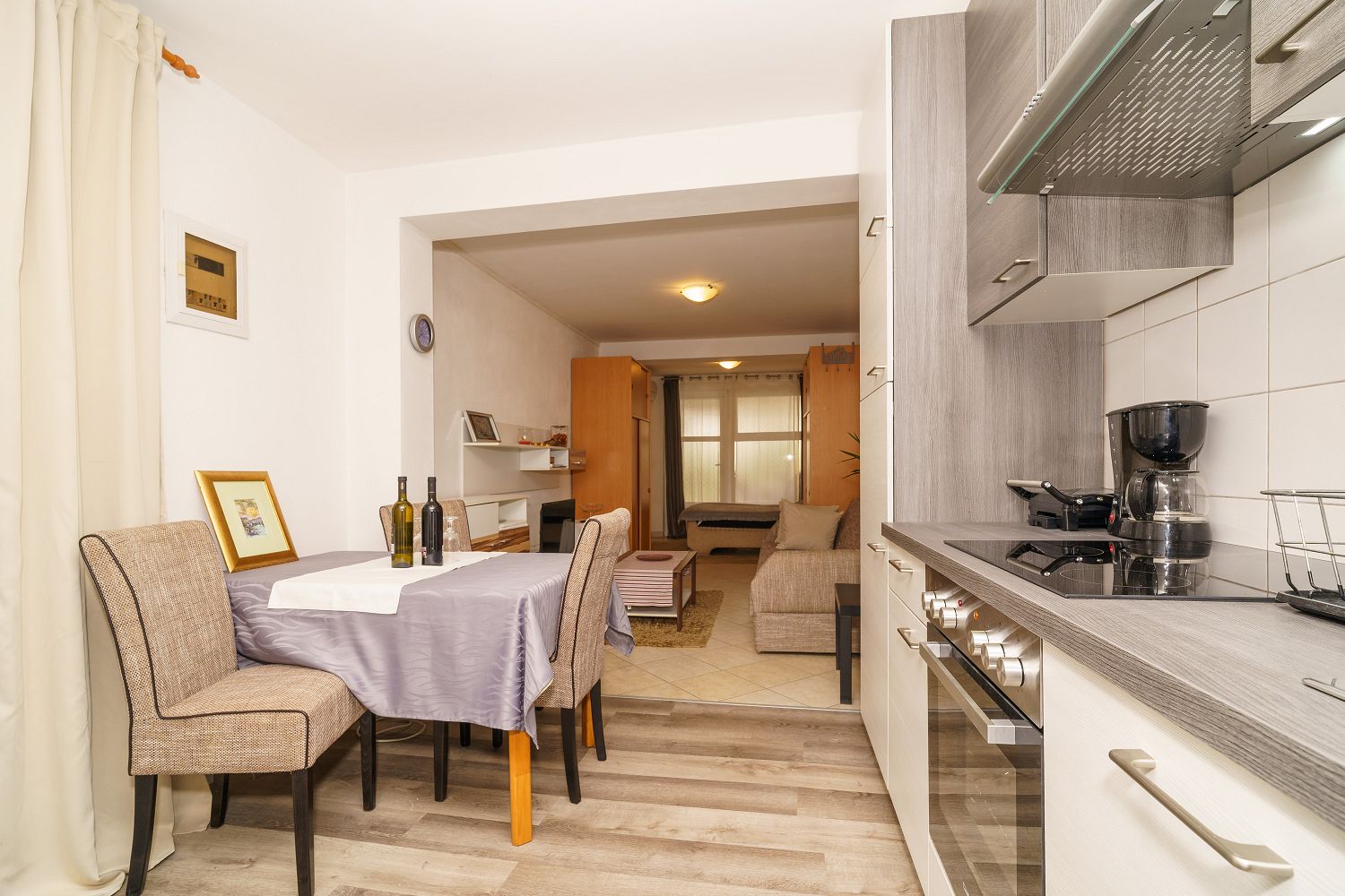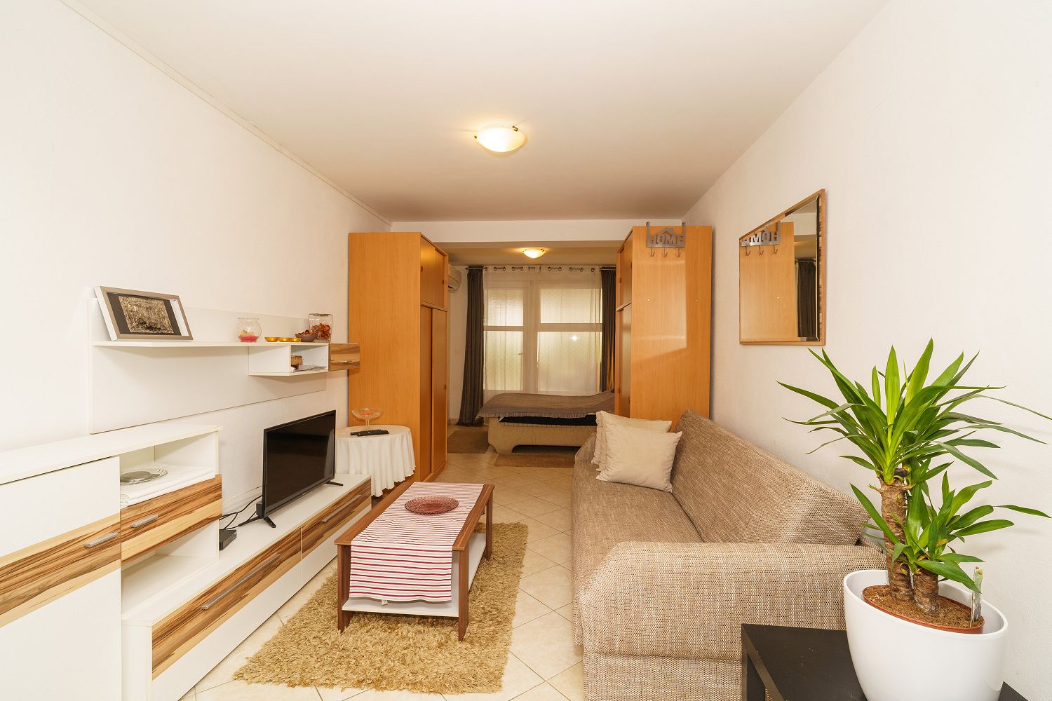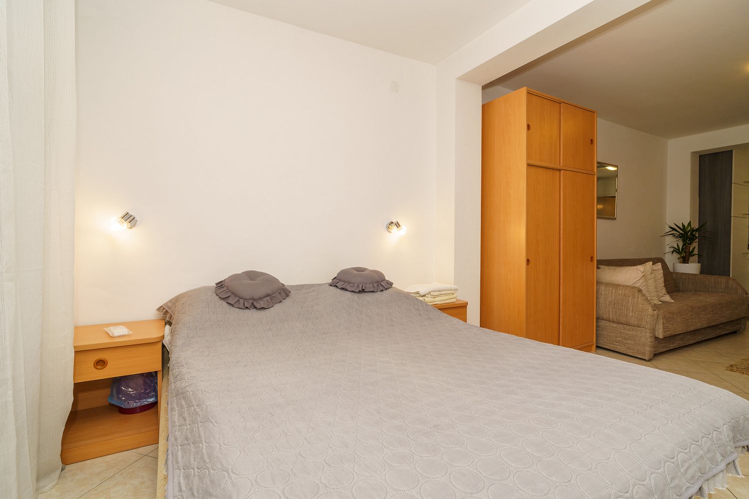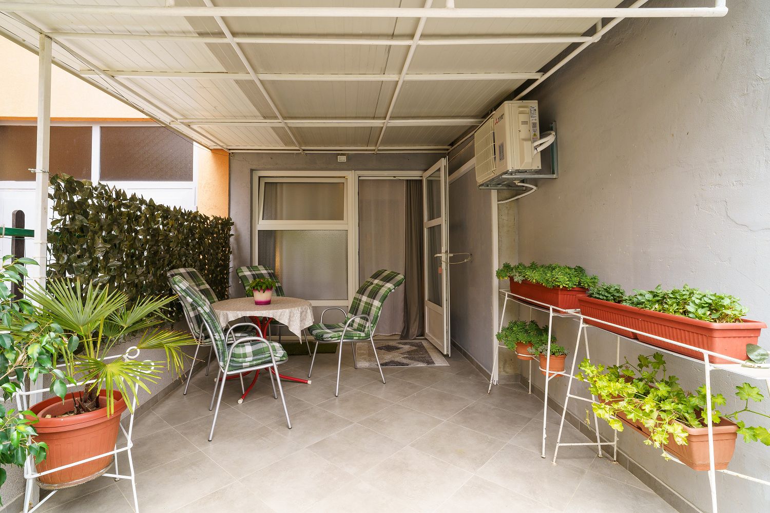 Das Wohnzimmer: Wohn-, Schlaf- und Esszimmer sowie Küche sind ein Raum. Es gibt eine Terrasse und Fliesen sowie Satellitenfernsehen. Küche mit Geschirr und Küchenhandtüchern, Elektro-/Gasherd mit vier Kochplatten, Backröhre, Kühlschrank mit Gefrierfach, Filterkaffeemaschine Bad mit WC und Dusche Eigene Terrasse, überdacht, Bestuhlung, Terrassengröße: 13 m² Parkplatz beim Haus, Klimaanlage, Eigentümer lebt im gleichen Haus, Bettwäsche und Handtücher vorhanden, Waschmaschine im Apartment, Internet per WLAN