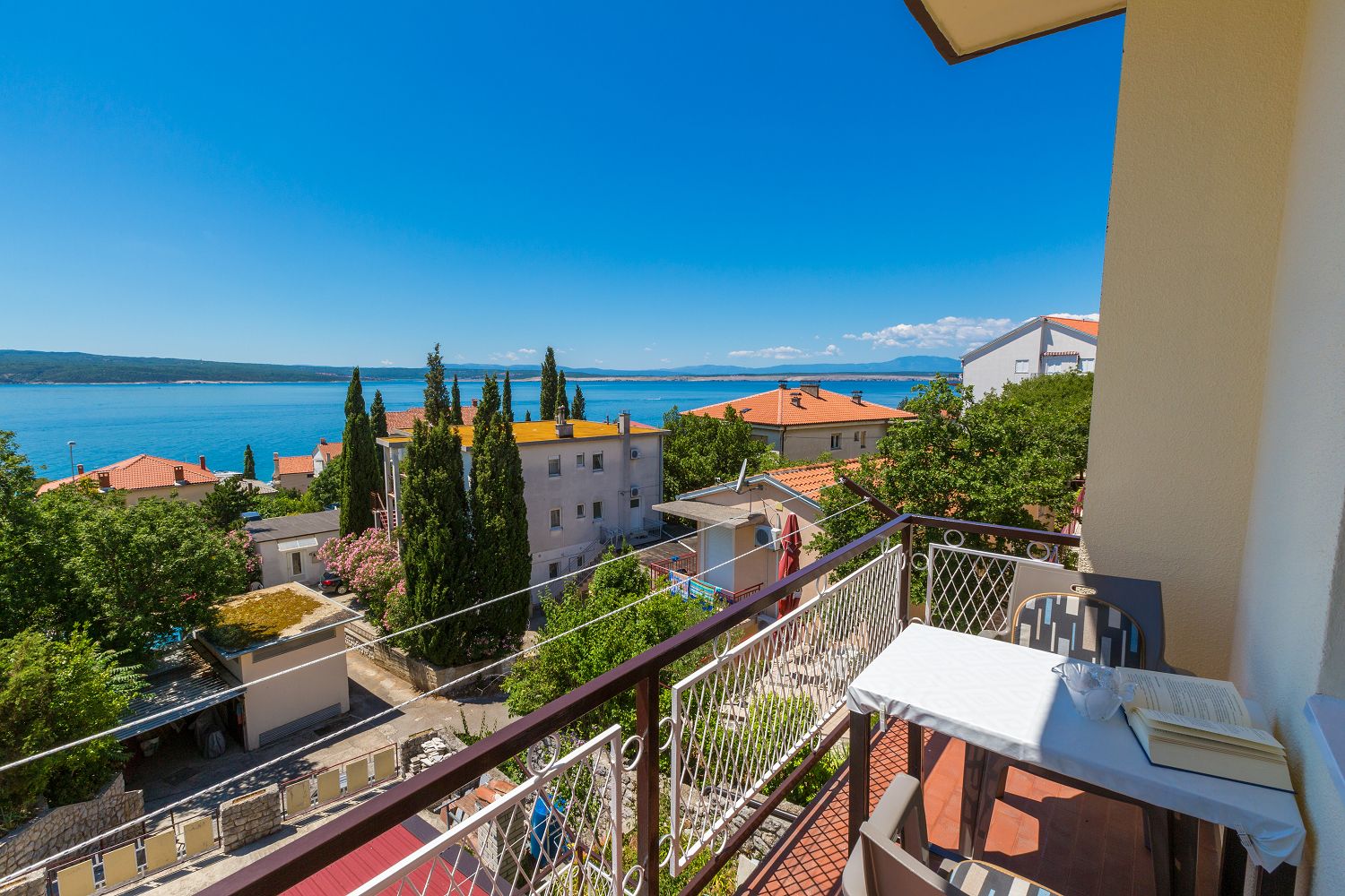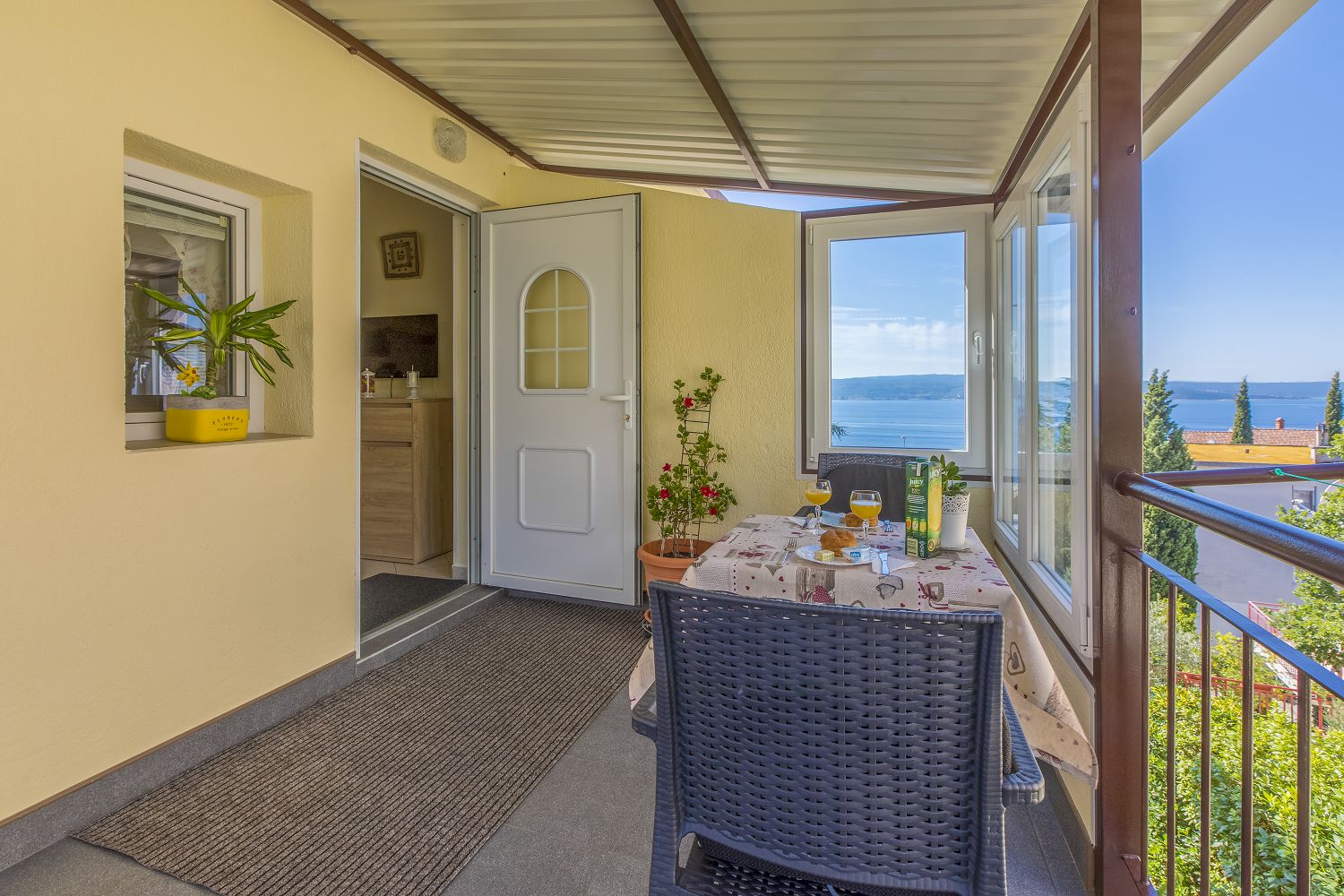 Wohnbereich: Esszimmer und Küche bilden einen Raum, der mit Fliesen ausgelegt ist. Es gibt Satellitenfernsehen. Küche: Geschirr, Küchenhandtücher, Elektroherd mit Kochplatten (2). Backröhre, Kühlschrank mit Gefrierfach, Filterkaffeemaschine, Wasserkocher, Mikrowelle Toaster Doppelzimmer mit Doppelbett, Balkon mit Meerblick und Laminatboden. Badezimmer: Bad mit WC und Dusche. Balkon und Terrasse: eigener, teilweise überdachter Balkon mit Meerblick, Sonnenschirm, 4 m² groß, eigene Terrasse überdacht, Meerblick, Bestuhlung, Terrassengröße: 14 m²