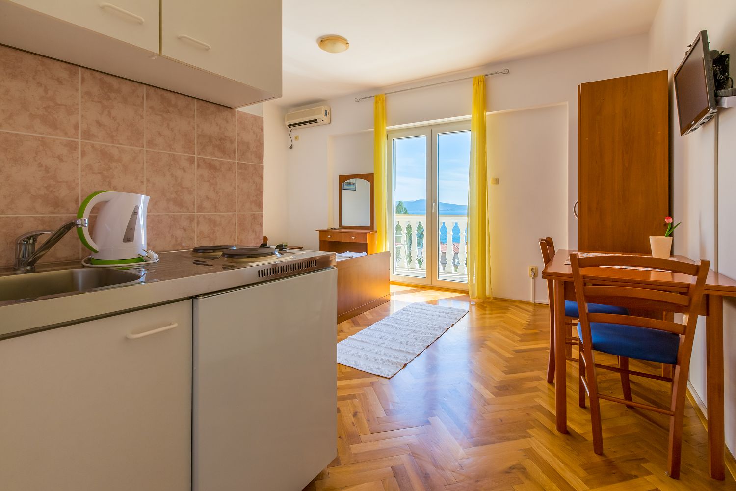 Studio für zwei Personen in Crikvenica im zweiten Stock mit 22 m². Wohn- und Schlafzimmer sind ein Raum, ein Badezimmer, Balkon mit Meerblick, Satellitenfernsehen, Klimaanlage, Haustiere bis 5 kg sind erlaubt. Der Strand ist ca. 150 m entfernt. Die Ferienwohnung befindet sich in der Nähe des Stadtzentrums von Crikvenica und eines der schönsten Kiesstrände Crikvenicas. Aufgrund der Nähe zum Zentrum und zum Strand ist sie sehr gut für Gäste geeignet, die ihr Fahrzeug nicht viel nutzen möchten. Der Wohn- und Schlafbereich sowie die Kochnische sind ein Raum. Die Unterkunft verfügt über eine Klimaanlage, Satellitenfernsehen und WLAN.