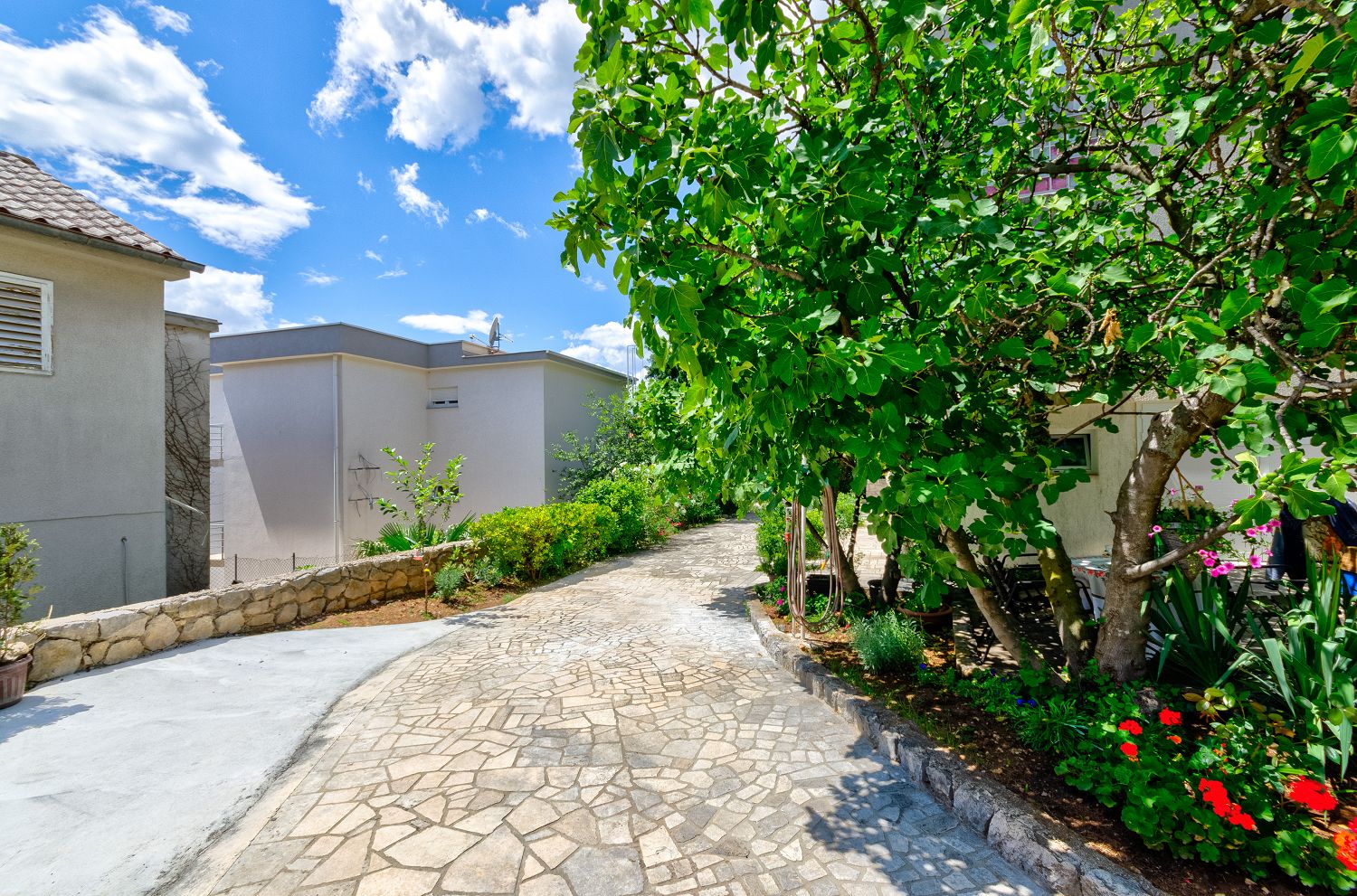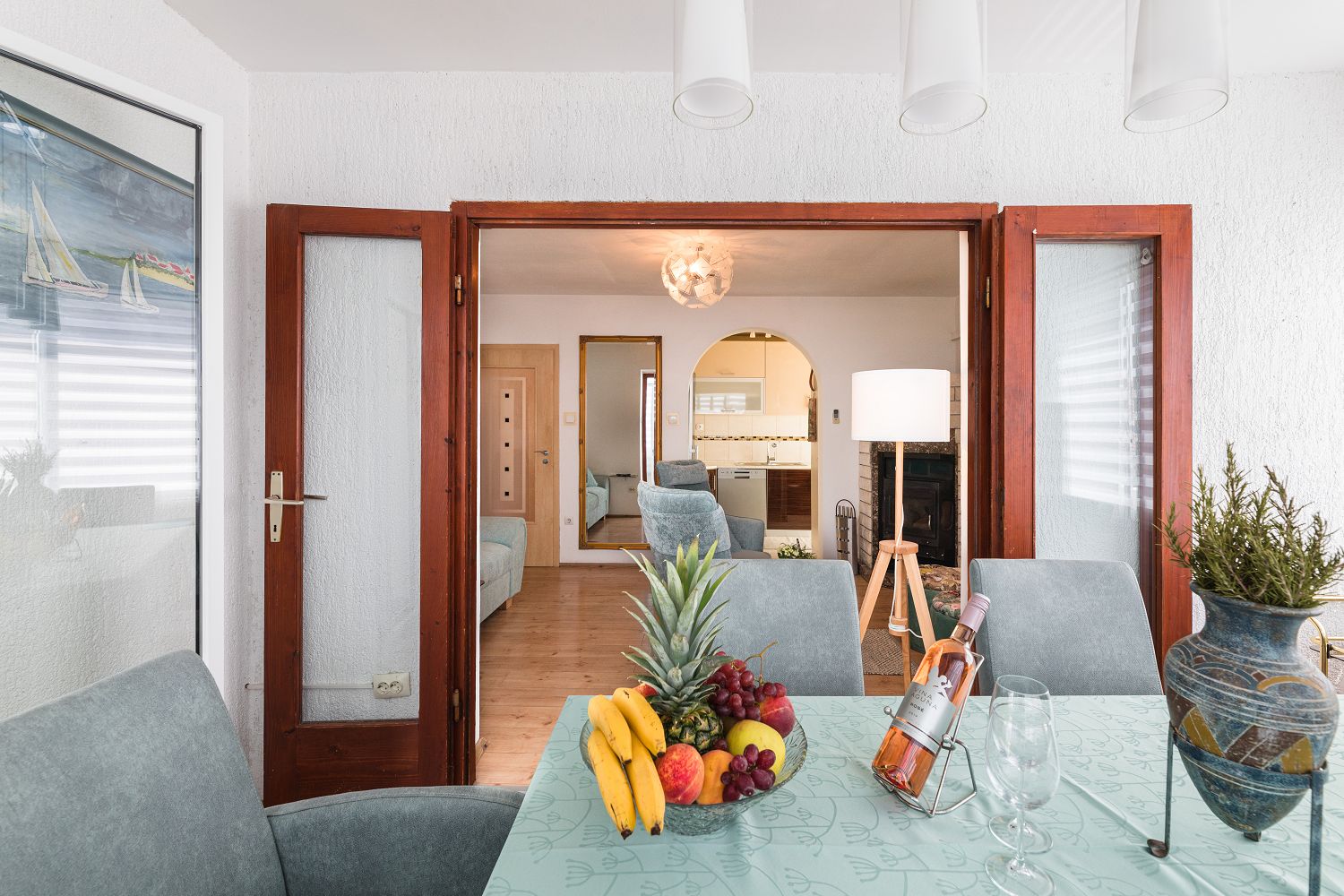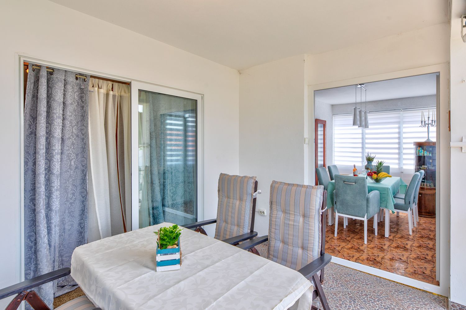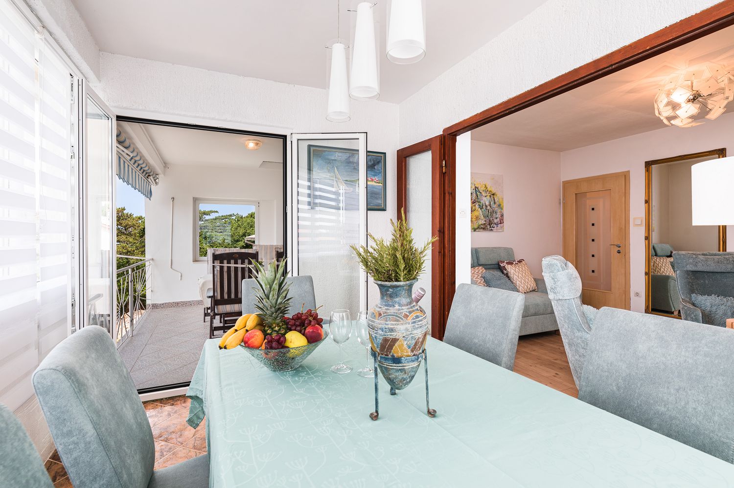 Diese sehr gemütliche und zweckmäßig eingerichtete Ferienwohnung für vier Personen befindet sich in einer wunderschönen Lage, nur wenige Gehminuten vom Meer entfernt. Sie besteht aus einem Wohn-/Esszimmer und einer offenen Küche, zwei Schlafzimmern, einem Badezimmer und einem tollen, überdachten Balkon mit Meerblick. Von einem Schlafzimmer und dem Essbereich aus gelangt man auf den zur Meerseite gelegenen Balkon.