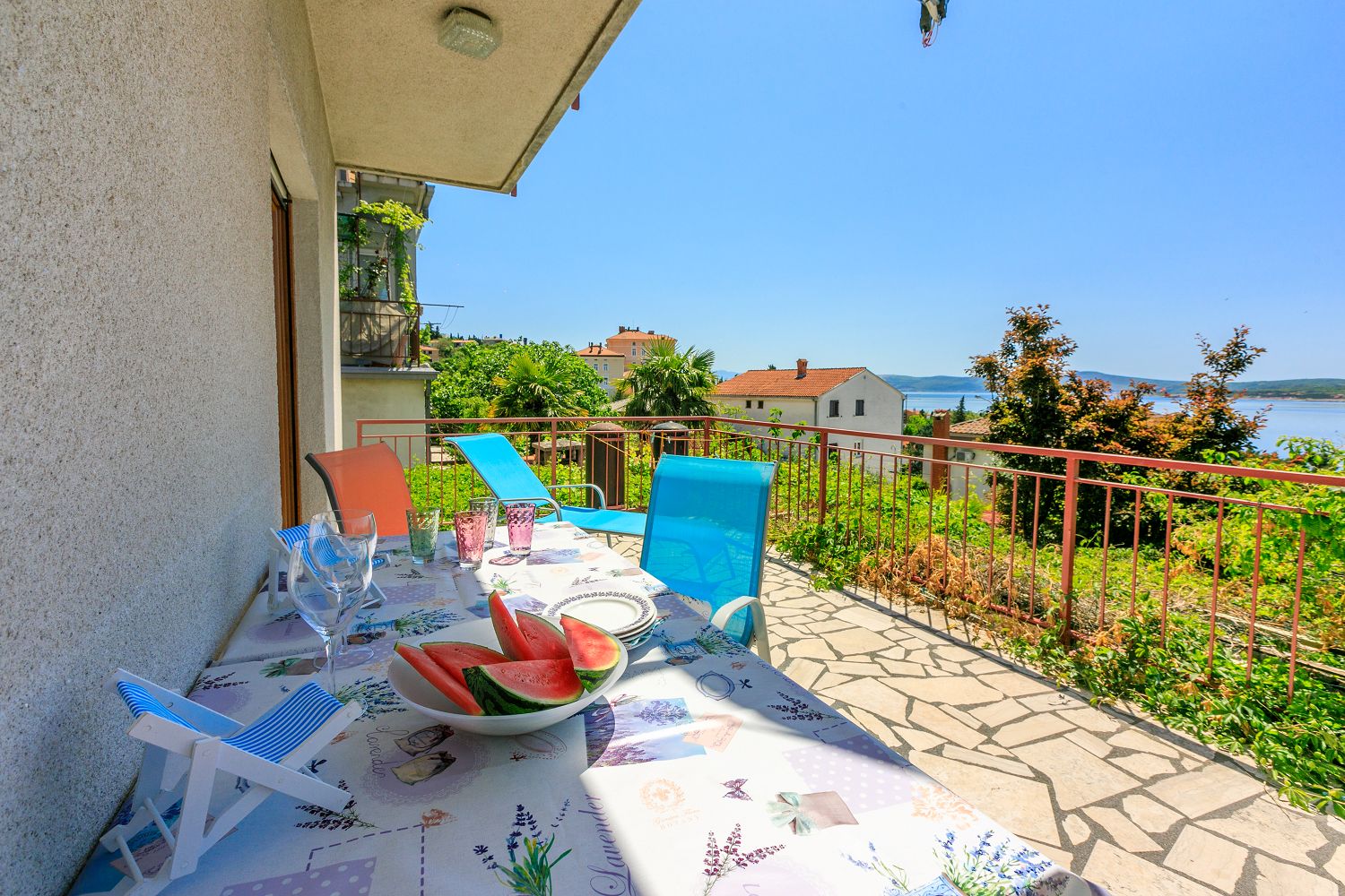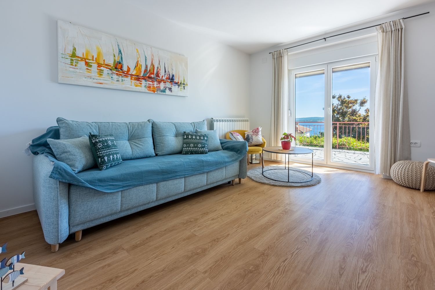 Die 50 m² große Wohnung teilt sich in ein Wohnzimmer, eine Küche mit Essbereich, ein gemütliches Schlafzimmer und ein Badezimmer auf. Vom Wohnzimmer aus hat man direkten Zugang zum traumhaften, 20 m² großen Balkon dieser Ferienwohnung. Im Wohnzimmer befindet sich eine sehr gemütliche Schlafcouch (160 x 200 cm) für zwei Personen. Sat-TV gibt es im Wohn- und im Schlafzimmer.