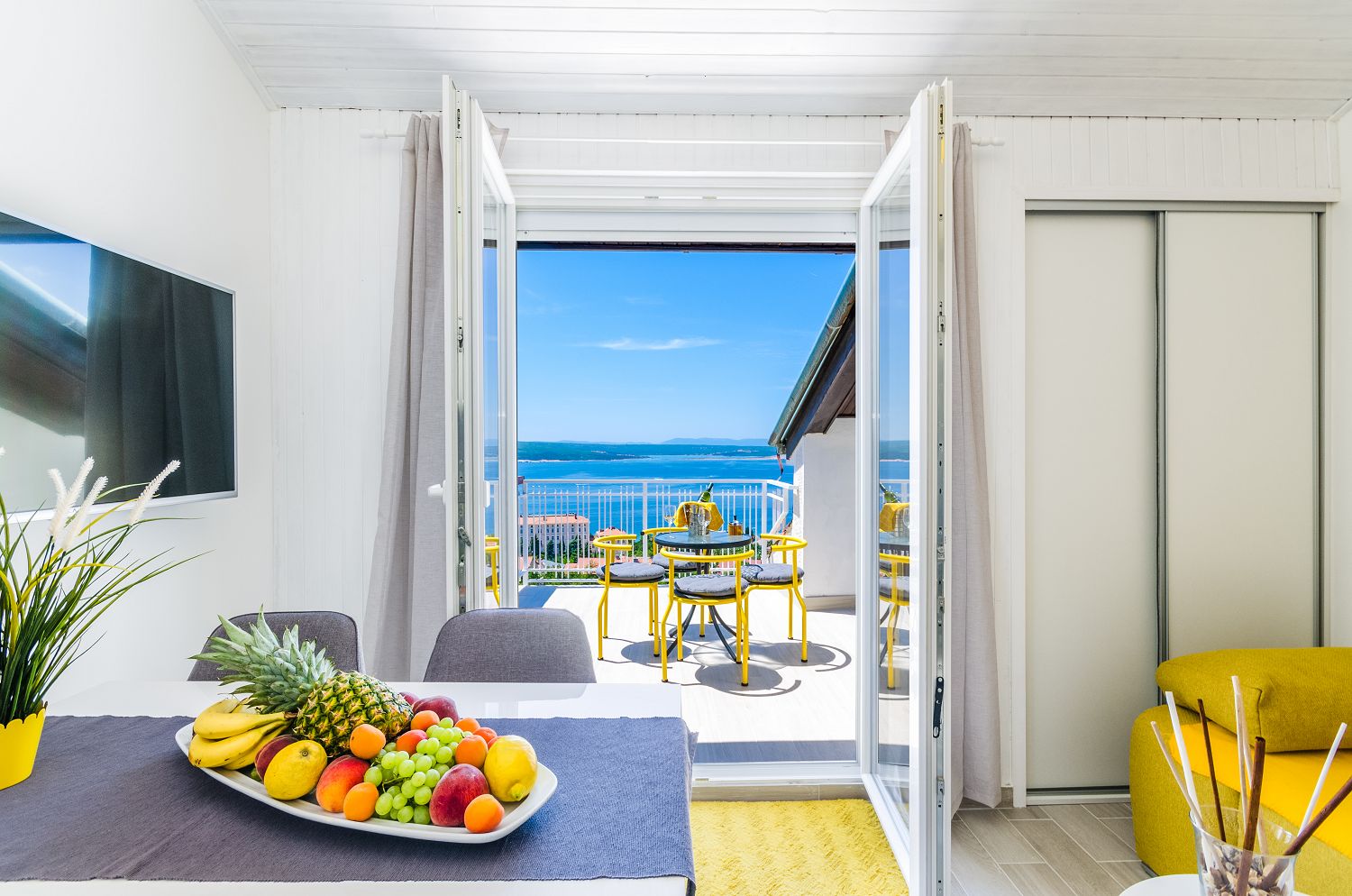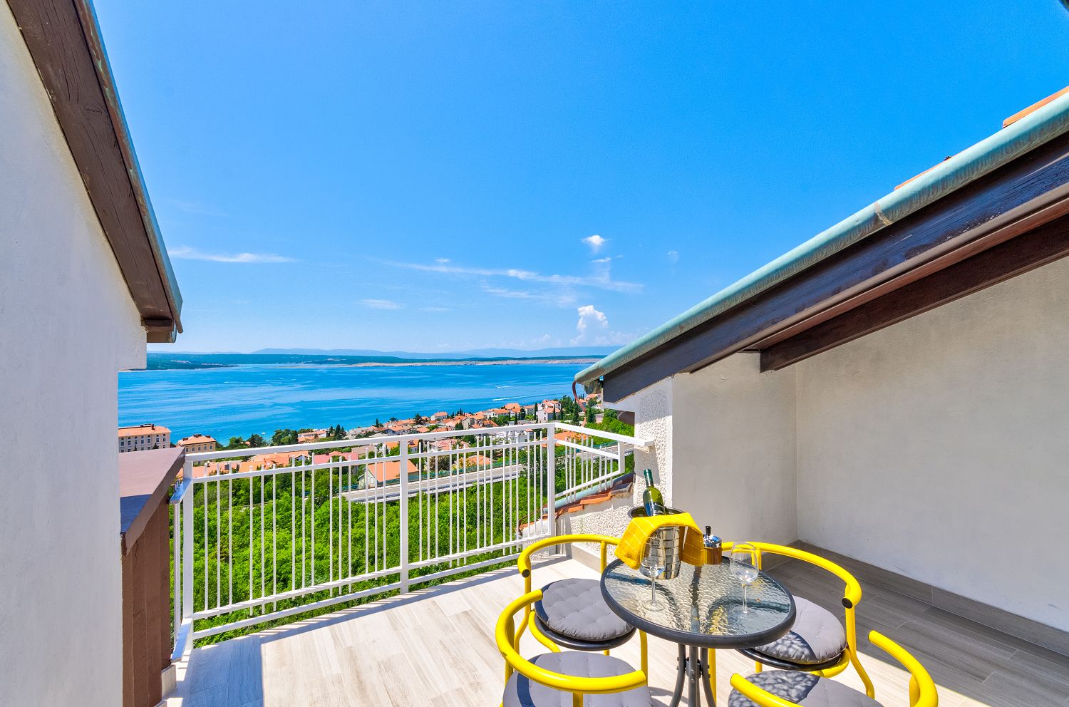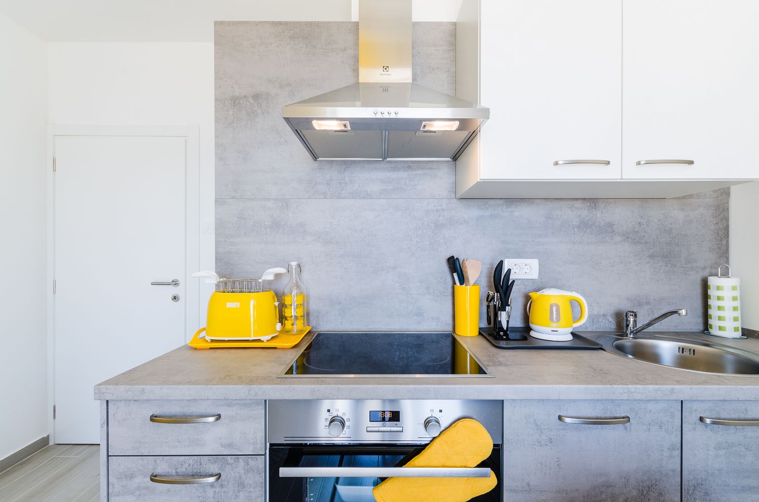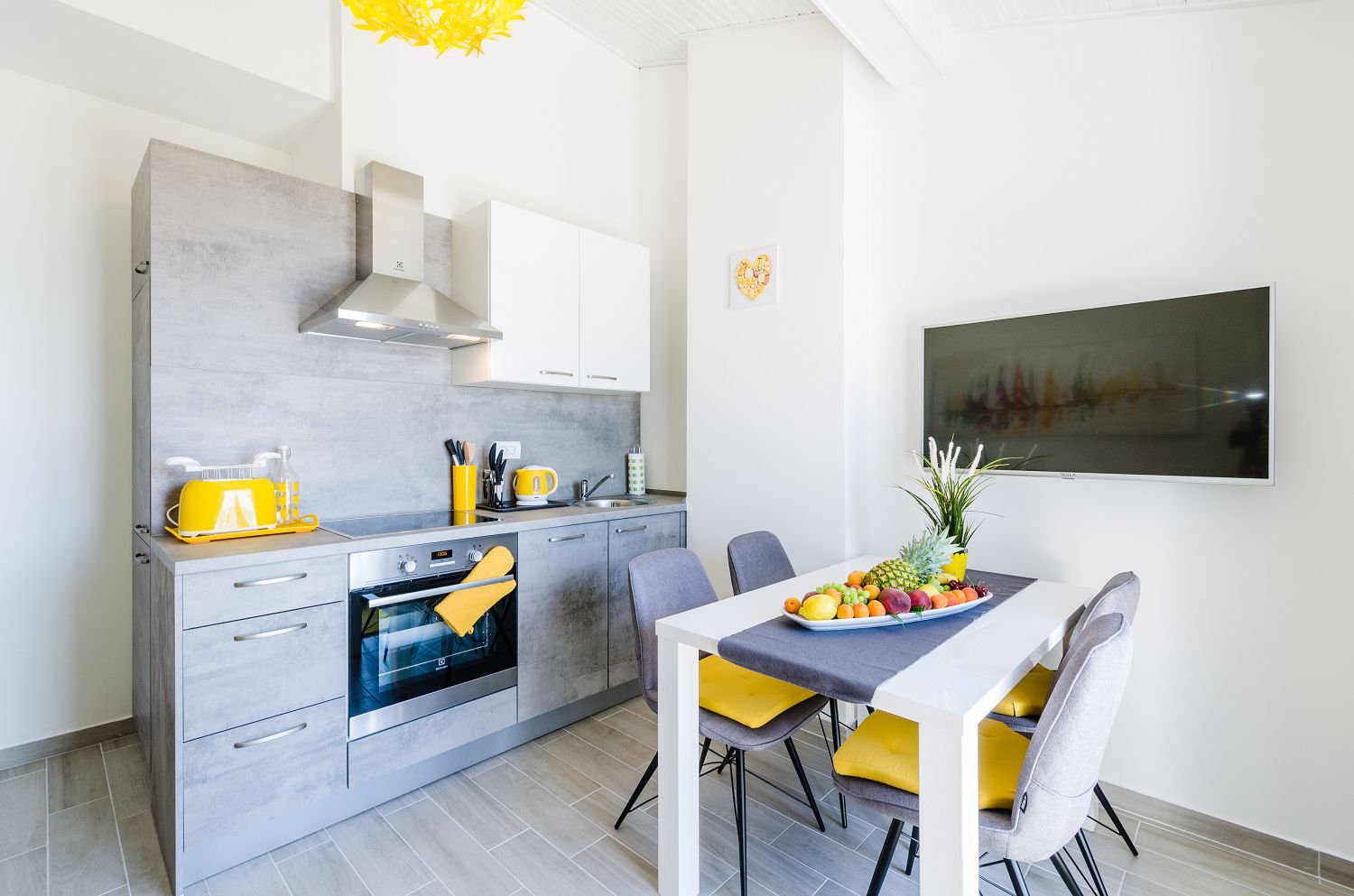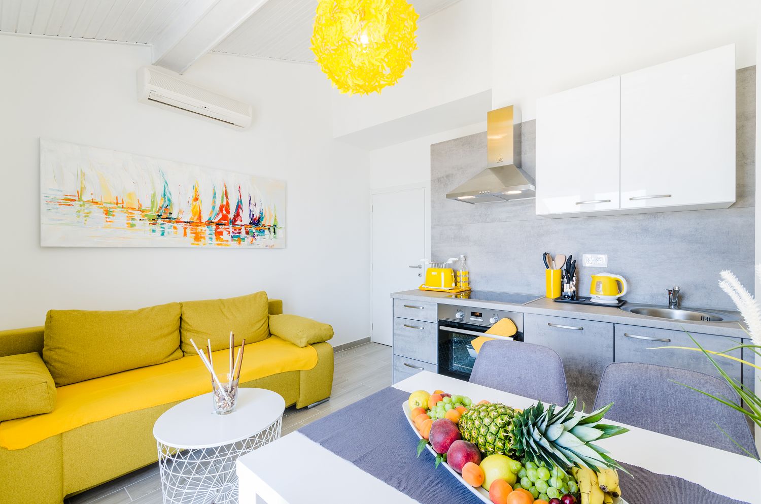 Das 28 m² große Apartment in der dritten Etage bietet Platz für vier Personen und ist aufgeteilt in ein Schlafzimmer mit Doppelbett, ein Badezimmer mit Dusche sowie ein Wohnzimmer mit Essbereich und Küche. Es ist mit Klimaanlage, Mikrowelle, Satellitenfernsehen, WLAN-Internetzugang und Grillmöglichkeit ausgestattet.