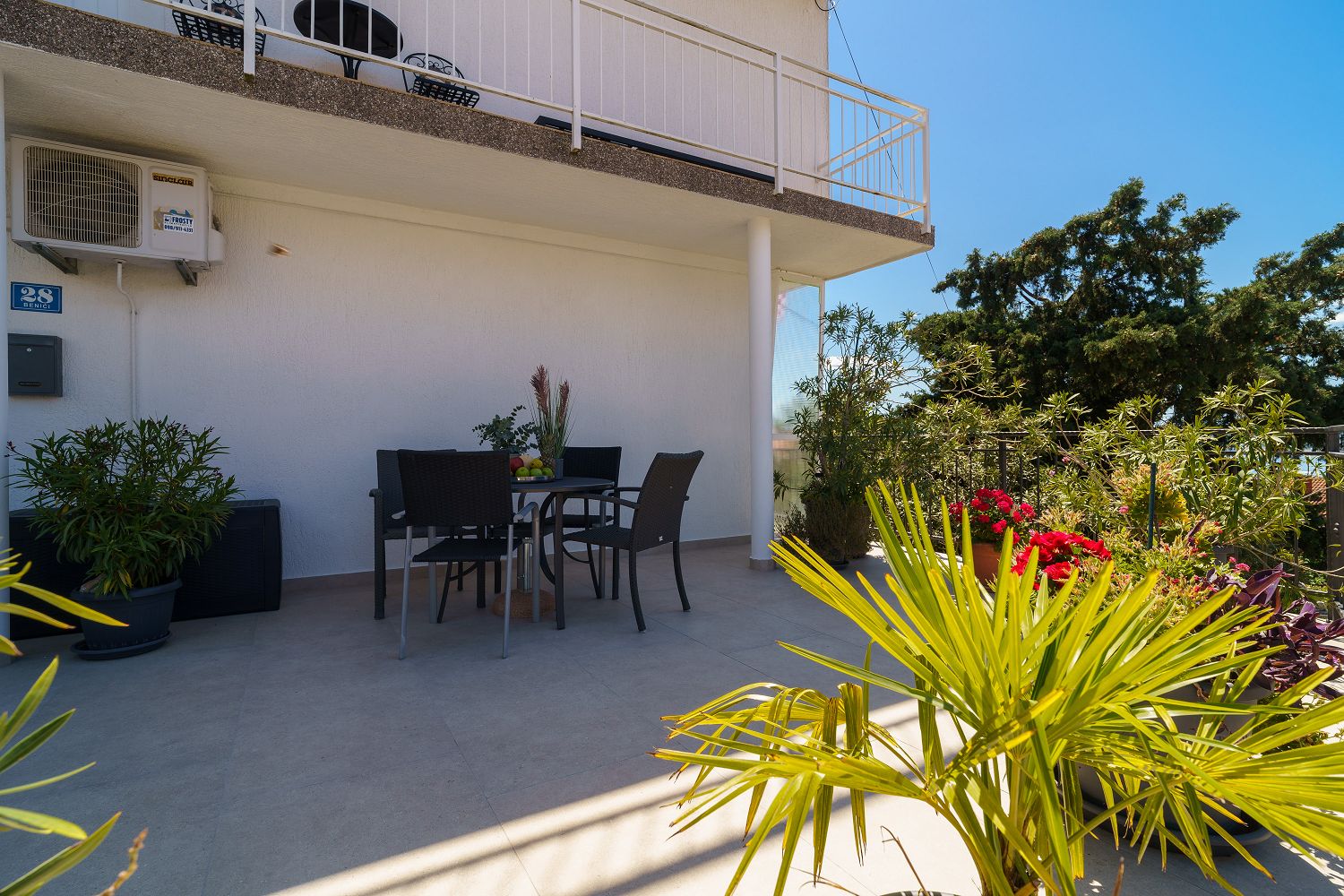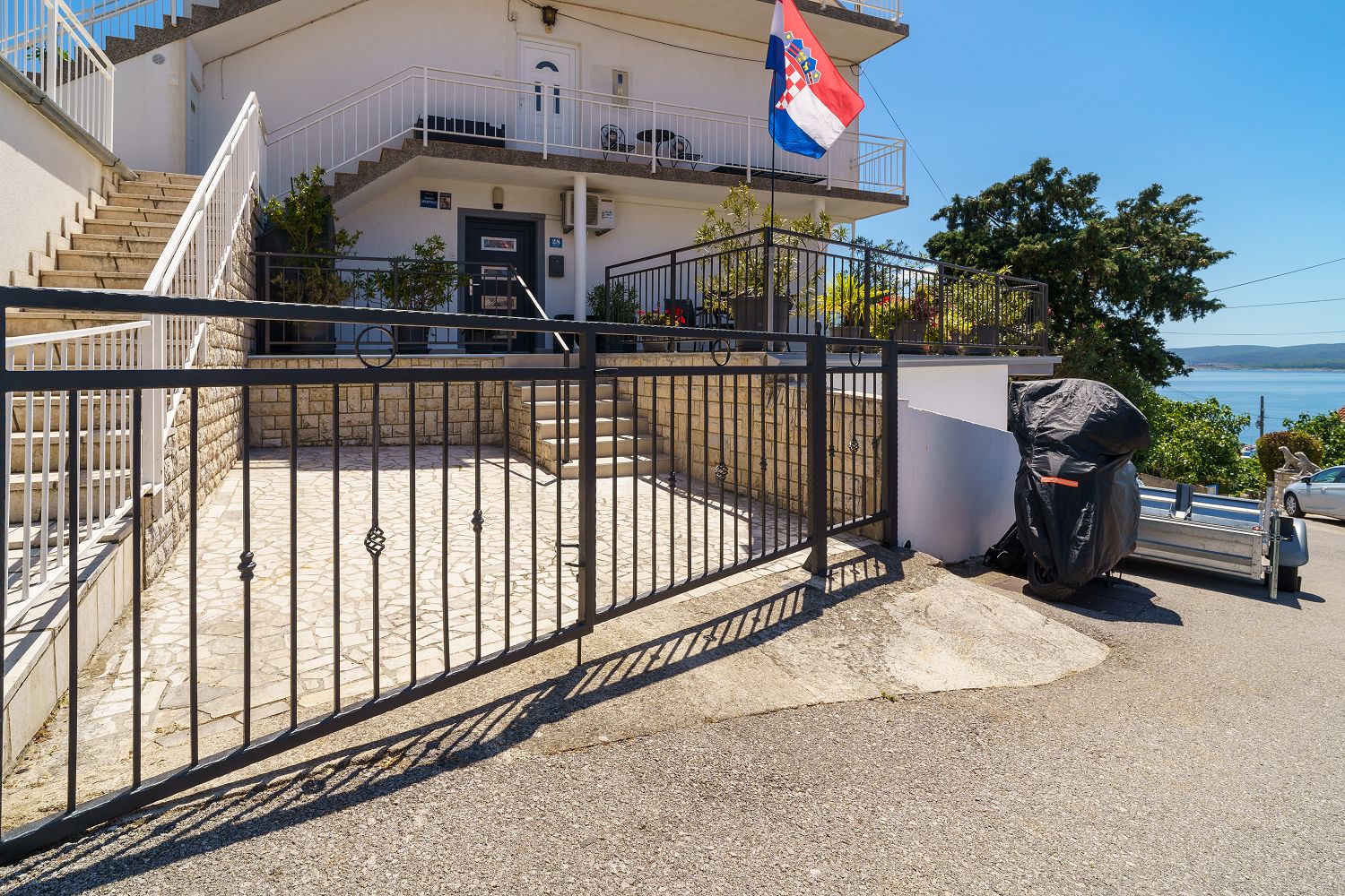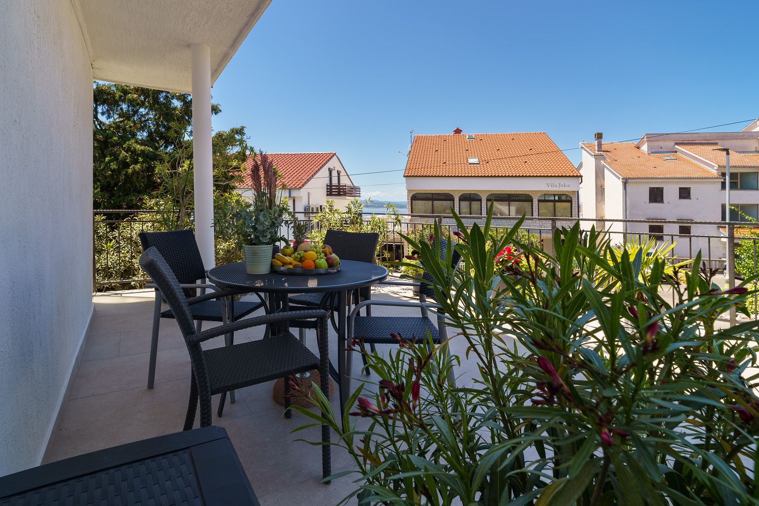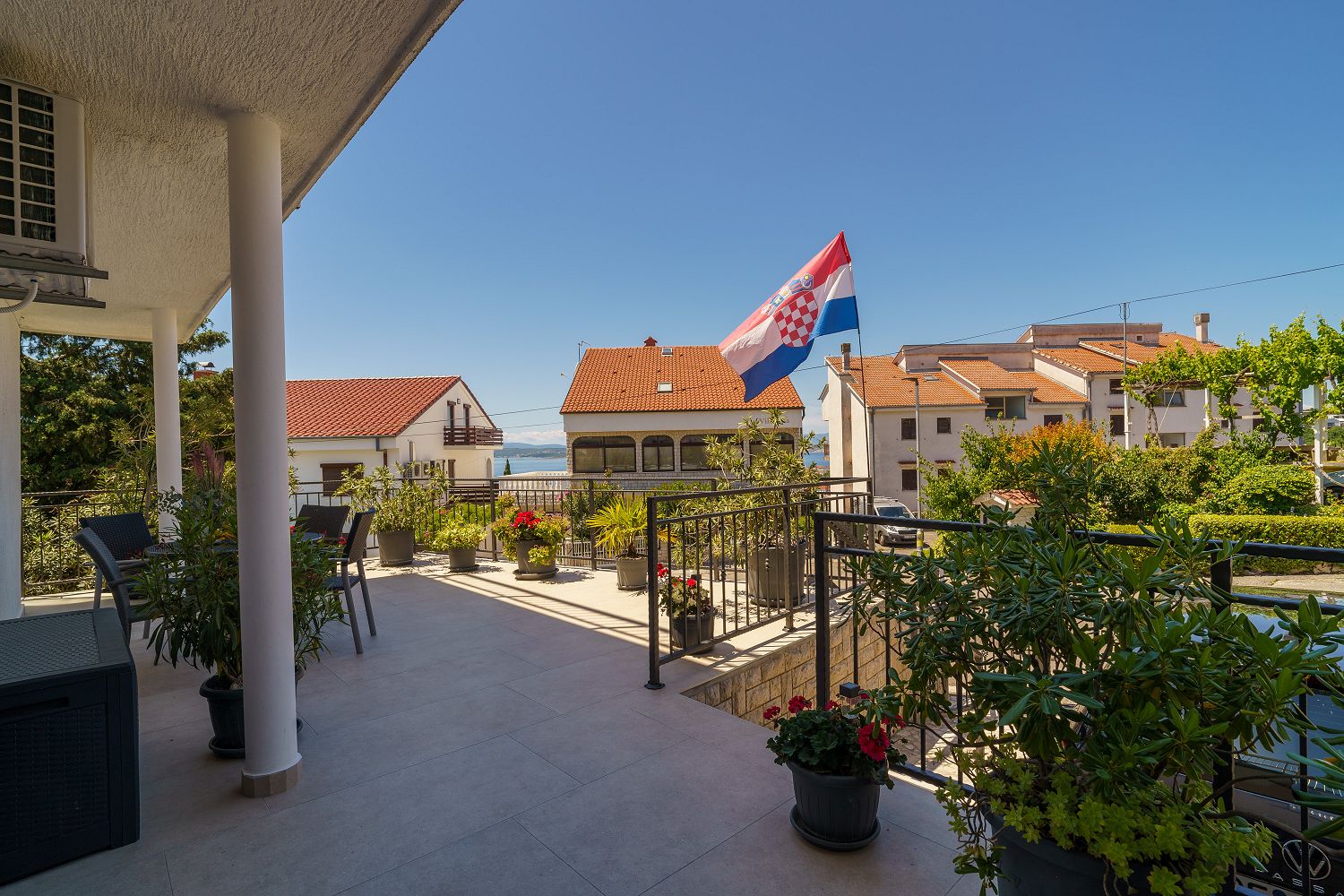 Die Wohnung ist in zwei getrennte Einheiten aufgeteilt, was für die gewünschte Privatsphäre sorgt und dennoch einen Urlaub mit seinen Liebsten ermöglicht. Die größere Einheit besteht aus einer großen Ess-/Küche, drei gemütlichen Schlafzimmern, zwei Badezimmern und einem langen Flur. Zwei der drei Schlafzimmer liegen zur Meerseite und verfügen über einen herrlichen Balkon mit Meerblick. Von der Ess-/Küche aus gelangt man zur großen Terrasse, über die man zur kleineren Wohneinheit kommt. Diese besteht aus einem Wohn-/Esszimmer mit Küche, einem Schlafzimmer und einem Badezimmer. Sie ist nur über den gemeinsamen Eingang und die gemeinsame Terrasse erreichbar. Im Außenbereich stehen zwei Terrassen zur Verfügung. Eine befindet sich gleich vor der großen Küche und der kleineren Wohneinheit. Auf dieser überdachten Terrasse stehen ein großer Tisch mit Stühlen und ein Grill bereit. Die zweite Terrasse befindet sich eine Etage höher. Sie ist als Sonnenterrasse gedacht. Hier stehen eine Sonnenliege für zwei Personen und eine für eine Person zur Verfügung. Ein Parkplatz befindet sich auf dem Grundstück, der andere vor dem Haus.