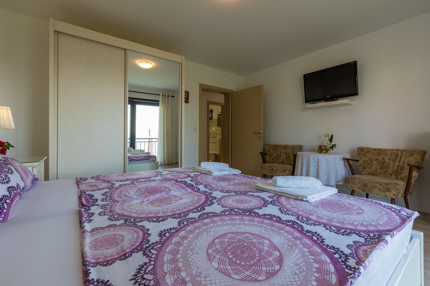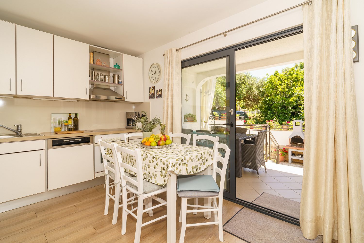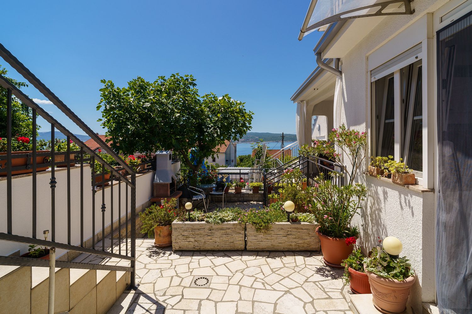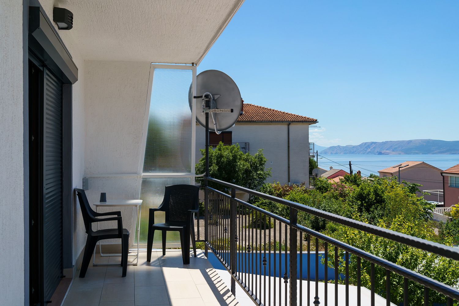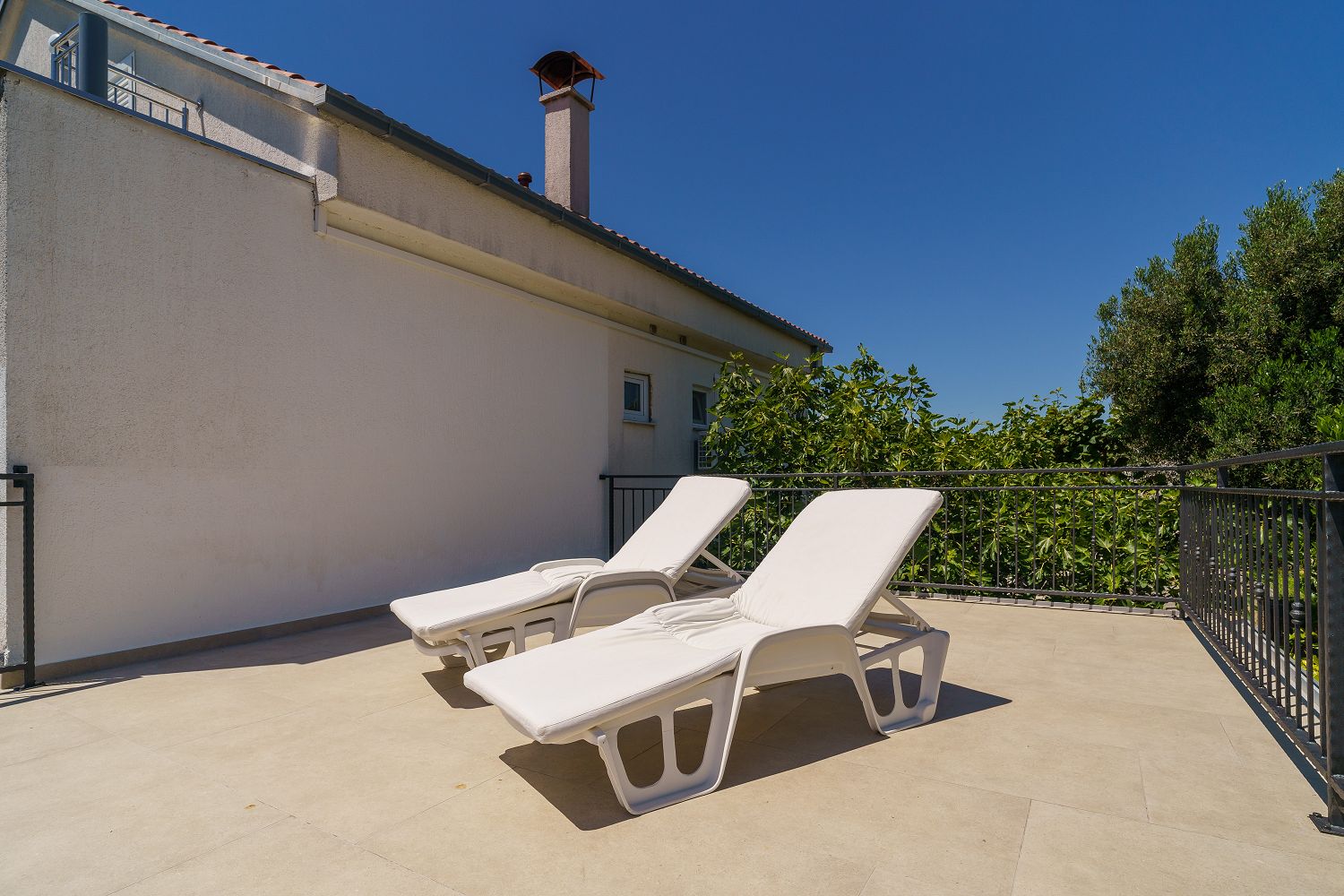 Die Wohnung ist in zwei getrennte Einheiten aufgeteilt, was für die gewünschte Privatsphäre sorgt und dennoch einen Urlaub mit seinen Liebsten ermöglicht. Die größere Einheit besteht aus einer großen Ess-/Küche, drei gemütlichen Schlafzimmern, zwei Badezimmern und einem langen Flur. Zwei der drei Schlafzimmer liegen zur Meerseite und verfügen über einen herrlichen Balkon mit Meerblick. Von der Ess-/Küche aus gelangt man zur großen Terrasse, über die man zur kleineren Wohneinheit kommt. Diese besteht aus einem Wohn-/Esszimmer mit Küche, einem Schlafzimmer und einem Badezimmer. Sie ist nur über den gemeinsamen Eingang und die gemeinsame Terrasse erreichbar. Im Außenbereich stehen zwei Terrassen zur Verfügung. Eine befindet sich gleich vor der großen Küche und der kleineren Wohneinheit. Auf dieser überdachten Terrasse stehen ein großer Tisch mit Stühlen und ein Grill bereit. Die zweite Terrasse befindet sich eine Etage höher. Sie ist als Sonnenterrasse gedacht. Hier stehen eine Sonnenliege für zwei Personen und eine für eine Person zur Verfügung. Ein Parkplatz befindet sich auf dem Grundstück, der andere vor dem Haus.