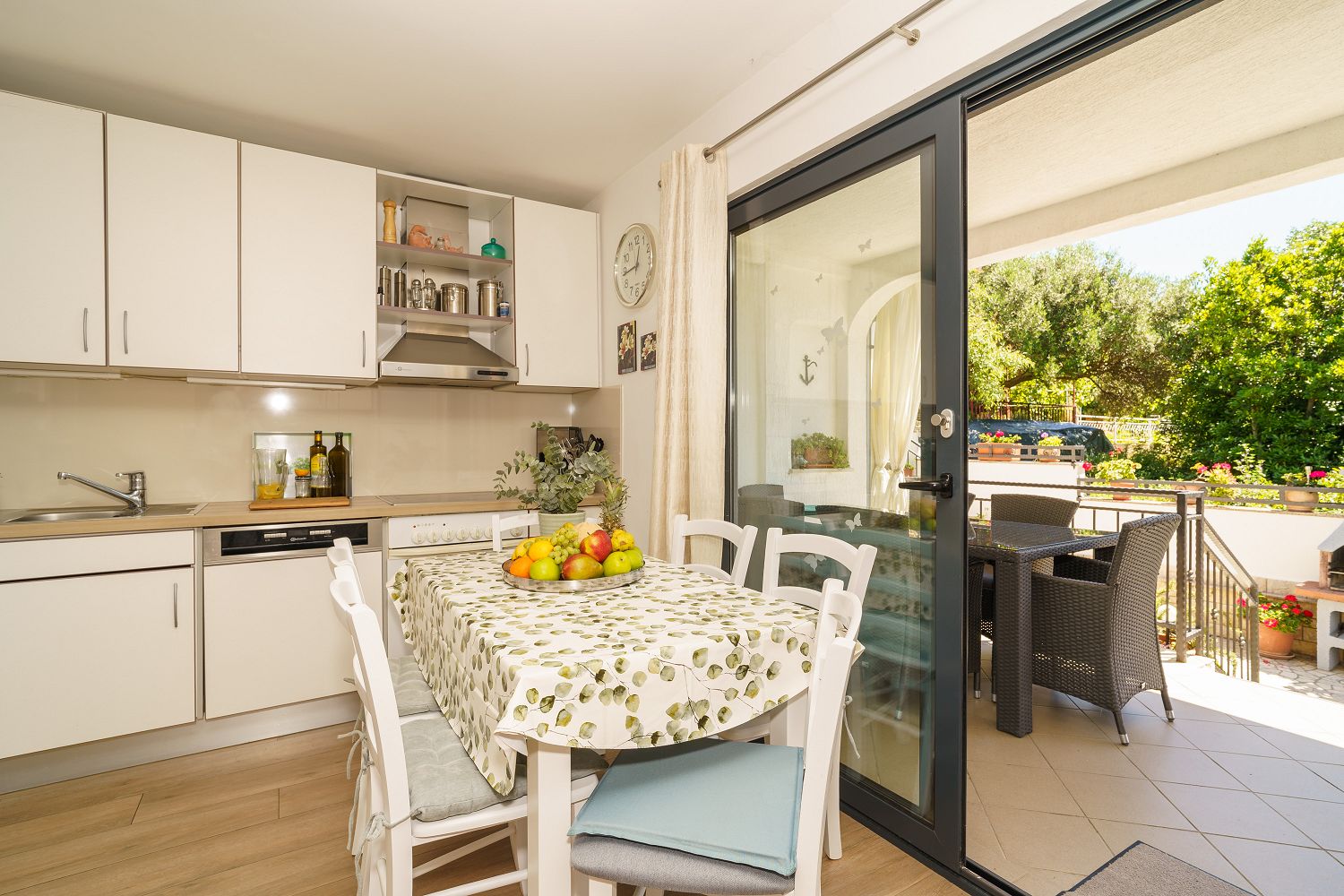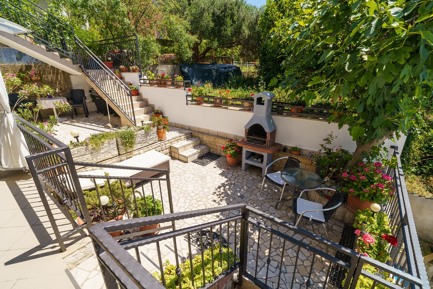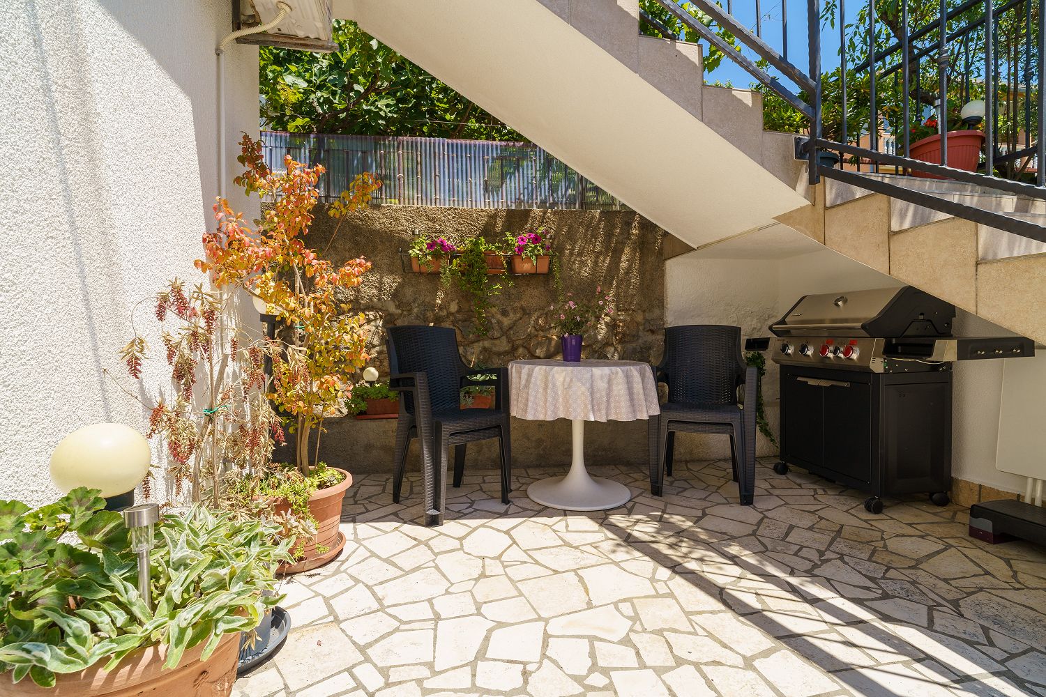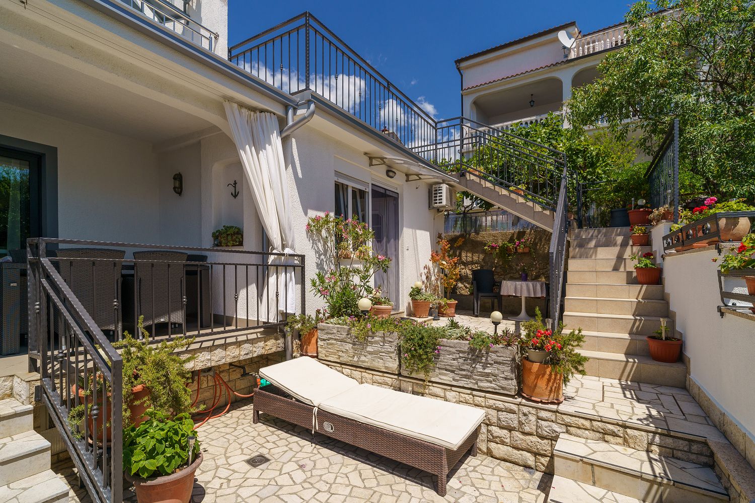 Die Wohnung ist in zwei getrennte Einheiten aufgeteilt, was für die gewünschte Privatsphäre sorgt und dennoch einen Urlaub mit seinen Liebsten ermöglicht. Die größere Einheit besteht aus einer großen Ess-/Küche, drei gemütlichen Schlafzimmern, zwei Badezimmern und einem langen Flur. Zwei der drei Schlafzimmer liegen zur Meerseite und verfügen über einen herrlichen Balkon mit Meerblick. Von der Ess-/Küche aus gelangt man zur großen Terrasse, über die man zur kleineren Wohneinheit kommt. Diese besteht aus einem Wohn-/Esszimmer mit Küche, einem Schlafzimmer und einem Badezimmer. Sie ist nur über den gemeinsamen Eingang und die gemeinsame Terrasse erreichbar. Im Außenbereich stehen zwei Terrassen zur Verfügung. Eine befindet sich gleich vor der großen Küche und der kleineren Wohneinheit. Auf dieser überdachten Terrasse stehen ein großer Tisch mit Stühlen und ein Grill bereit. Die zweite Terrasse befindet sich eine Etage höher. Sie ist als Sonnenterrasse gedacht. Hier stehen eine Sonnenliege für zwei Personen und eine für eine Person zur Verfügung. Ein Parkplatz befindet sich auf dem Grundstück, der andere vor dem Haus.
