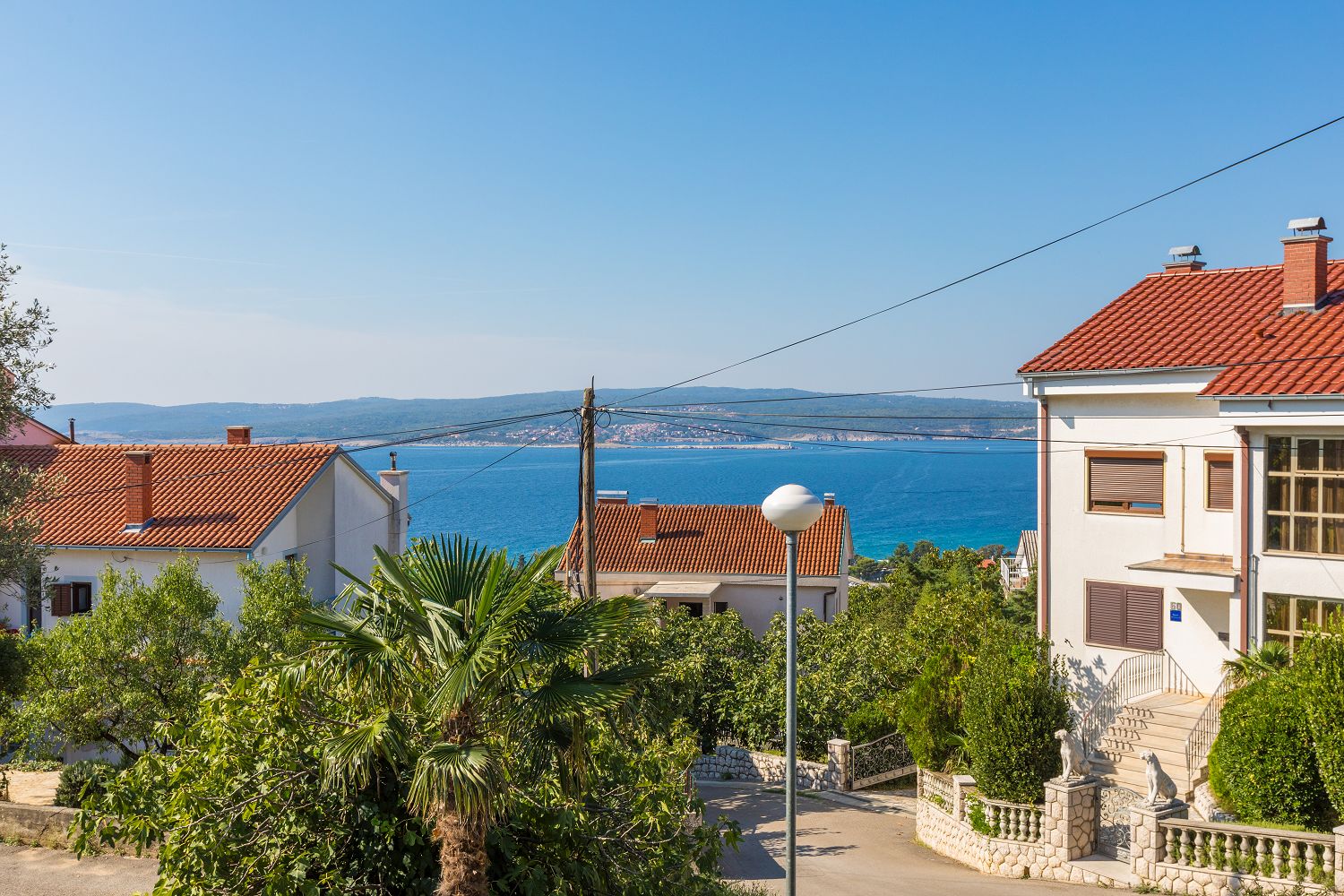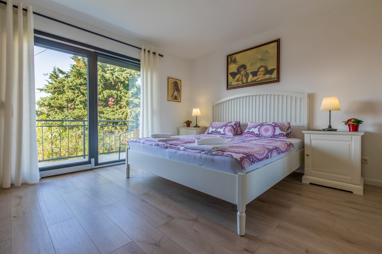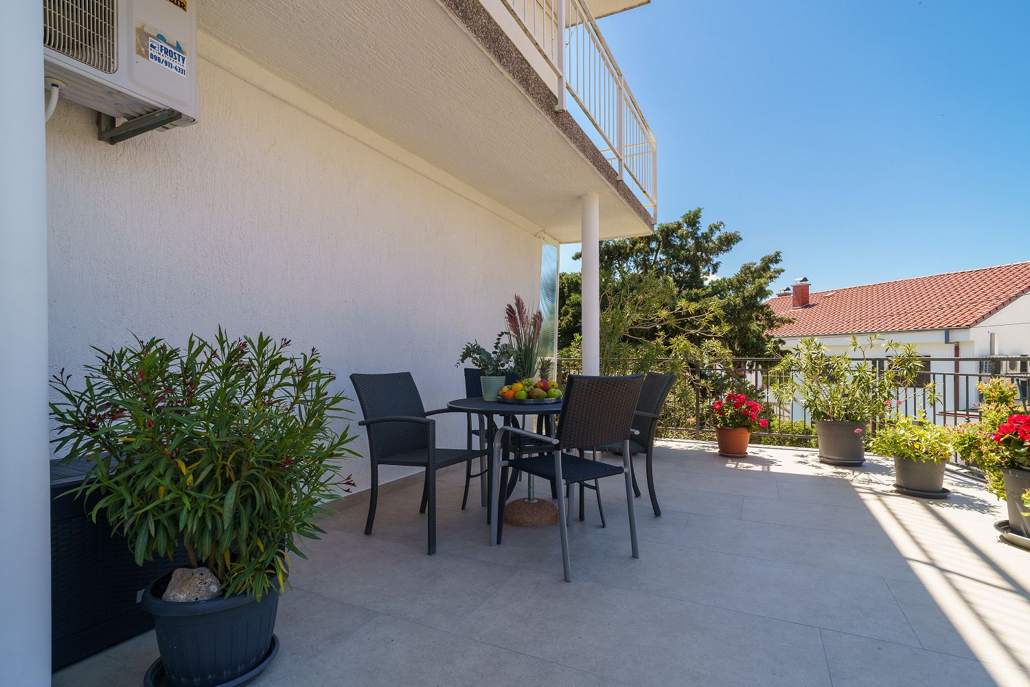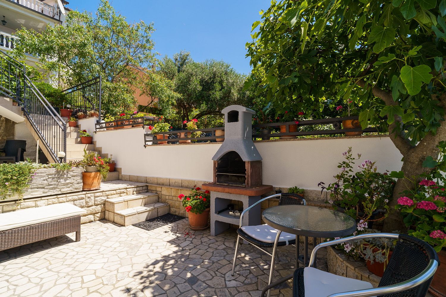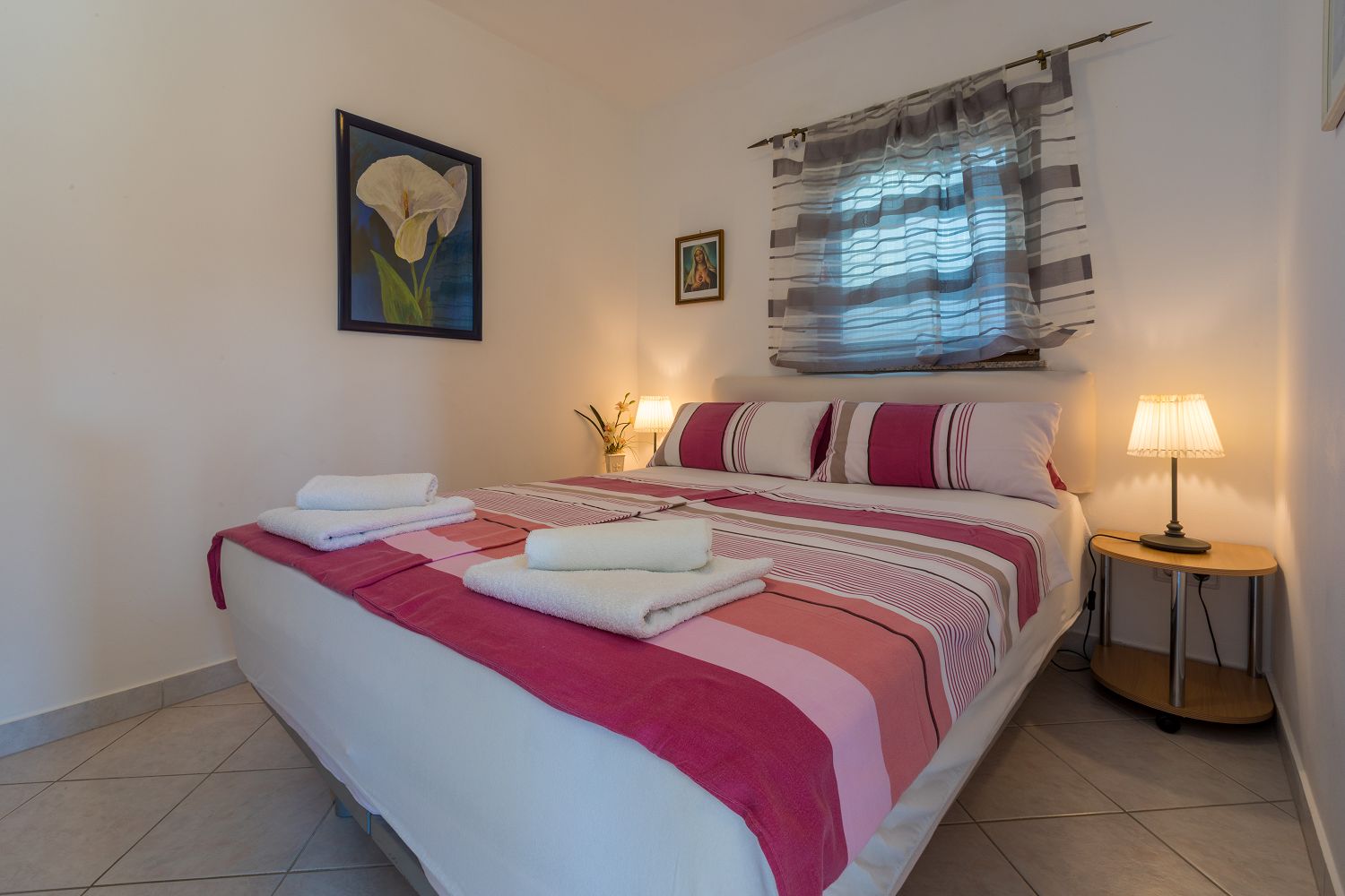 Die Wohnung ist in zwei getrennte Einheiten aufgeteilt, was für die gewünschte Privatsphäre sorgt und dennoch einen Urlaub mit seinen Liebsten ermöglicht. Die größere Einheit besteht aus einer großen Ess-/Küche, drei gemütlichen Schlafzimmern, zwei Badezimmern und einem langen Flur. Zwei der drei Schlafzimmer liegen zur Meerseite und verfügen über einen herrlichen Balkon mit Meerblick. Von der Ess-/Küche aus gelangt man zur großen Terrasse, über die man zur kleineren Wohneinheit kommt. Diese besteht aus einem Wohn-/Esszimmer mit Küche, einem Schlafzimmer und einem Badezimmer. Sie ist nur über den gemeinsamen Eingang und die gemeinsame Terrasse erreichbar. Im Außenbereich stehen zwei Terrassen zur Verfügung. Eine befindet sich gleich vor der großen Küche und der kleineren Wohneinheit. Auf dieser überdachten Terrasse stehen ein großer Tisch mit Stühlen und ein Grill bereit. Die zweite Terrasse befindet sich eine Etage höher. Sie ist als Sonnenterrasse gedacht. Hier stehen eine Sonnenliege für zwei Personen und eine für eine Person zur Verfügung. Ein Parkplatz befindet sich auf dem Grundstück, der andere vor dem Haus.