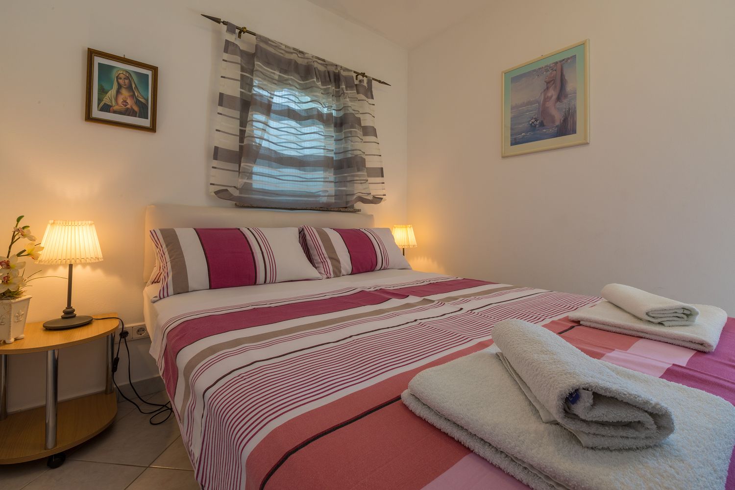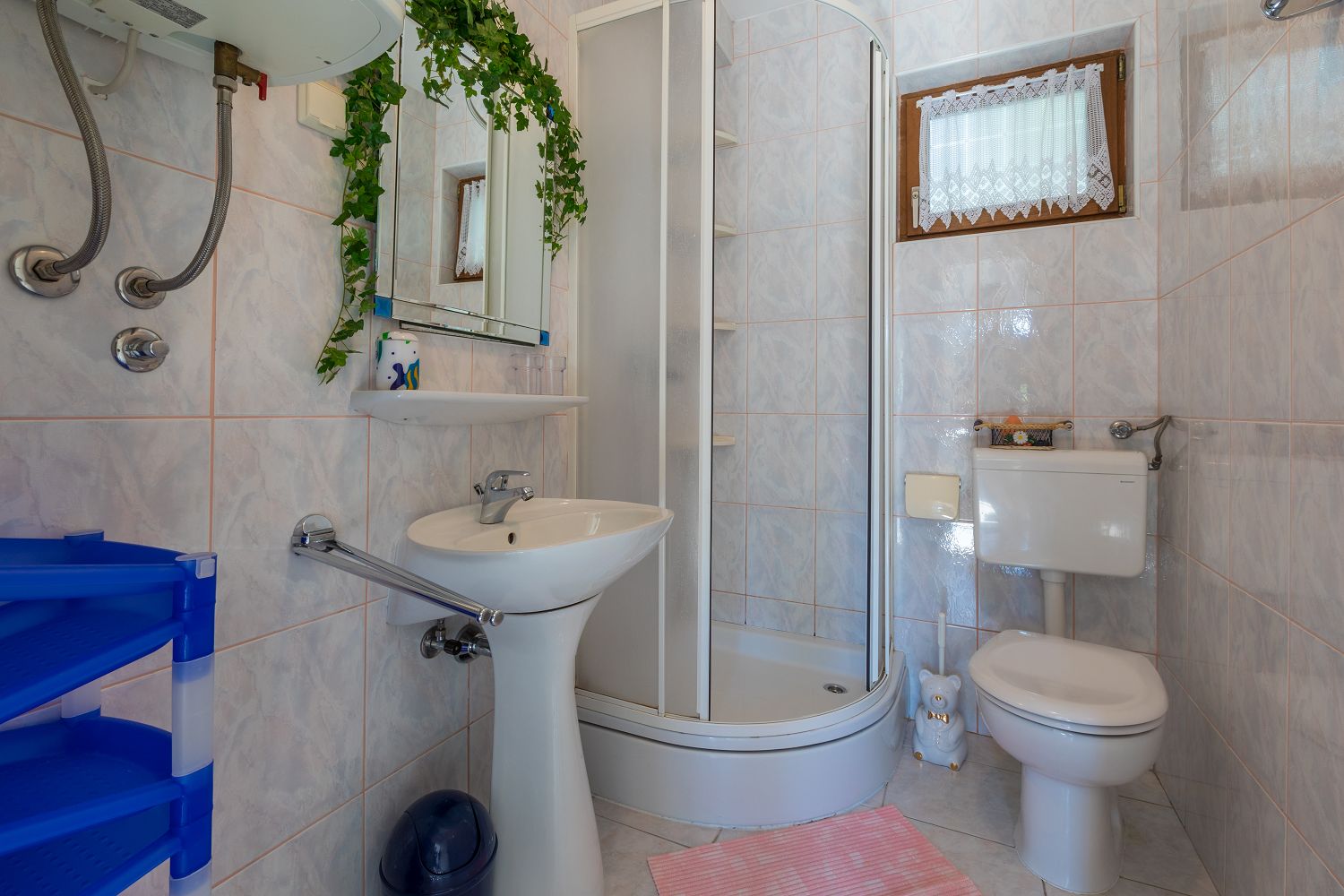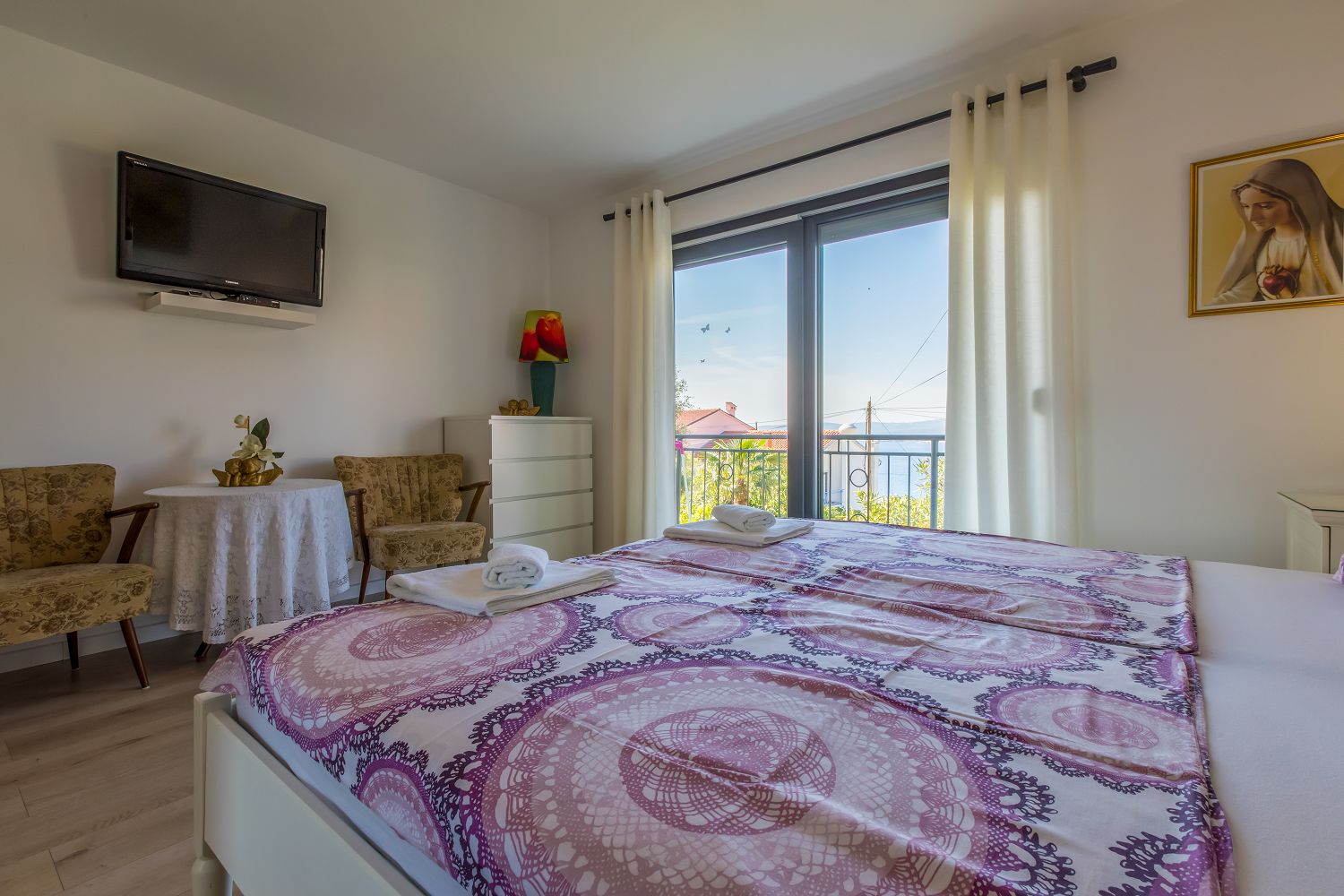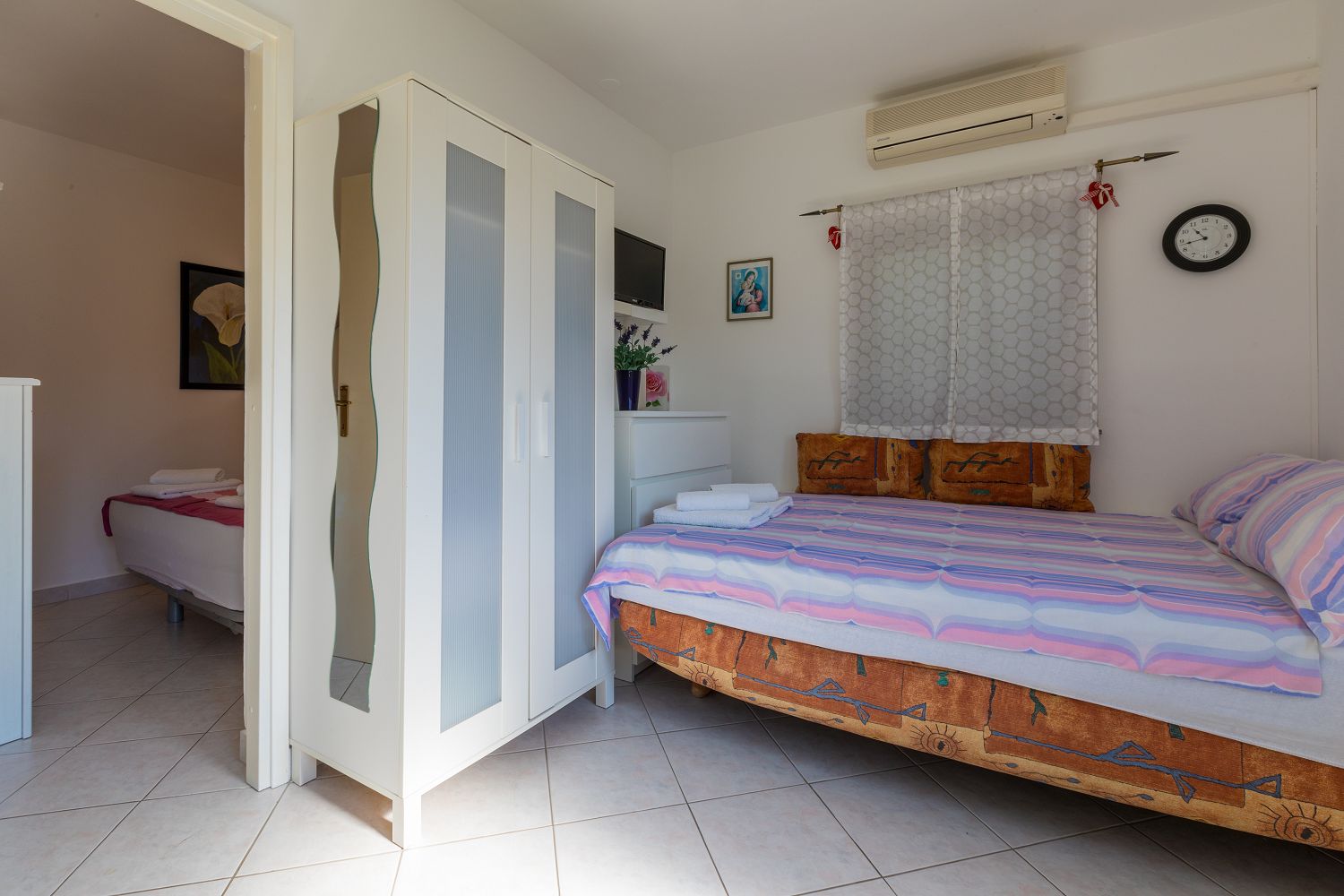 Die Wohnung ist in zwei getrennte Einheiten aufgeteilt, was für die gewünschte Privatsphäre sorgt und dennoch einen Urlaub mit seinen Liebsten ermöglicht. Die größere Einheit besteht aus einer großen Ess-/Küche, drei gemütlichen Schlafzimmern, zwei Badezimmern und einem langen Flur. Zwei der drei Schlafzimmer liegen zur Meerseite und verfügen über einen herrlichen Balkon mit Meerblick. Von der Ess-/Küche aus gelangt man zur großen Terrasse, über die man zur kleineren Wohneinheit kommt. Diese besteht aus einem Wohn-/Esszimmer mit Küche, einem Schlafzimmer und einem Badezimmer. Sie ist nur über den gemeinsamen Eingang und die gemeinsame Terrasse erreichbar. Im Außenbereich stehen zwei Terrassen zur Verfügung. Eine befindet sich gleich vor der großen Küche und der kleineren Wohneinheit. Auf dieser überdachten Terrasse stehen ein großer Tisch mit Stühlen und ein Grill bereit. Die zweite Terrasse befindet sich eine Etage höher. Sie ist als Sonnenterrasse gedacht. Hier stehen eine Sonnenliege für zwei Personen und eine für eine Person zur Verfügung. Ein Parkplatz befindet sich auf dem Grundstück, der andere vor dem Haus.