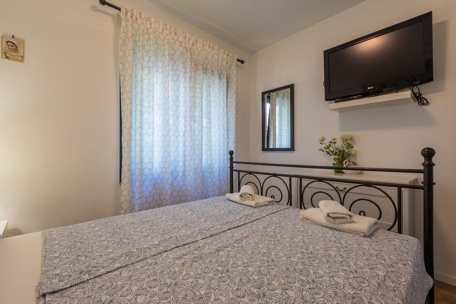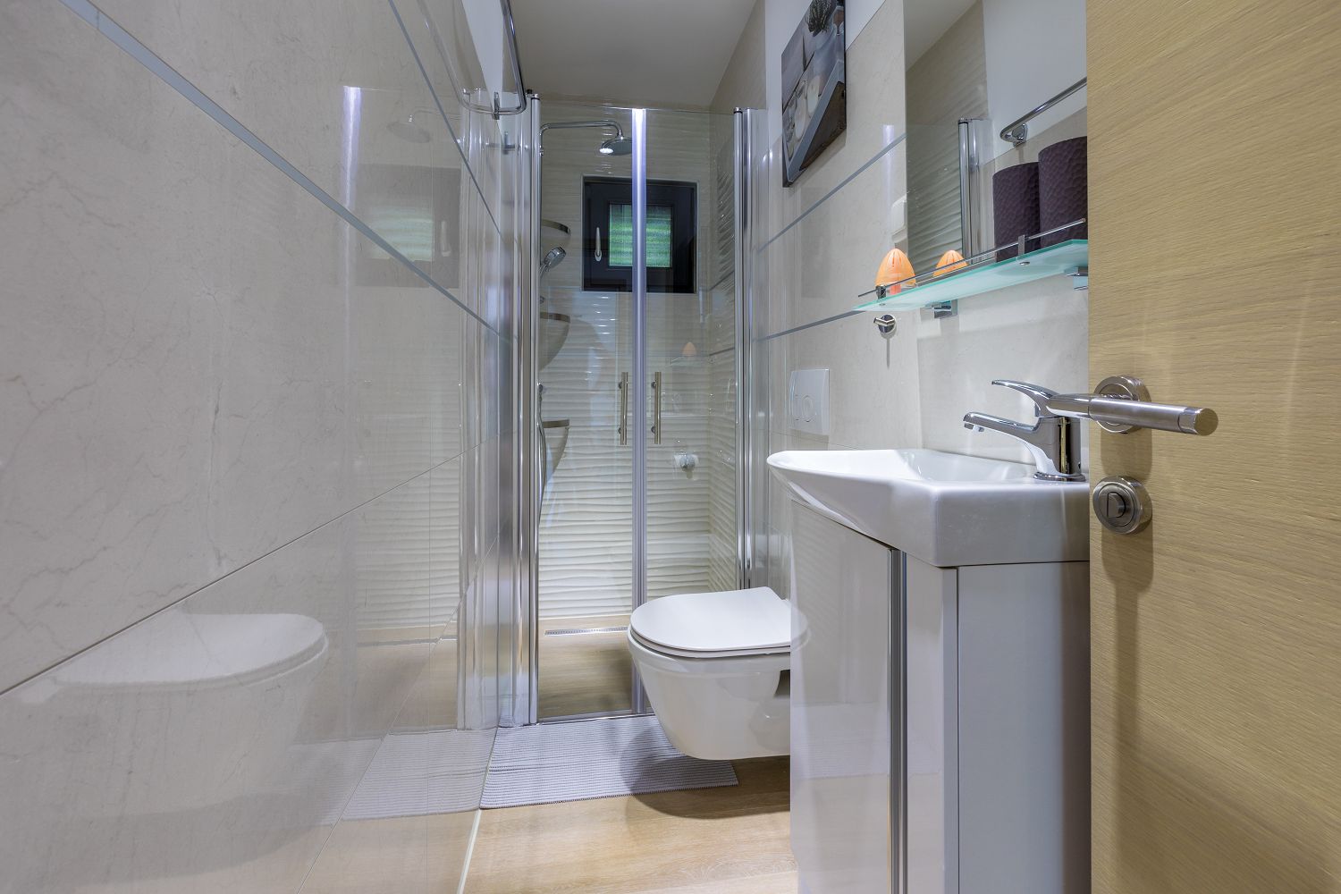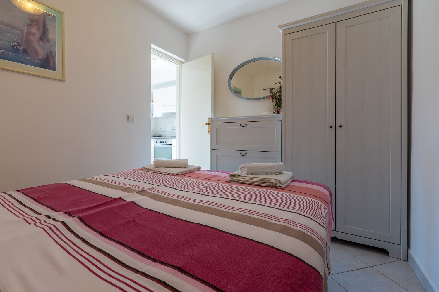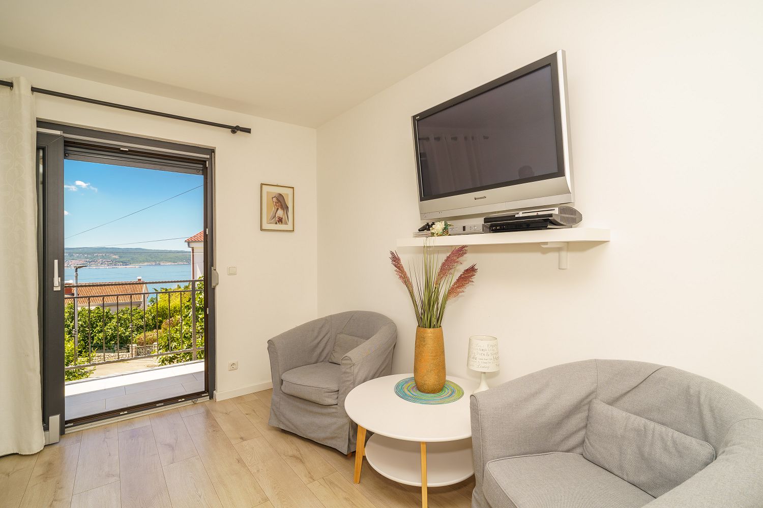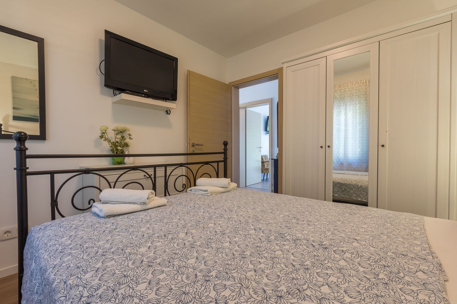 Die Wohnung ist in zwei getrennte Einheiten aufgeteilt, was für die gewünschte Privatsphäre sorgt und dennoch einen Urlaub mit seinen Liebsten ermöglicht. Die größere Einheit besteht aus einer großen Ess-/Küche, drei gemütlichen Schlafzimmern, zwei Badezimmern und einem langen Flur. Zwei der drei Schlafzimmer liegen zur Meerseite und verfügen über einen herrlichen Balkon mit Meerblick. Von der Ess-/Küche aus gelangt man zur großen Terrasse, über die man zur kleineren Wohneinheit kommt. Diese besteht aus einem Wohn-/Esszimmer mit Küche, einem Schlafzimmer und einem Badezimmer. Sie ist nur über den gemeinsamen Eingang und die gemeinsame Terrasse erreichbar. Im Außenbereich stehen zwei Terrassen zur Verfügung. Eine befindet sich gleich vor der großen Küche und der kleineren Wohneinheit. Auf dieser überdachten Terrasse stehen ein großer Tisch mit Stühlen und ein Grill bereit. Die zweite Terrasse befindet sich eine Etage höher. Sie ist als Sonnenterrasse gedacht. Hier stehen eine Sonnenliege für zwei Personen und eine für eine Person zur Verfügung. Ein Parkplatz befindet sich auf dem Grundstück, der andere vor dem Haus.