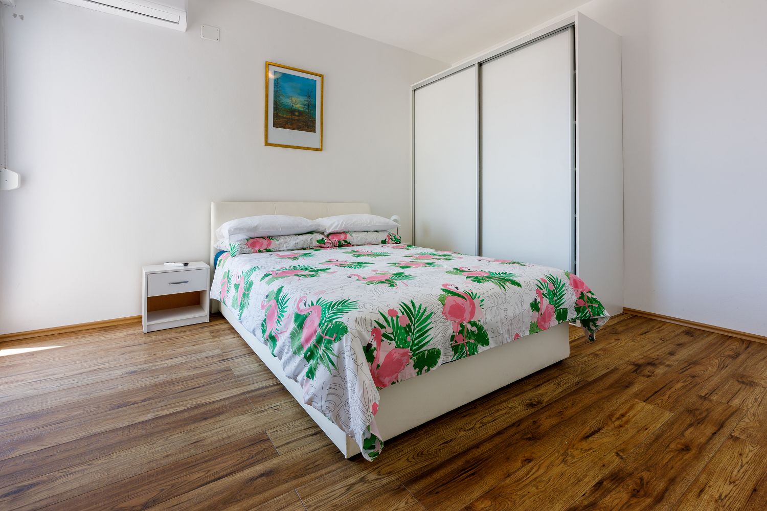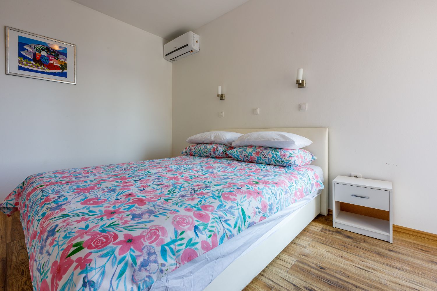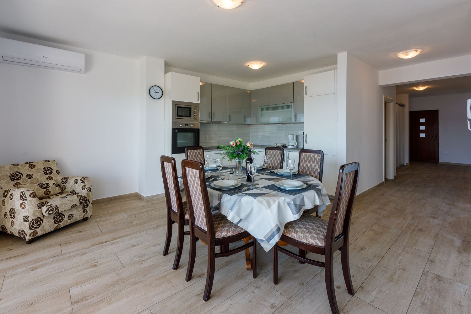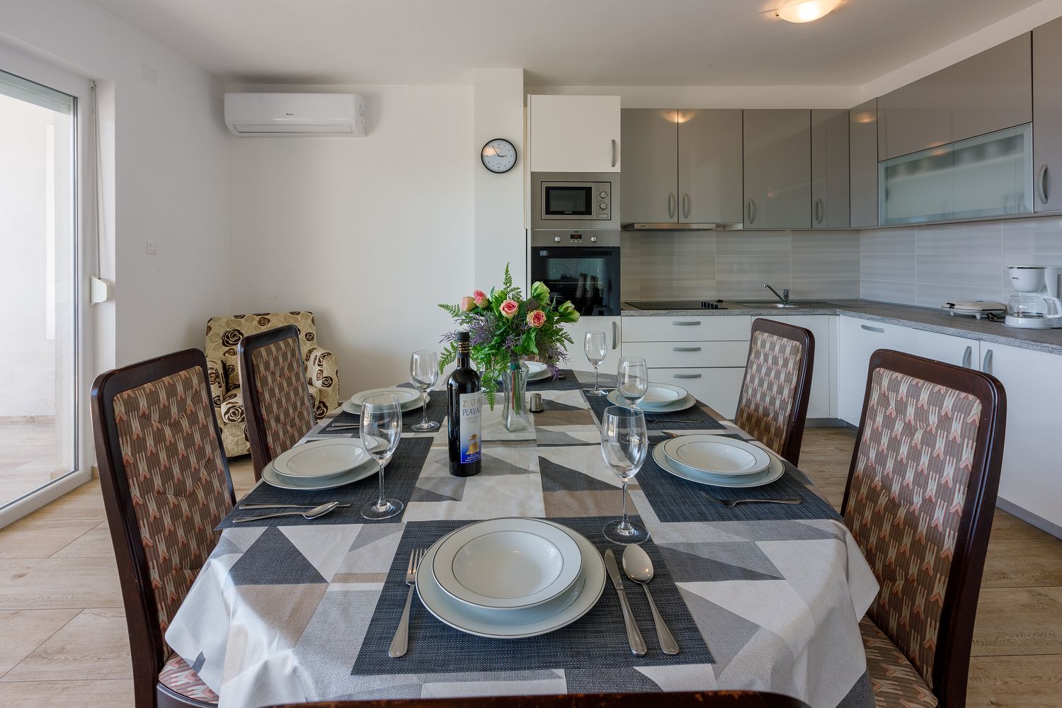 Die Unterkunft im ersten Obergeschoss des Anwesens besteht aus einer Küche mit Wohn- und Essbereich, drei Schlafzimmern, drei Badezimmern und einem eigenen Balkon. Der 20 m² große, teilweise überdachte Balkon ist möbliert. Ein Parkplatz befindet sich vor dem Haus. Des Weiteren stehen den Gästen Internet per WLAN, Satellitenfernsehen und eine Klimaanlage zur Verfügung. Vom Objekt bis zum Strand sind es 100 Meter und die Entfernung zum Zentrum beträgt 1,7 km. Das nächstgelegenste Lebensmittelgeschäft befindet sich 150 Meter von der Ferienimmobilie entfernt. In 150 Metern ist das umliegende Restaurant zu erreichen.