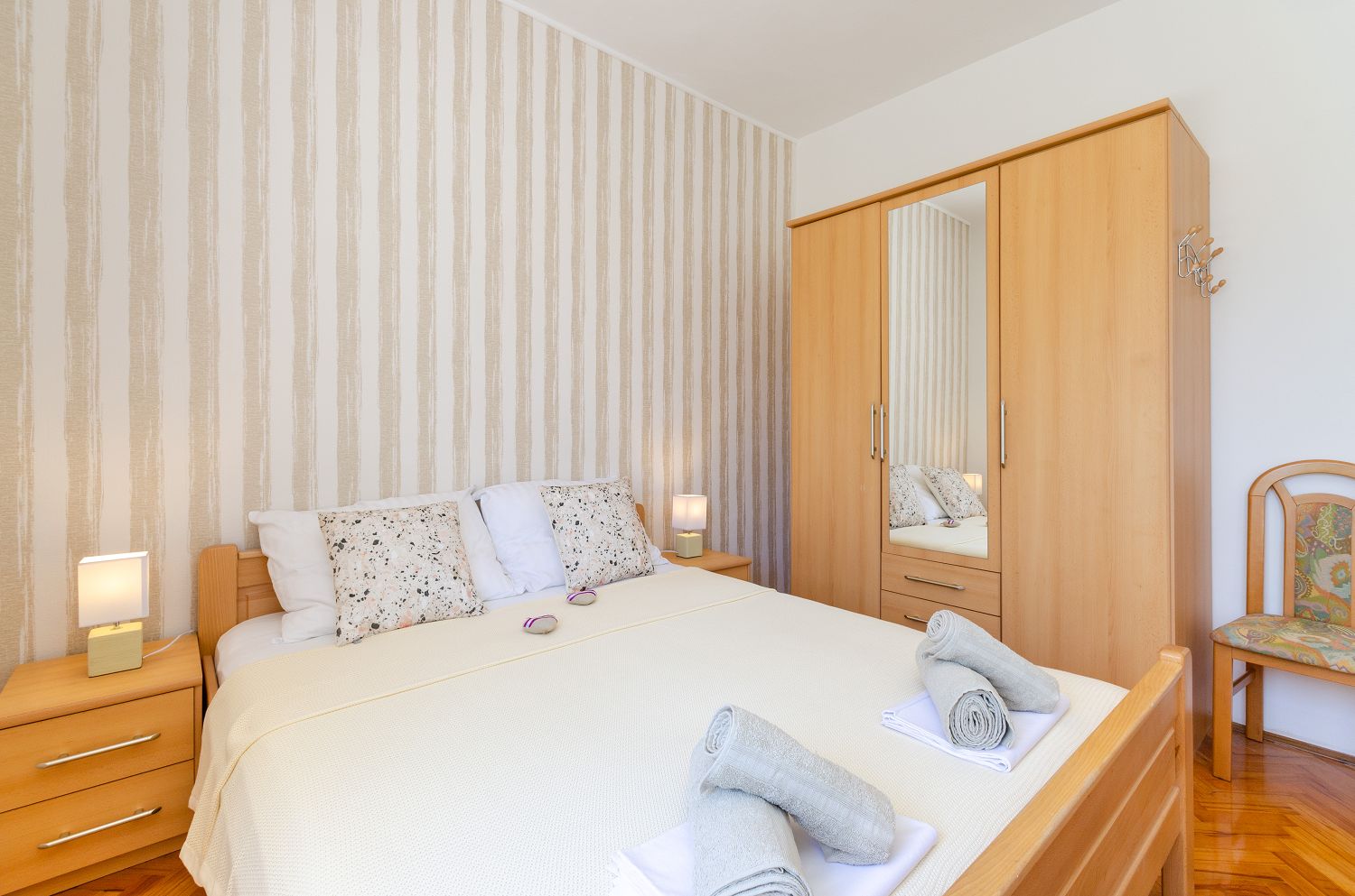 In dieser Unterkunft bilden das Wohn-/Esszimmer und die Küche einen Raum. Hier befindet sich eine Schlafcouch für eine Person. Zusätzlich gibt es ein Schlafzimmer mit einem Doppelbett sowie ein Badezimmer mit Dusche. Der Balkon ist mit einem Tisch und Stühlen ausgestattet. Vom Objekt bis zum Strand sind es 200 Meter und die Entfernung zum Zentrum beträgt 1,5 km. Das nächstgelegenste Lebensmittelgeschäft befindet sich 200 Meter von der Ferienimmobilie entfernt. In 220 Metern ist das umliegende Restaurant zu erreichen.