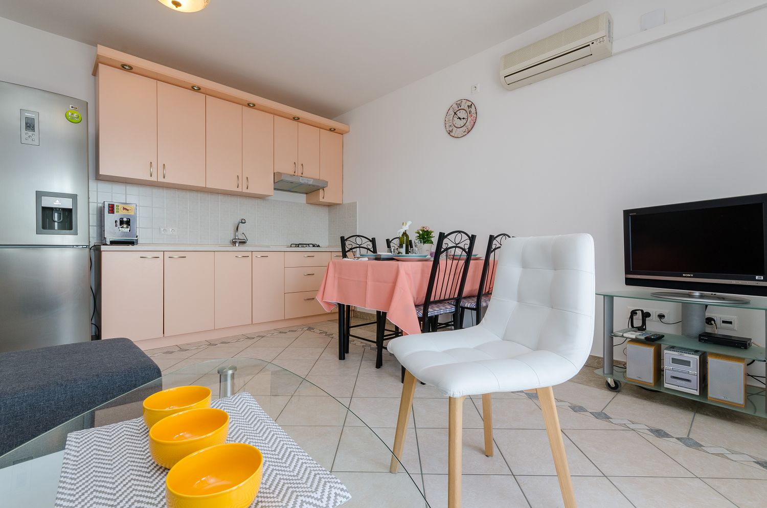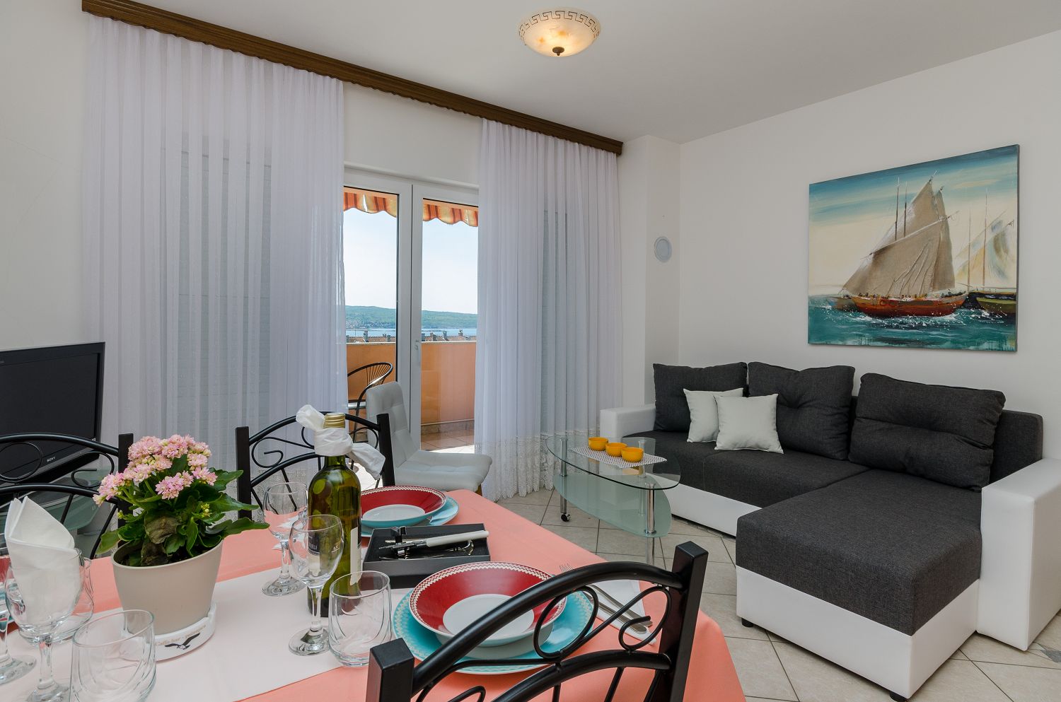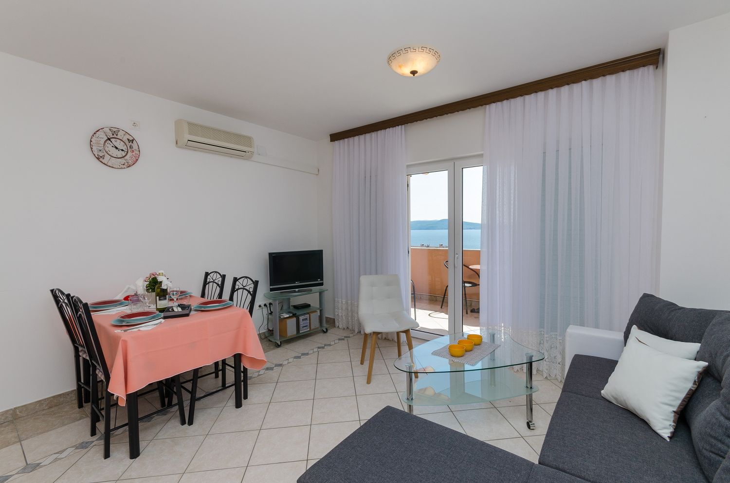 Dieses sehr gut ausgestattete Apartment befindet sich in einer ruhigen Umgebung. Es besteht aus einem gemütlichen Wohn-/Esszimmer mit Küche, einem Schlafzimmer mit Doppelbett, einem Badezimmer, einem Balkon und einem Eingangsbereich. Aus dem Wohnbereich und dem Schlafzimmer hat man einen schönen Meerblick. Vom Wohnbereich aus gelangt man direkt auf den überdachten Balkon. Die Wohnung wird mit zwei Klimaanlagen gekühlt. Eine Klimaanlage befindet sich im Schlafzimmer, die andere im Wohnbereich, in dem sich auch eine ausziehbare Schlafcouch befindet.